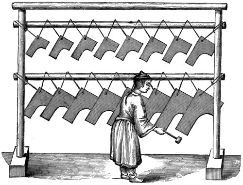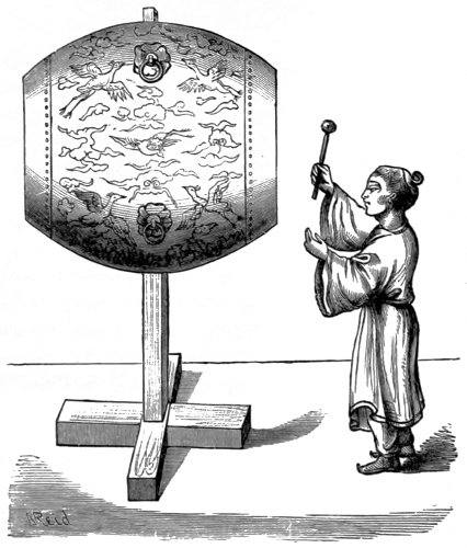 Much the same is the case with wind instruments of the trumpet kind. These are often made of the horns, bones, and tusks of animals; frequently of vegetable substances and of metal. Instruments of percussion of definite sonorousness are chiefly met with in China, Japan, Burmah, Siam, and Java. They not unfrequently contain a series of tones produced by slabs of wood or metal, which are beaten with a sort of hammer, as our harmonicon is played.