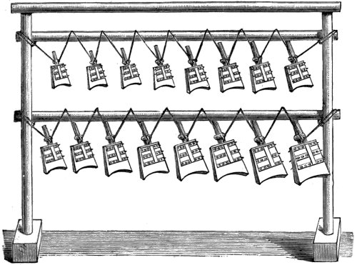 Several other well-authenticated instances could be cited in which one instrument has suggested the construction of another of a superior kind. The prototype of our pianoforte was evidently the dulcimer, known at an early time to the Arabs and Persians who call it santir. One of the old names given to the dulcimer by European nations is cimbal. The Poles at the present day call it cymbaly, and the Magyars in Hungary cimbalom. The clavicembalo, the predecessor of the pianoforte, was in fact nothing 6 but a cembalo with a key-board attached to it; and some of the old clavicembali, still preserved, exhibit the trapezium shape, the round hole in the middle of the sound-board, and other peculiarities of the first dulcimer. Again, the gradual development of the dulcimer from a rude contrivance, consisting merely of a wooden board across which a few strings are stretched, is distinctly traceable by a reference to the musical instruments of nations in different stages of civilization. The same is the case with our highly perfected harp, of which curious specimens, representing the instrument in its most primitive condition, are still to be found among several barbarous tribes. We might perhaps infer from its shape that it originally consisted of nothing more than an elastic stick bent by a string. The Damaras, a native tribe of South-western Africa, actually use their bow occasionally as a musical instrument, when they are not engaged in war or in the chase. They tighten the string nearly in the middle by means of a leathern thong, whereby they obtain two distinct sounds, which, for want of a sound-board, are of course very weak and scarcely audible to anyone but the performer. Some neighbouring tribes, however, possess a musical instrument very similar in appearance to the bow, to which they attach a gourd, hollowed and open at the top, which serves as a sound-board. Again, other African tribes have a similar instrument, superior in construction only inasmuch as it contains more than one string, and is provided with a sound-board consisting of a suitable piece of sonorous wood. In short, the more improved we find these contrivances the closer they approach our harp. And it could be shown if this were requisite for our present purpose that much the same gradual progress towards perfection, which we observe in the African harp, is traceable in the harps of several nations in different parts of the world.