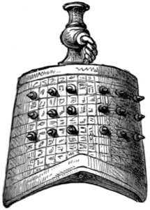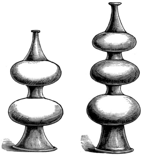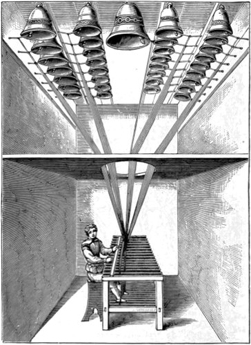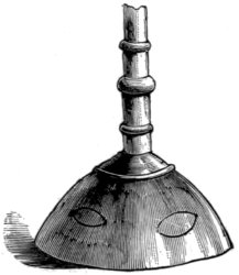 The Egyptian cymbals closely resembled our own in shape. There are two pairs of them in the British museum. One pair was found in a coffin enclosing the mummy of a sacred musician, and is deposited in the same case with the mummy and coffin. Among the Egyptian antiquities in the British museum are also several small bells of bronze. The largest is 2¼ inches in height, and the smallest three-quarters of an inch. Some of them have a hole at the side near the top wherein the clapper was fastened. 16