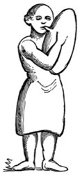 The Egyptian drum was from two to three feet in length, covered with parchment at both ends and braced by cords. The performer carried it before him, generally by means of a band over his shoulder, while he was beating it with his hands on both ends. Of another kind of drum an actual specimen has been found in the excavations made in the year 1823 at Thebes. It was 1½ feet high and 2 feet broad, and had cords for bracing it. A piece of catgut encircled each end of the drum, being wound round each cord, by means of which the cords could be tightened or slackened at pleasure by pushing the two bands of catgut towards or from each other. It was beaten with two drumsticks slightly bent. The Egyptians had also straight drumsticks with a handle, and a knob at the end. The Berlin museum possesses some of these. The third kind of drum was almost identical with the darabouka (or darabukkeh) of the modern Egyptians. The Tambourine was either round, like that which is at the present time in use in Europe as well as in the east; or it was of an oblong square shape, slightly incurved on the four sides.