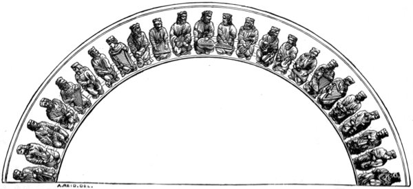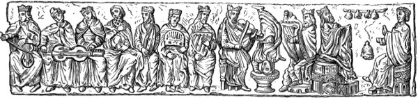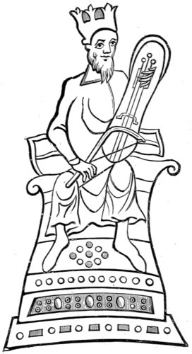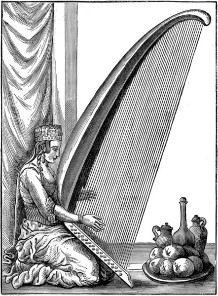 Instrumental music was used by the Assyrians and Babylonians in their religious observances. This is obvious from the sculptures, and is to some extent confirmed by the mode of worship paid by command of king Nebuchadnezzar to the golden image: “Then an herald cried aloud, To you it is commanded, O people, nations, and languages, that at what time ye hear the sound of the cornet, flute, harp, sackbut, psaltery, dulcimer, and all kinds of musick, ye fall down and worship the golden image that Nebuchadnezzar the king hath set up.” The kings appear to have maintained at their courts musical bands, whose office it was to perform secular music at certain times of the day or on fixed occasions. Of king Darius we are told that, when he had cast Daniel into the den of lions, he “went to his palace, and passed the night fasting, neither were instruments of musick brought before him;” from which we may conclude that his band was in 19 the habit of playing before him in the evening. A similar custom prevailed also at the court of Jerusalem, at least in the time of David and Solomon; both of whom appear to have had their royal private bands, besides a large number of singers and instrumental performers of sacred music who were engaged in the Temple.