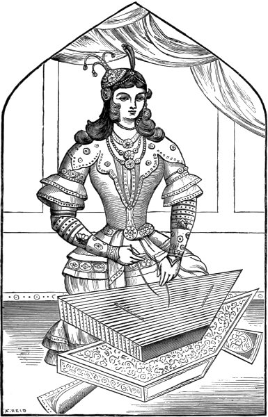 The dulcimer is in too imperfect a state on the bas-relief to familiarize us with its construction. The slab representing the procession in which it occurs has been injured; the defect which extended over a portion of the dulcimer has been repaired, and it cannot be said that in repairing it much musical knowledge has been evinced.