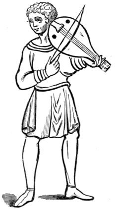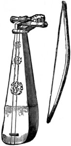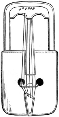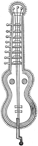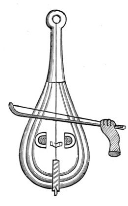 Stringed instruments without a finger board, or any similar contrivance which enables the performer to produce a number of different tones on one string, are generally found among nations whose musical accomplishments have emerged from the earliest state of infancy. The strings are twanged with the fingers or with a piece of wood, horn, metal, or any other suitable substance serving as a plectrum; or are made to vibrate by being beaten with a hammer, as our dulcimer. Stringed instruments provided with a finger-board on which different tones are producible on one string by the performer shortening it more or less,—as on the guitar and violin,—are met with almost exclusively among nations in a somewhat advanced stage of musical progress. Such as are played with a bow are the least common; they are, however, known to the Chinese, Japanese, Hindus, Persians, Arabs, and a few other nations, besides those of Europe and their descendants in other countries.