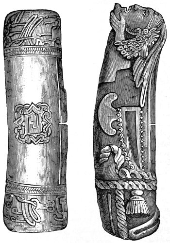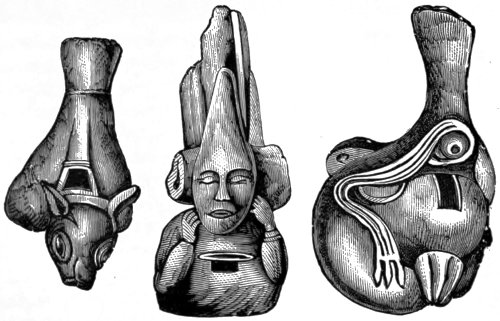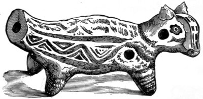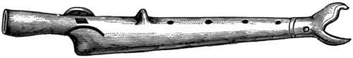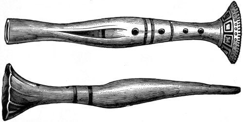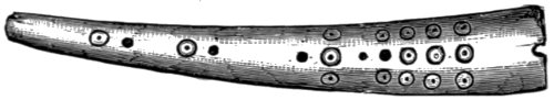 M. Lartet surmises the perforated bone to have been used as a whistle in hunting animals. It is the first digital phalanx of a ruminant, drilled to a certain depth by a smooth cylindrical bore on its lower surface near the expanded upper articulation. On 10 applying it to the lower lip and blowing into it a shrill sound is yielded. Three of these phalanges are of reindeer, one is of Chamois. Again, among the relics which have been brought to light from the cave of Lombrive, in the department of Ariège, occur several eye-teeth of the dog which have a hole drilled into them near the root. Probably they also yield sounds like those reindeer bones, or like the tube of a key. Another whistle—or rather a pipe, for it has three finger-holes by means of which different tones could be produced—was found in a burying-place, dating from the stone period, in the vicinity of Poitiers in France: it is rudely constructed from a fragment of stag’s-horn. It is blown at the end, like a flûte à bec and the three finger-holes are placed equidistantly. Four distinct tones must have been easily obtainable on it: the lowest, when all the finger-holes were covered; the other three, by opening the finger-holes successively. From the character of the stone utensils and weapons discovered with this pipe it is conjectured that the burying-place from which it was exhumed dates from the latest time of the stone age. Therefore, however old it may be, it is a more recent contrivance than the reindeer-bone whistle from the cavern of the Dordogne.