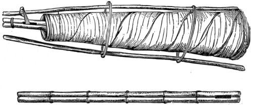 14The Double-Pipe, called mam, appears to have been a very popular instrument, if we judge from the frequency of its occurrence in the representations of musical performances. Furthermore, the Egyptians had, as far as is known to us, two kinds of trumpets; three kinds of tambourines, or little hand drums; three kinds of drums, chiefly barrel-shaped; and various kinds of gongs, bells, cymbals, and castanets. The trumpet appears to have been usually of brass. A peculiar wind-instrument, somewhat the shape of a champagne bottle and perhaps made of pottery or wood, occurs only once in the representations transmitted to us.