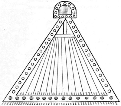 The Assyrian harp was about four feet high, and appears of larger size than it actually was on account of the ornamental appendages which were affixed to the lower part of its frame. It must have been but light in weight, since we find it not unfrequently represented in the hands of persons who are playing upon it while they are dancing. Like all the Oriental harps, modern as well as ancient, it was not provided with a front pillar. The upper portion of the frame contained the sound-holes, somewhat in the shape of an hour-glass. Below them were the screws, or tuning-pegs, arranged in regular order. The strings were perhaps made of silk, like those which the Burmese use at the present time on their harps; or they may have been of catgut, which was used by the ancient Egyptians.