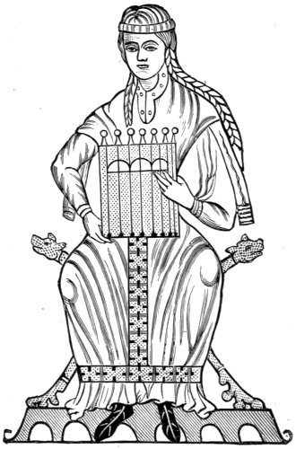 The Lyre. This instrument is represented on some Hebrew coins generally ascribed to Judas Maccabæus, who lived in the second century before the Christian era. There are several of them 20 in the British museum; some are of silver, and the others of copper. On three of them are lyres with three strings, another has one with five, and another one with six strings. The two sides of the frame appear to have been made of the horns of animals, or they may have been of wood formed in imitation of two horns which originally were used. Lyres thus constructed are still found in Abyssinia. The Hebrew square-shaped lyre of the time of Simon Maccabæus is probably identical with the psalterion. The kinnor, the favourite instrument of king David, was most likely a lyre if not a small triangular harp. The lyre was evidently an universally known and favoured instrument among ancient eastern nations. Being more simple in construction than most other stringed instruments it undoubtedly preceded them in antiquity. The kinnor is mentioned in the Bible as the oldest stringed instrument, and as the invention of Jubal. Even if the name of one particular stringed instrument is here used for stringed instruments in general, which may possibly be the case, it is only reasonable to suppose that the oldest and most universally known stringed instrument would be mentioned as a representative of the whole class rather than any other. Besides, the kinnor was a light and easily portable instrument; king David, according to the Rabbinic records, used to suspend it during the night over his pillow. All its uses mentioned in the Bible are especially applicable to the lyre. And the resemblance of the word kinnor to kithara, kissar, and similar names known to denote the lyre, also tends to confirm the supposition that it refers to this instrument. It is, however, not likely that the instruments of the Hebrews—indeed their music altogether—should have remained entirely unchanged during a period of many centuries. Some modifications were likely to occur even from accidental causes; such, for instance, as the influence of neighbouring nations when the Hebrews came into closer contact with them. Thus may be explained why the accounts of the Hebrew instruments given by Josephus, who lived in the first century of the 21 Christian era, are not in exact accordance with those in the Bible. The lyres at the time of Simon Maccabæus may probably be different from those which were in use about a thousand years earlier, or at the time of David and Solomon when the art of music with the Hebrews was at its zenith.