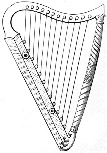 The Egyptian harps most remarkable for elegance of form and elaborate decoration are the two which were first noticed by Bruce, who found them painted in fresco on the wall of a sepulchre at Thebes, supposed to be the tomb of Rameses III. who reigned about 1250 B.C. Bruce’s discovery created sensation among the musicians. The fact that at so remote an age the Egyptians should have possessed harps which vie with our own in elegance and beauty of form appeared to some so incredible that the correctness of Bruce’s representations, as engraved in his “Travels,” was greatly doubted. Sketches of the same harps, taken subsequently and at different times from the frescoes, have since been published, but they differ more or less from each other in appearance and in the number of strings. A kind of triangular harp of the Egyptians was discovered in a well-preserved condition and is now deposited in the Louvre. It has twenty-one strings; a greater number than is generally represented on the monuments. All these instruments, however much they differed from each other in form, had one peculiarity in common, namely the absence of the fore pillar.