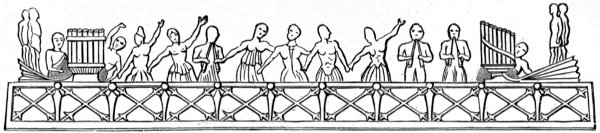 The largest assemblage of Assyrian musicians which has been discovered on any monument consists of eleven performers upon instruments, besides a chorus of singers. The first musician—probably the leader of the band, as he marches alone at the head of the procession—is playing upon a harp. Behind him are two men; one with a dulcimer and the other with a double-pipe: then follow two men with harps. Next come six female musicians, 17 four of whom are playing upon harps, while one is blowing a double-pipe and another is beating a small hand-drum covered only at the top. Close behind the instrumental performers are the singers, consisting of a chorus of females and children. They are clapping their hands in time with the music, and some of the musicians are dancing to the measure. One of the female singers is holding her hand to her throat in the same manner as the women in Syria, Arabia, and Persia are in the habit of doing at the present day when producing, on festive occasions, those peculiarly shrill sounds of rejoicing which have been repeatedly noticed by travellers.