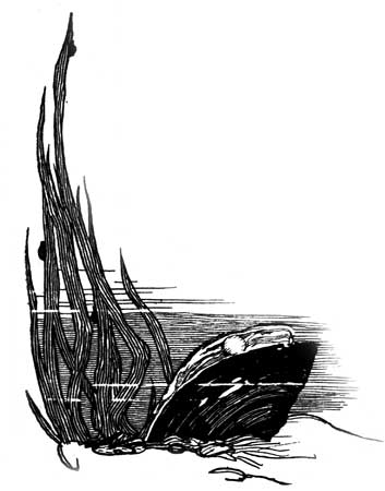 And there were lots of ducks quacking and lots of small birds who flew out of their hiding-places in terror. Great ugly dogs, with their tongues hanging out of their mouths, swam round and barked. The leaves of the water-lily dived right under the water and the spear-wort disappeared entirely and never came back again.