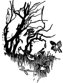 All the birds had flown, except the chaffinch and a few others, who hopped about and managed as best they could. The flies were all gone and the dragon-flies and spiders and midges and butterflies and all the rest. There were only a few grumpy fish left in the pond.