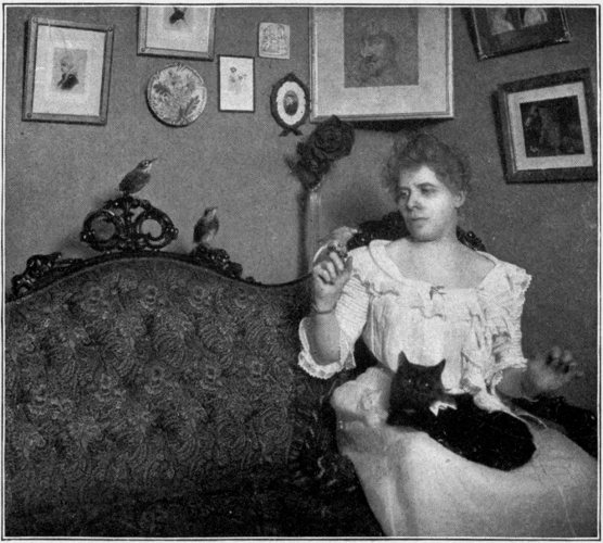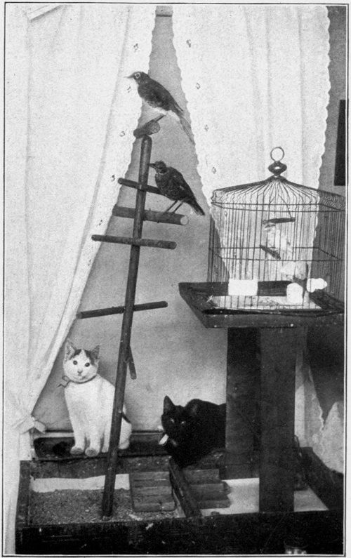But to go back to the picture, that was a day long to be remembered. When I asked the photographer to take it, he looked at me as if he thought I had just escaped from a lunatic hospital, and said: “I can take a picture of a bird or a cat, 161 but to take one of birds and cats together, I think it would be quite impossible.” I was determined if possible to have the picture taken, so said: “But you do not know me, my cats, or my birds.”