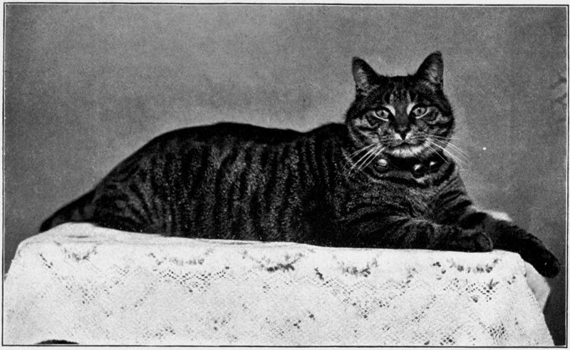 Taffy is the largest tiger cat I have ever seen, and, as he has the crook in his tail, he belongs to the tabby breed. Taffy is very large, usually weighing fourteen pounds, but he has a very small head and very small, finely shaped paws. The under parts of them look like black velvet. In colour he is mostly jet-black, and 37 the other fur, very much like a raccoon’s, light tan at the ends, shading into yellow, then into drab. As the sun strikes him, every hair seems full of light, and he is one mass of iridescent colours. His marking is most beautiful. The top of his head is black, branching out into five narrow black stripes down his neck, a black stripe three inches wide (without one light hair) going all the way down the back and to the end of the tail and under; of course, on the tail the stripe is much narrower. Then narrow black stripes go down each side of his back and tail. His tail is not long, but very bushy, like a nice boa. I never saw more exquisite colouring and marking than Taffy has underneath, from his throat to his tail. His coat is beautifully soft and thick, and shines like satin, and his eyes are very green. He is particular about his toilet, but insists upon my helping him to keep it glossy. His own comb is kept on my dressing-table, and he asks 38 me to comb him twice a day, and sometimes oftener.