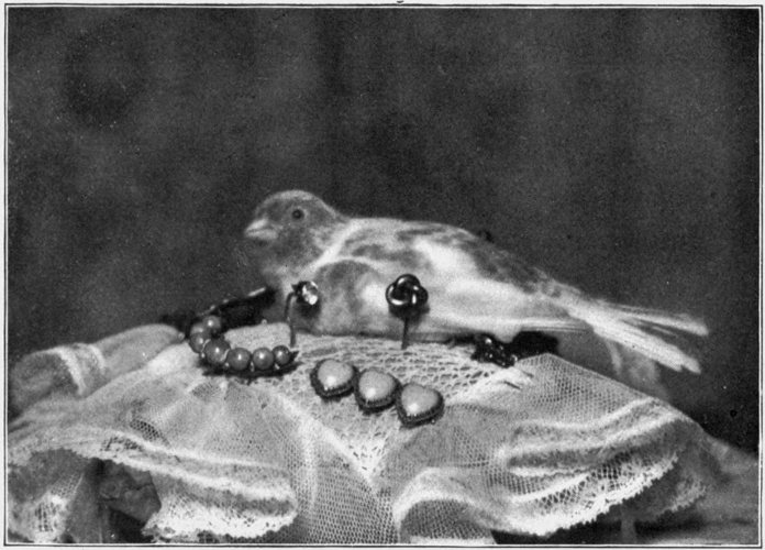 One day a little girl three years old came to visit me. As she stood in the door looking at the birds, she certainly looked like a fairy direct from Fairyland, all dressed in white, with the whitest skin, cheeks like the pinkest roses, blue eyes like wood-violets, and curls like the 166 brightest of gold. But Bobbinette and Bobby did not appreciate the picture, for they never were more frightened in their lives, and it was hours before they became used to her.