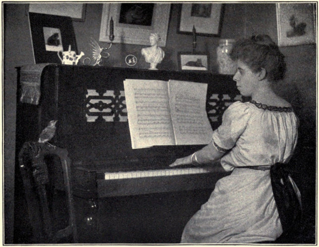 No doubt, long ere this, my readers have been wondering what kind of a bird Little Billee was, but that is a question which has not yet been answered. But I loved Little Billee so dearly that it made little difference to me what his nationality 25 was, or whether his ancestors came over in the Mayflower, fought in the American Revolution, or whether, like Topsy, he “just growed.” It was amusing to see Little Billee the first time he heard the piano. One morning two friends came to see me, and, while one of them played, I lay on the sofa with Little Billee cuddled up on my neck. At first he was very much afraid, and did not know what to make of the music. Soon he became charmed, and craned his little neck way out, opened his bill, as if he were drinking in the sound, then reached around, kissed me in the mouth, snuggled down again for a few minutes, and repeated it as long as she played.