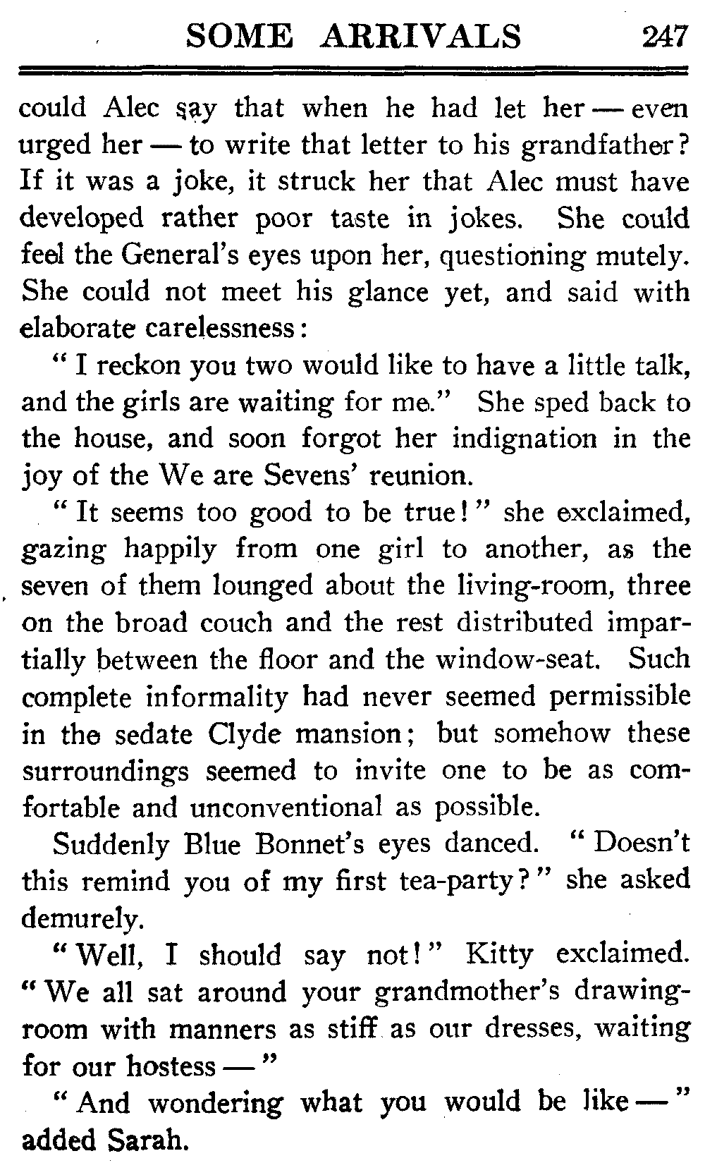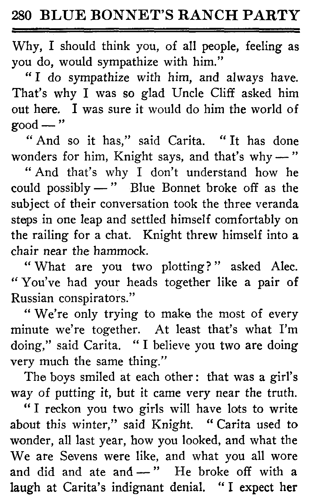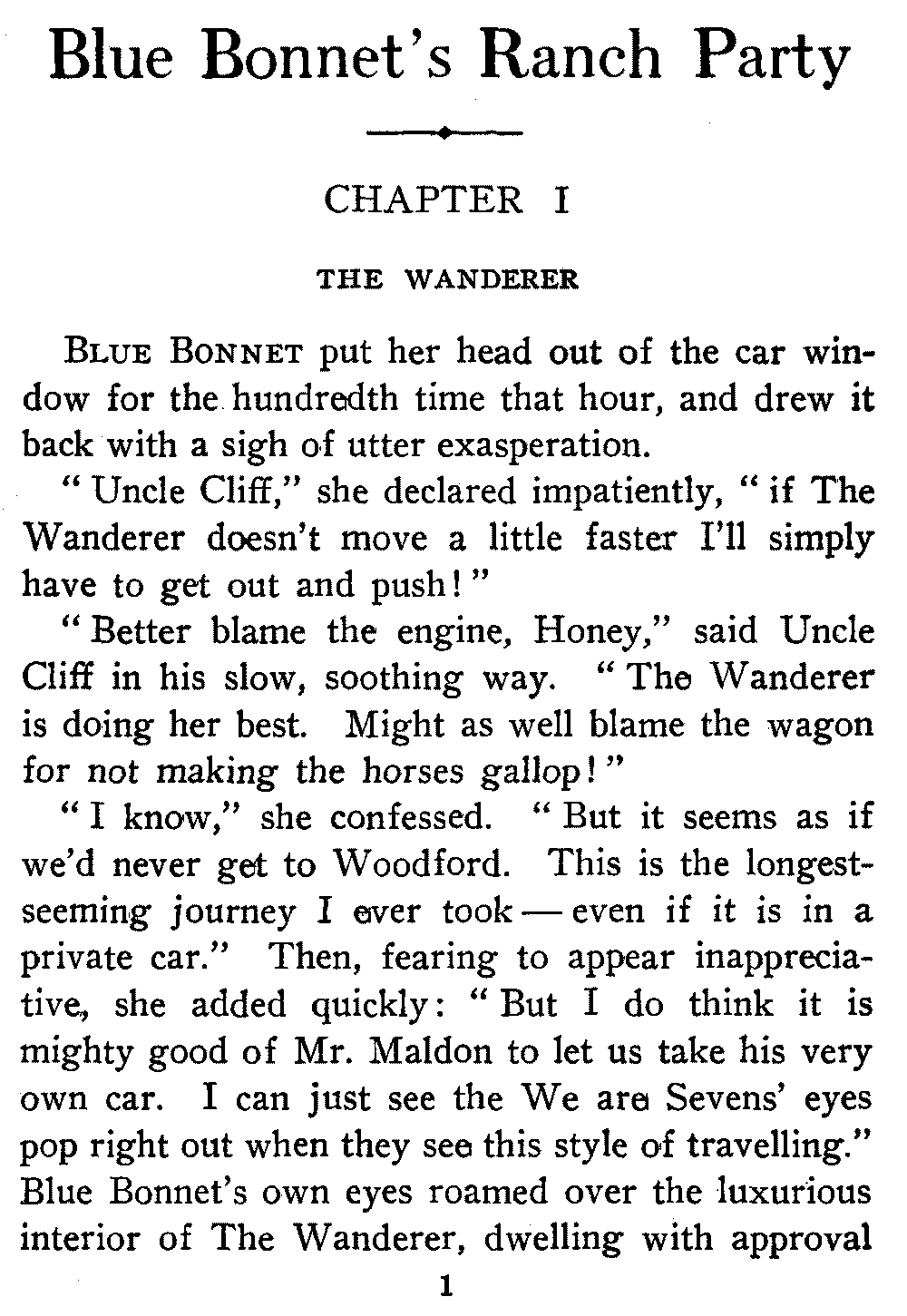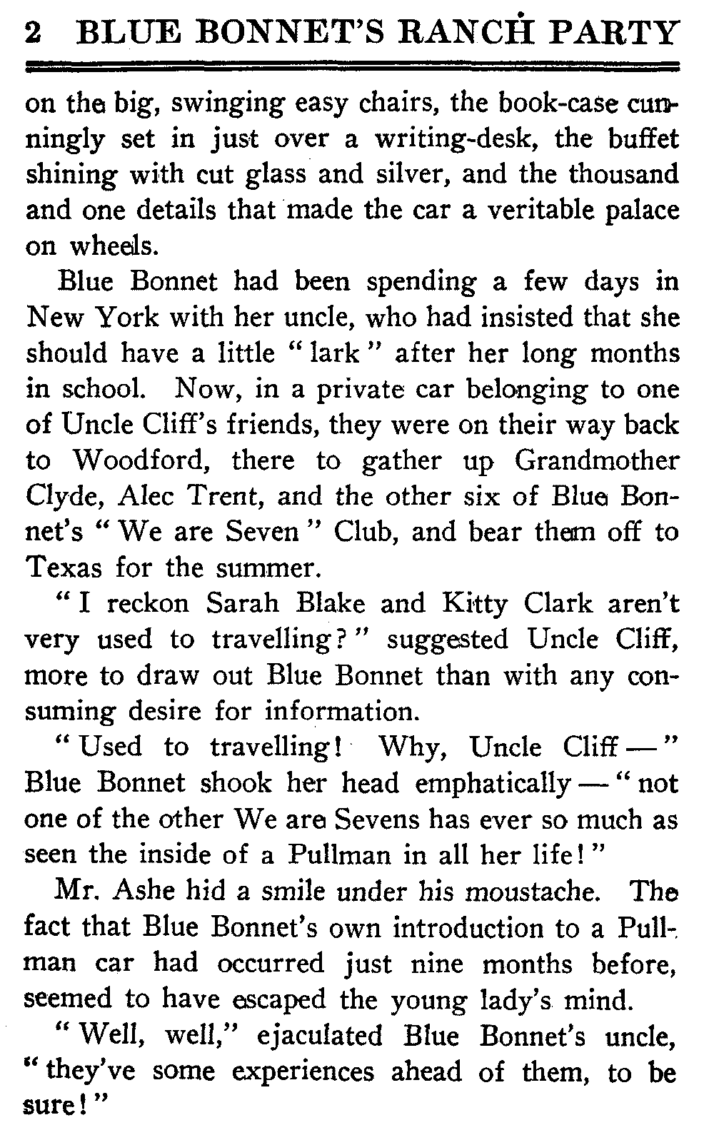 Blue Bonnet had been spending a few days in New York with her uncle, who had insisted that she should have a little "lark" after her long months in school. Now, in a private car belonging to one of Uncle Cliff's friends, they were on their way back to Woodford, there to gather up Grandmother Clyde, Alec Trent, and the other six of Blue Bonnet's "We are Seven" Club, and bear them off to Texas for the summer.