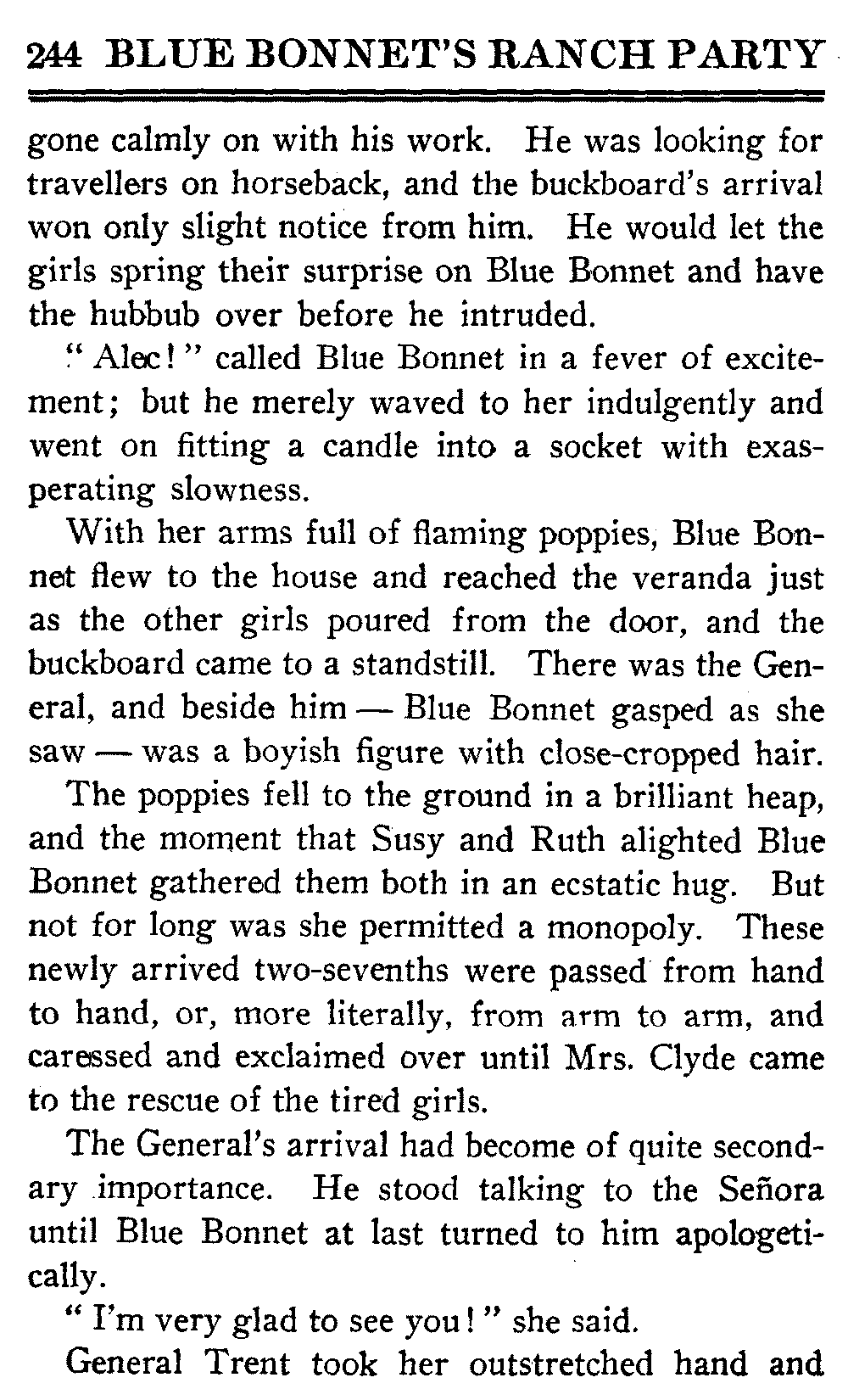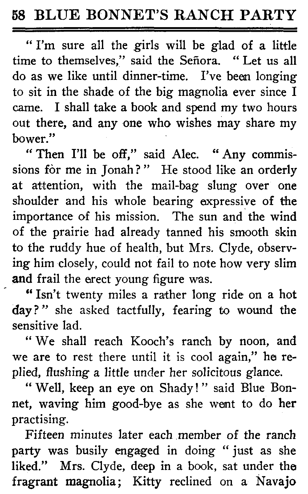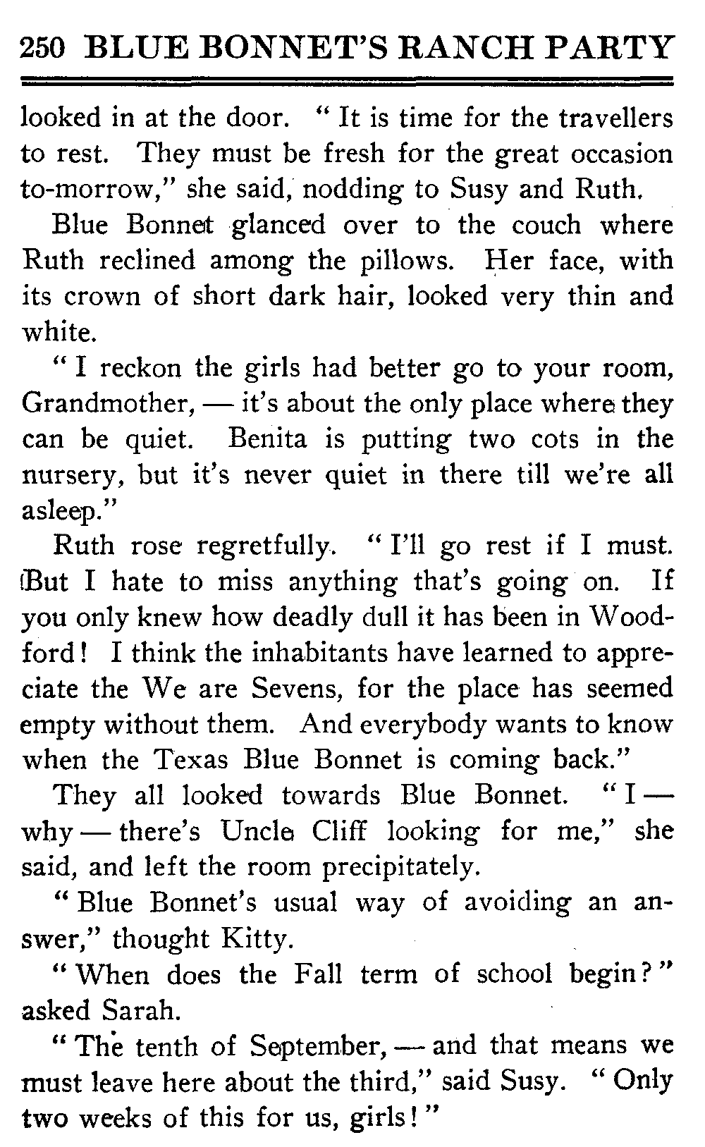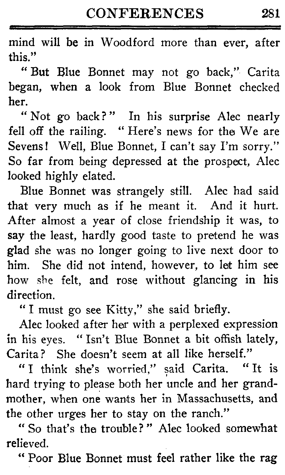 Blue Bonnet had been spending a few days in New York with her uncle, who had insisted that she should have a little "lark" after her long months in school. Now, in a private car belonging to one of Uncle Cliff's friends, they were on their way back to Woodford, there to gather up Grandmother Clyde, Alec Trent, and the other six of Blue Bonnet's "We are Seven" Club, and bear them off to Texas for the summer.