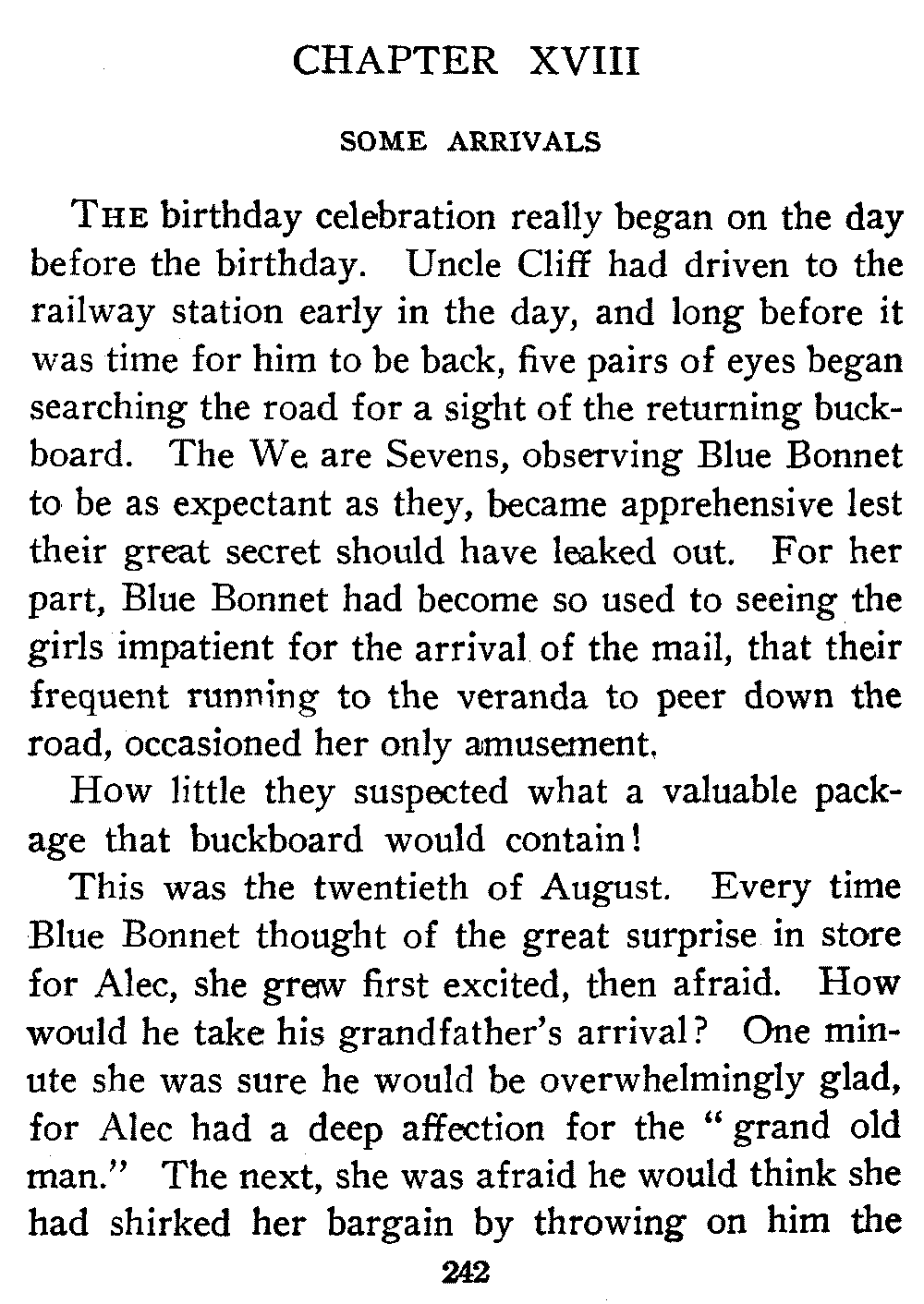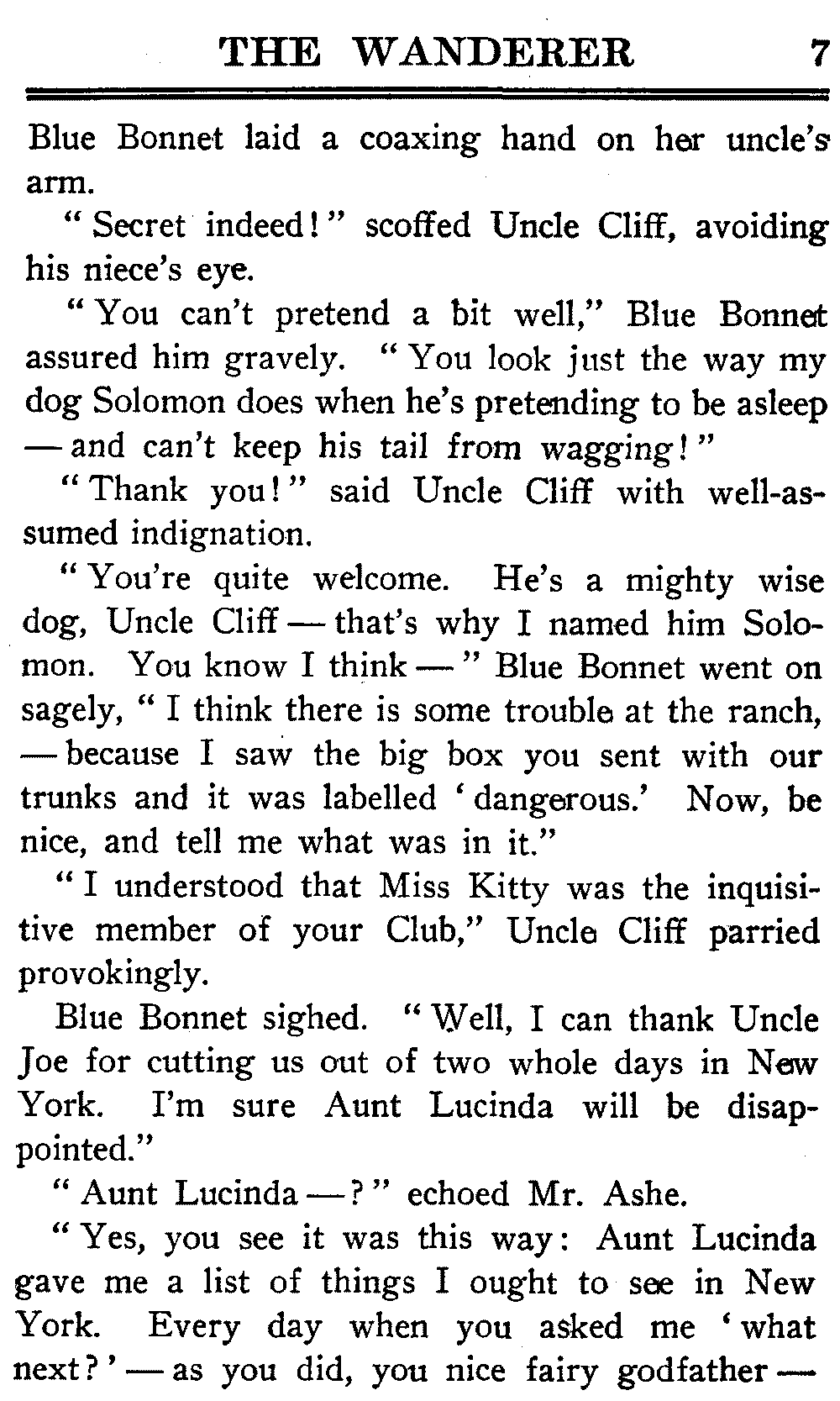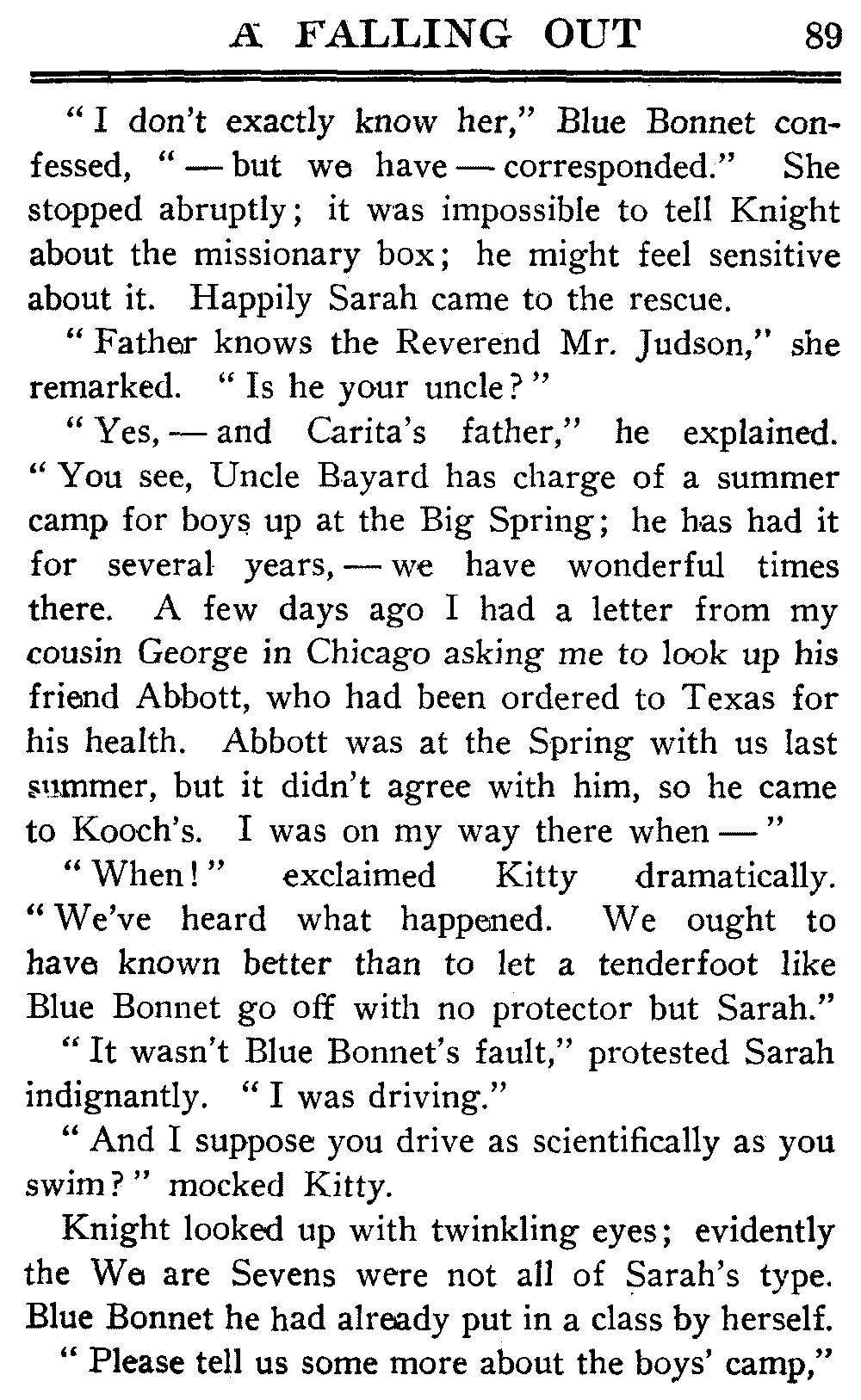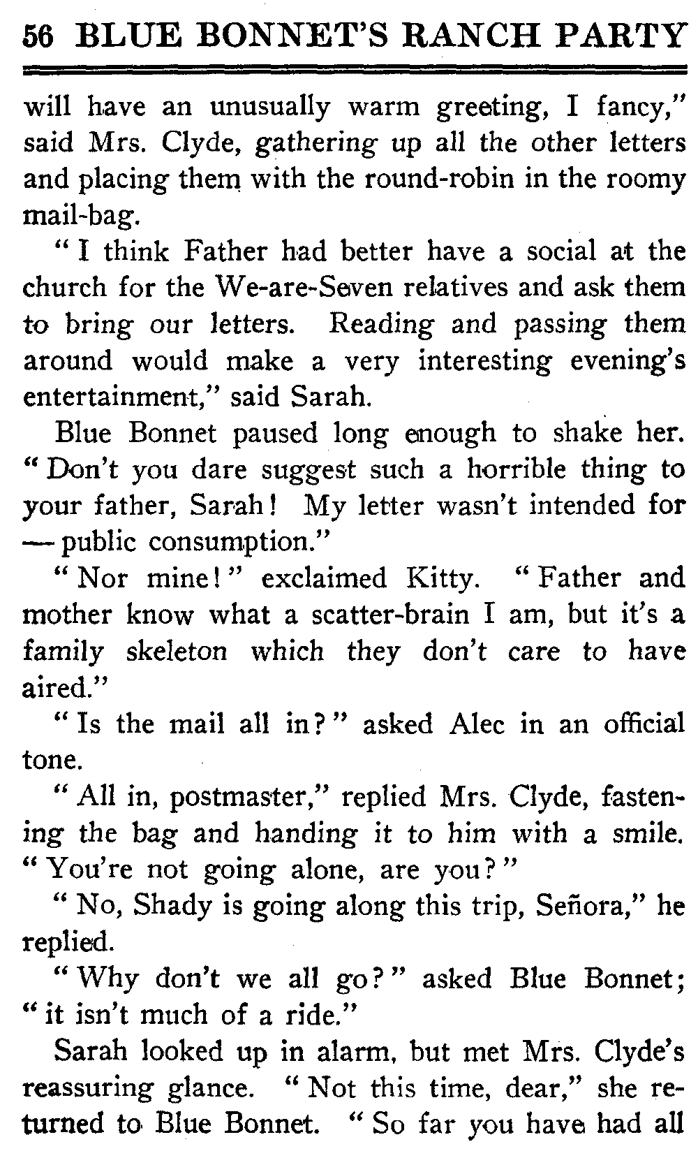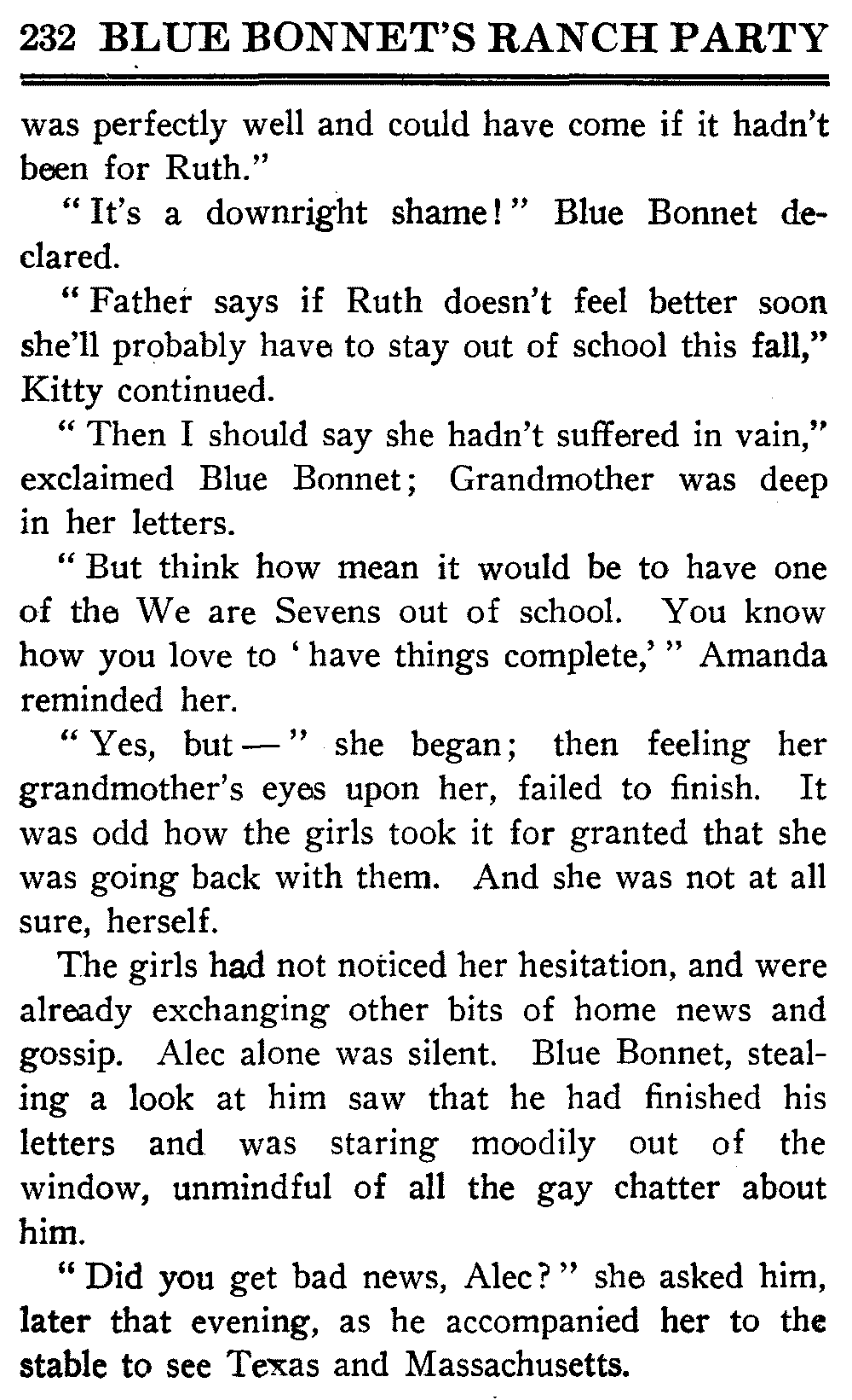 Blue Bonnet had been spending a few days in New York with her uncle, who had insisted that she should have a little "lark" after her long months in school. Now, in a private car belonging to one of Uncle Cliff's friends, they were on their way back to Woodford, there to gather up Grandmother Clyde, Alec Trent, and the other six of Blue Bonnet's "We are Seven" Club, and bear them off to Texas for the summer.