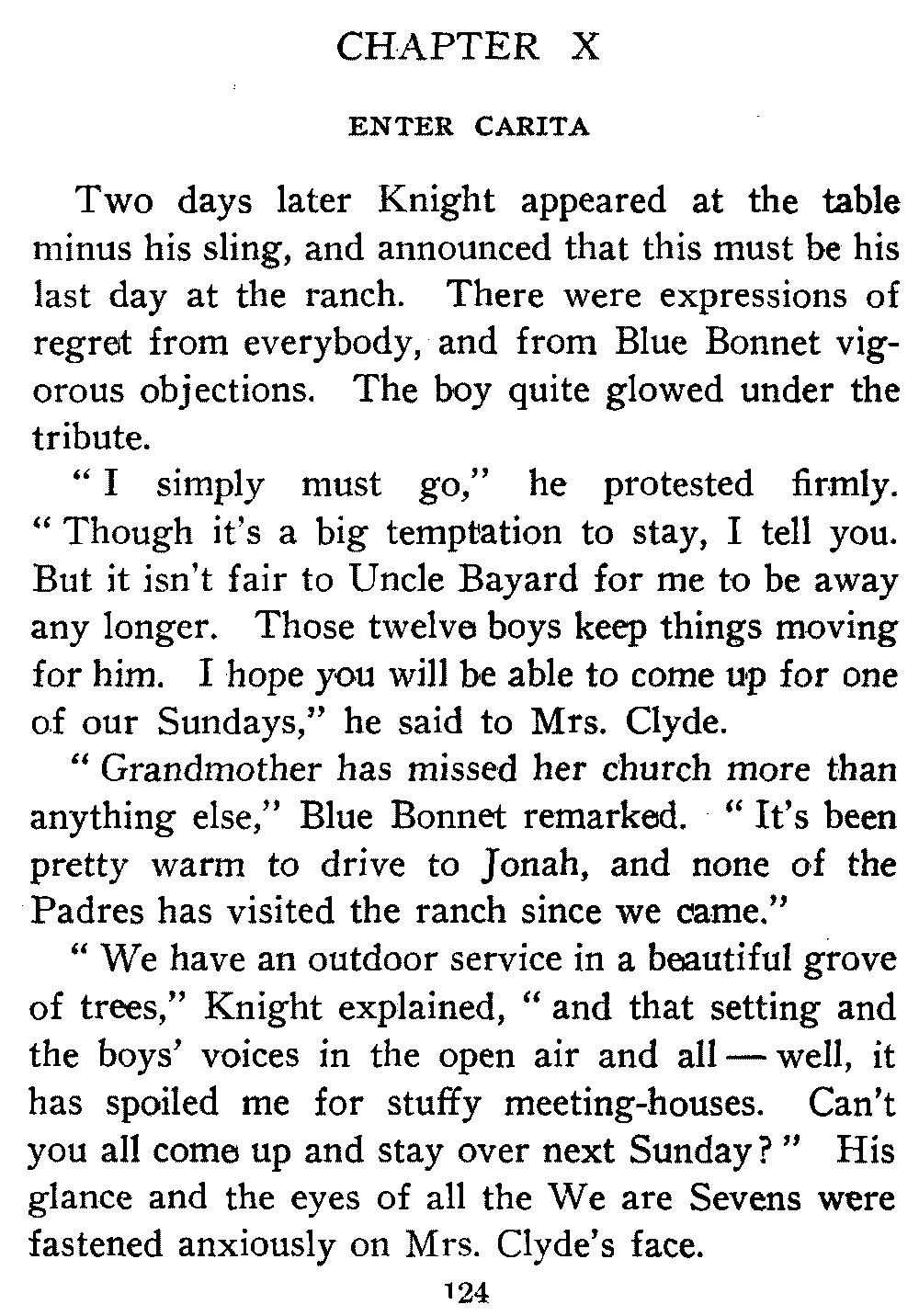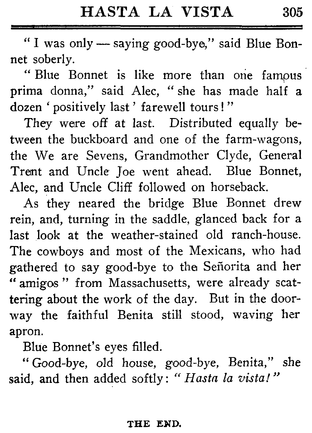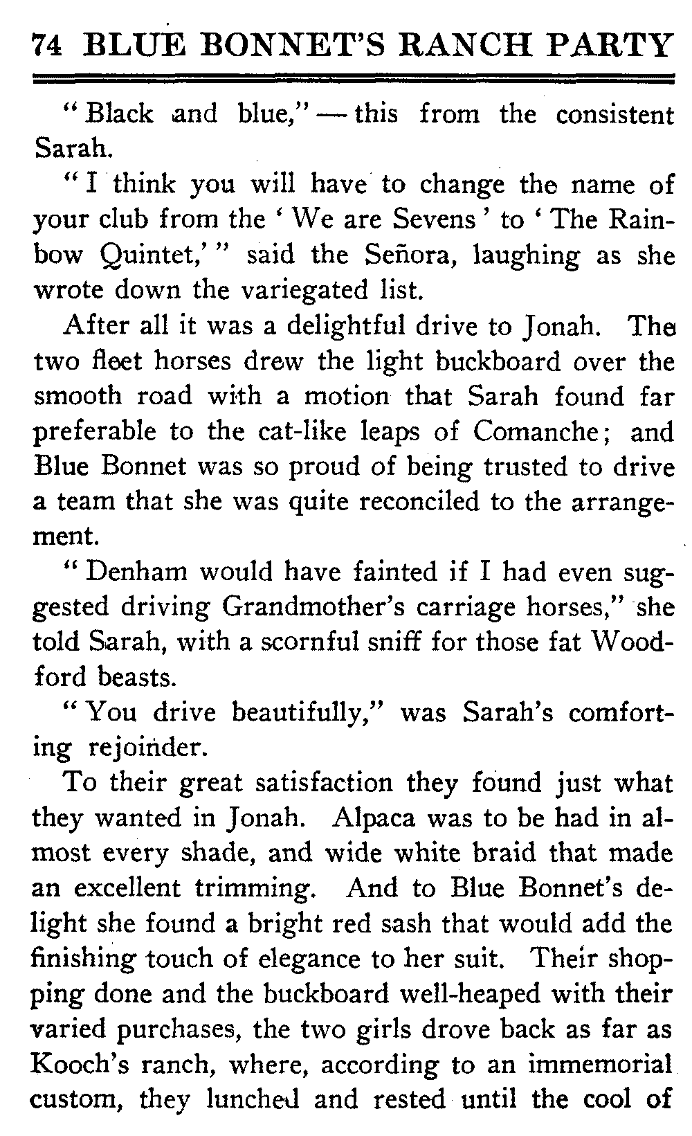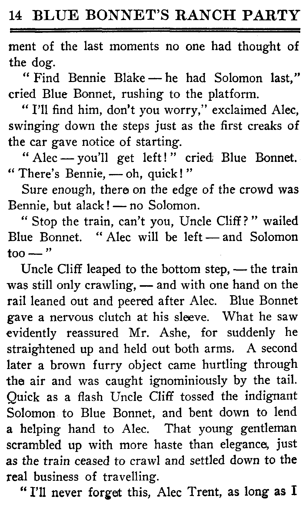 Blue Bonnet had been spending a few days in New York with her uncle, who had insisted that she should have a little "lark" after her long months in school. Now, in a private car belonging to one of Uncle Cliff's friends, they were on their way back to Woodford, there to gather up Grandmother Clyde, Alec Trent, and the other six of Blue Bonnet's "We are Seven" Club, and bear them off to Texas for the summer.