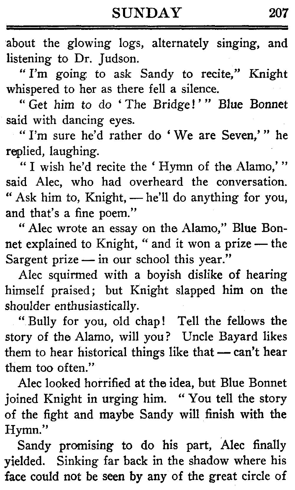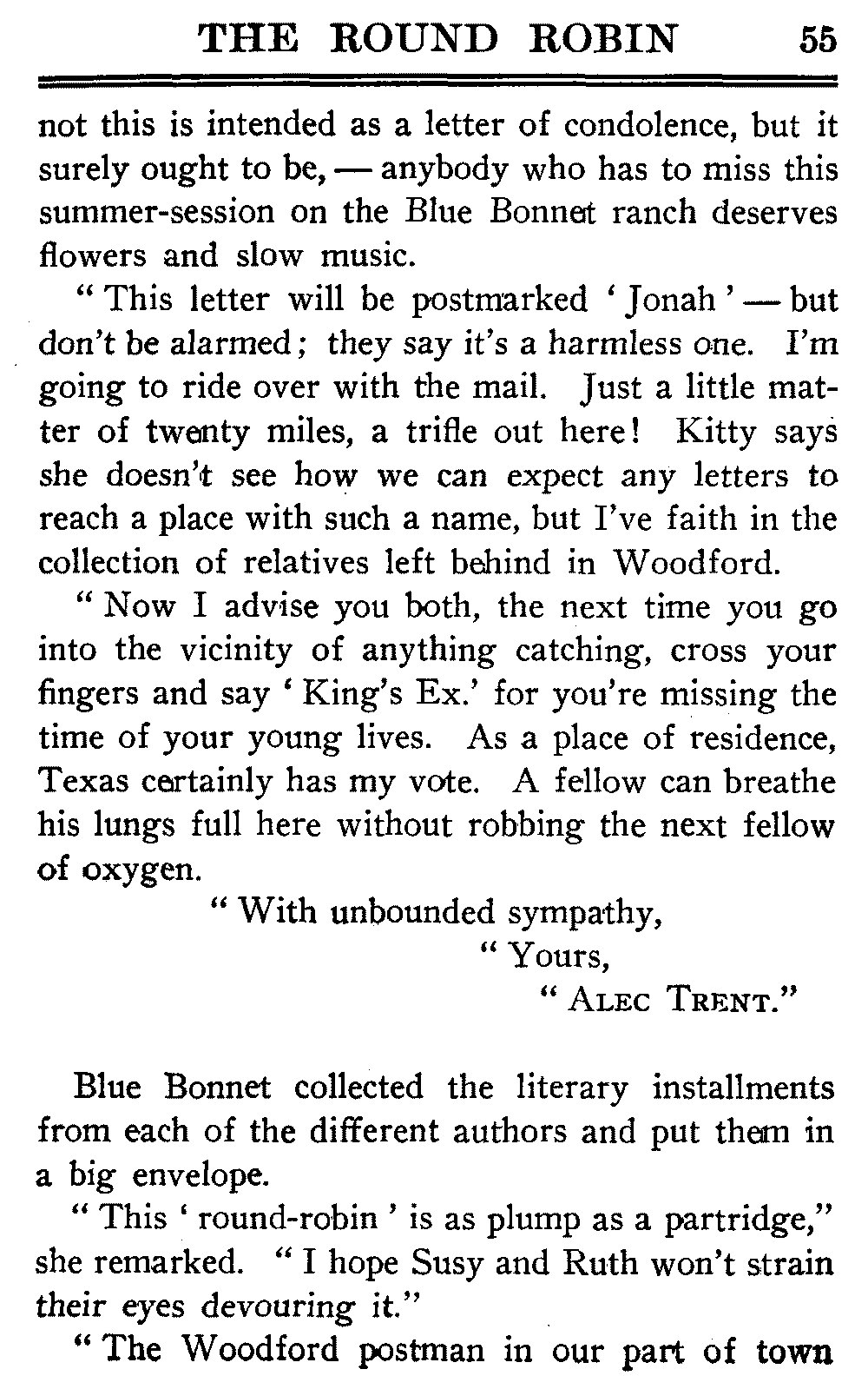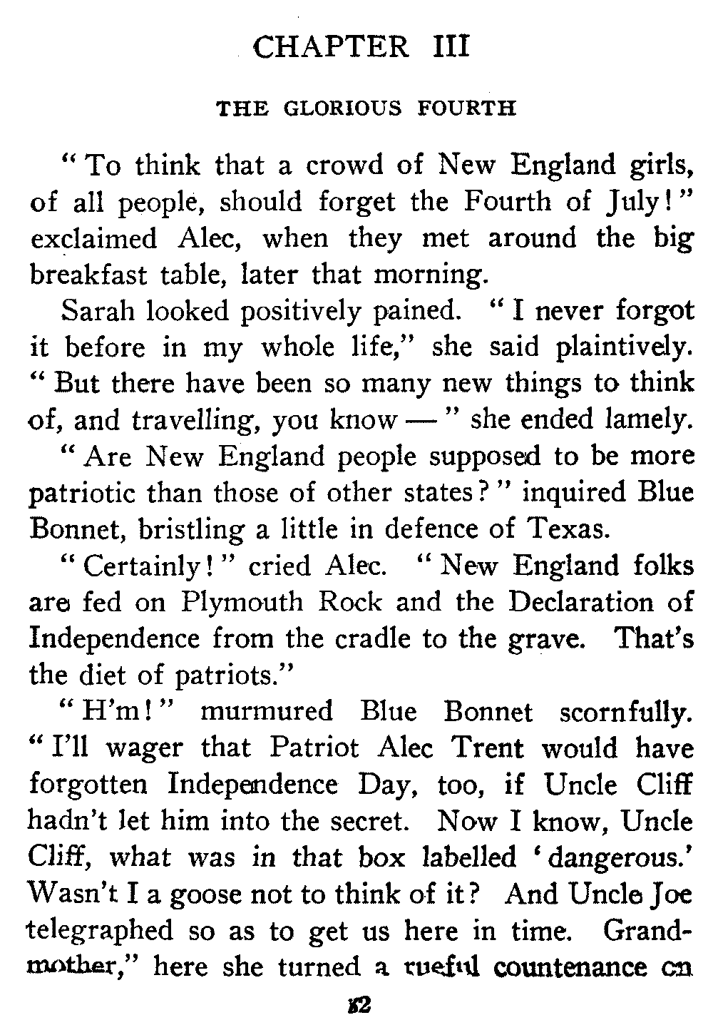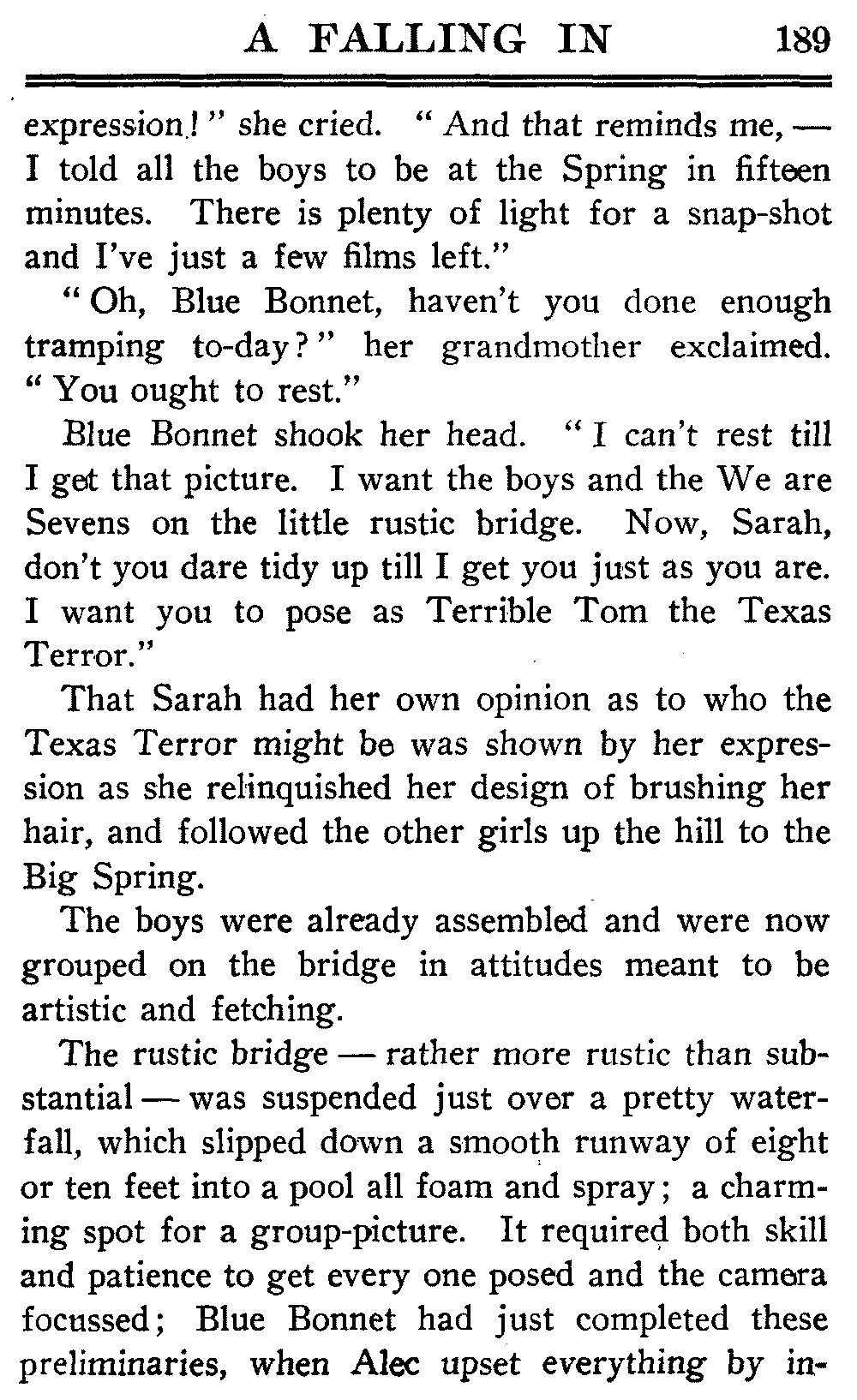 Blue Bonnet had been spending a few days in New York with her uncle, who had insisted that she should have a little "lark" after her long months in school. Now, in a private car belonging to one of Uncle Cliff's friends, they were on their way back to Woodford, there to gather up Grandmother Clyde, Alec Trent, and the other six of Blue Bonnet's "We are Seven" Club, and bear them off to Texas for the summer.