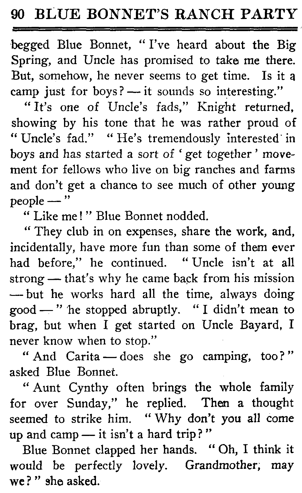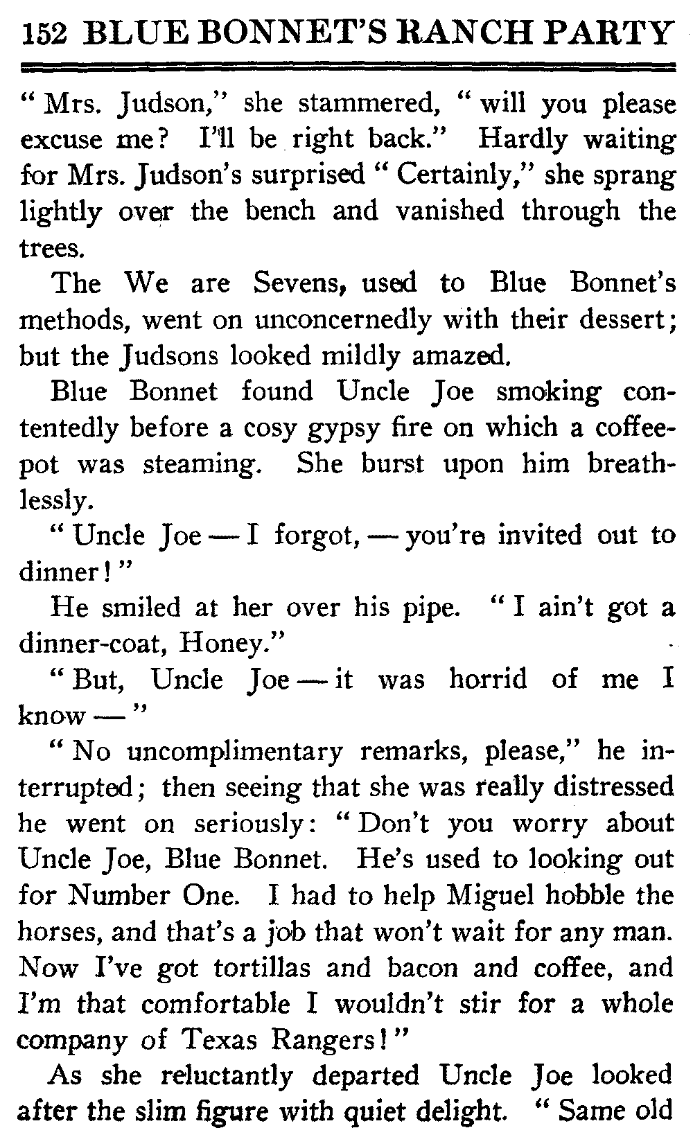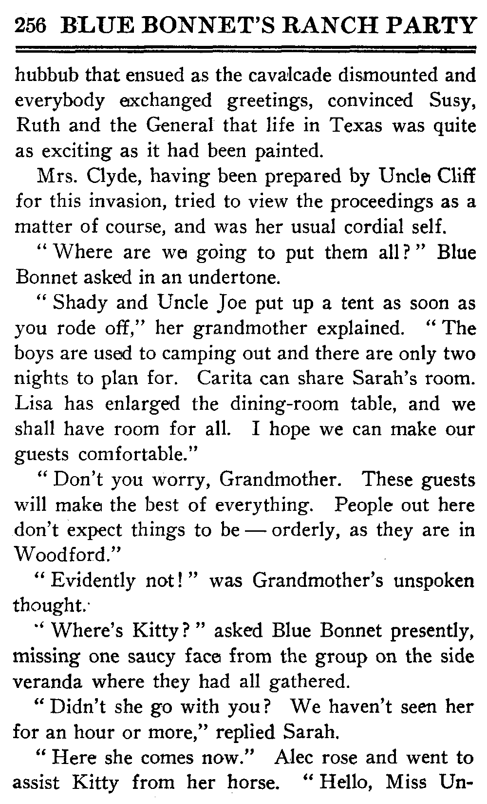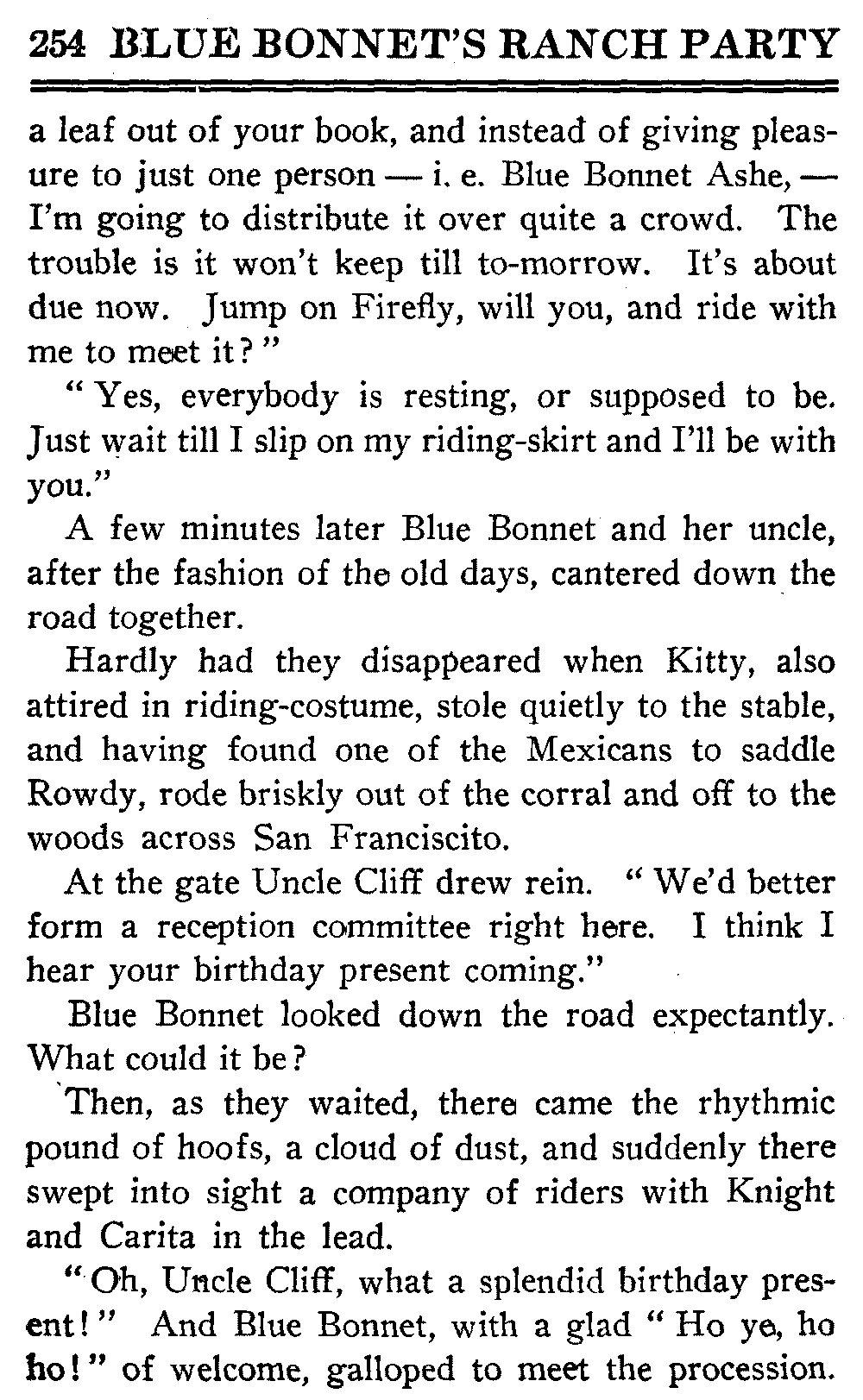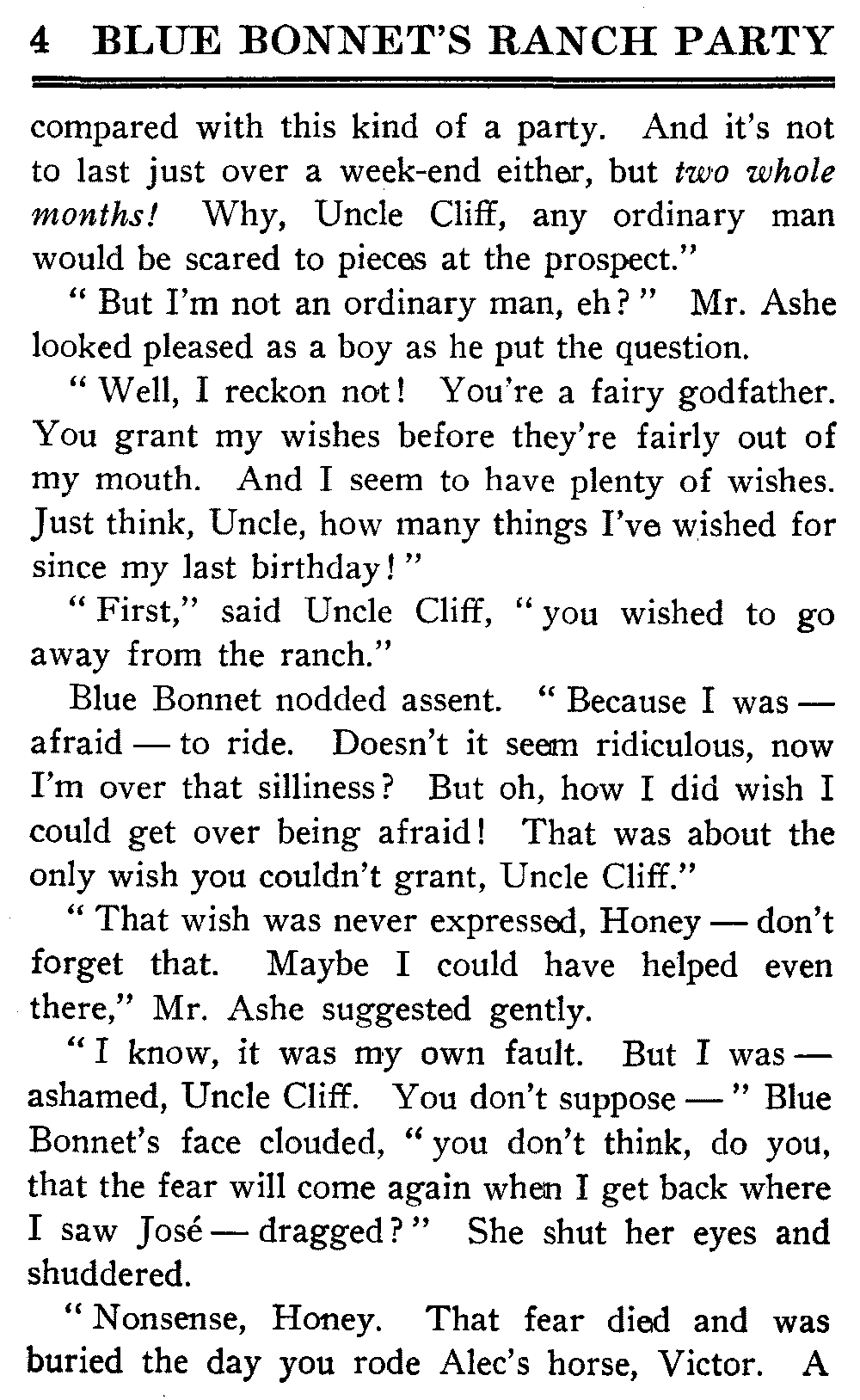 "Oh, I do think a ranch party is the grandest thing in the world," cried Blue Bonnet. "I've read of house parties, but they must be downright tame[4] compared with this kind of a party. And it's not to last just over a week-end either, but two whole months! Why, Uncle Cliff, any ordinary man would be scared to pieces at the prospect."