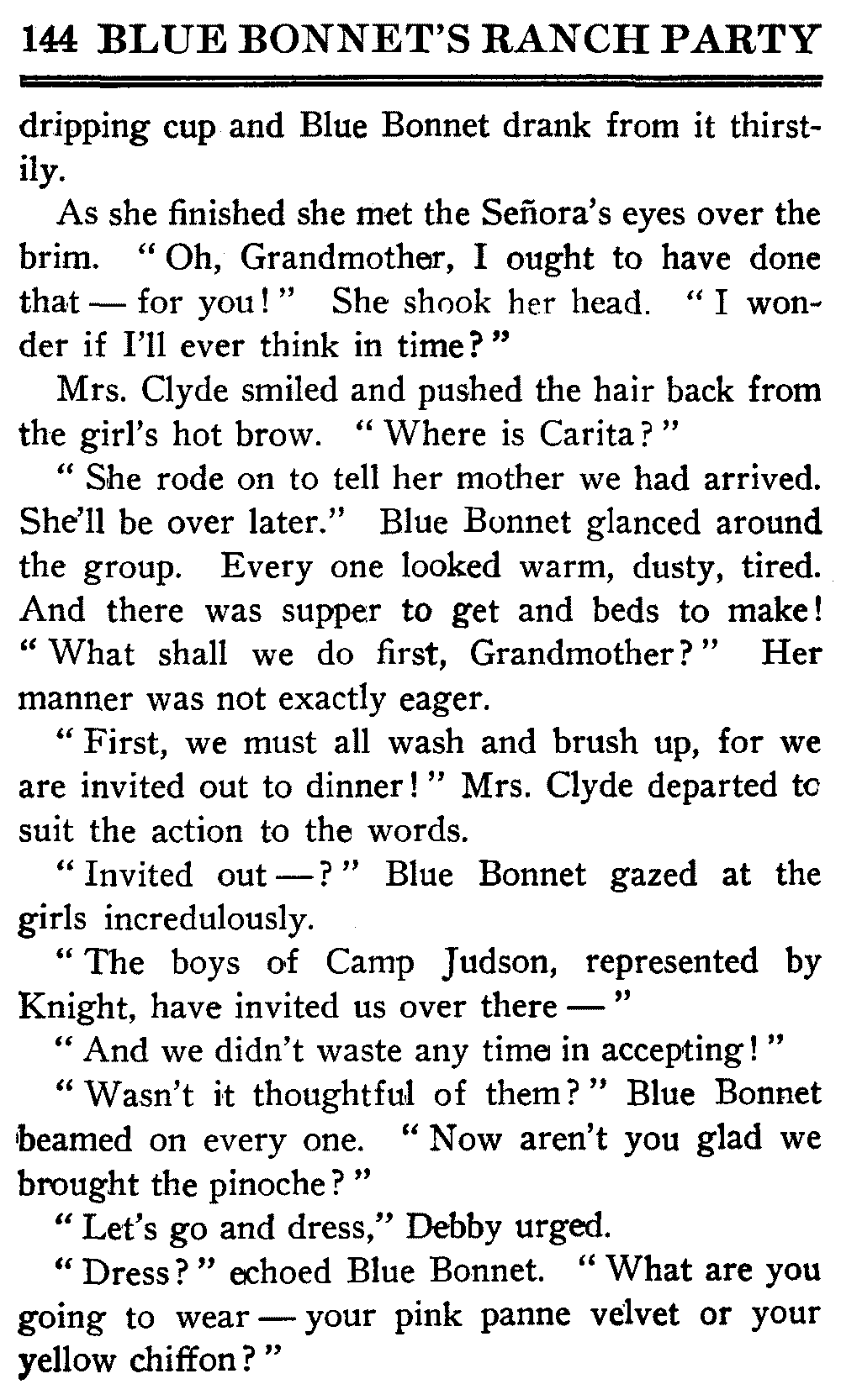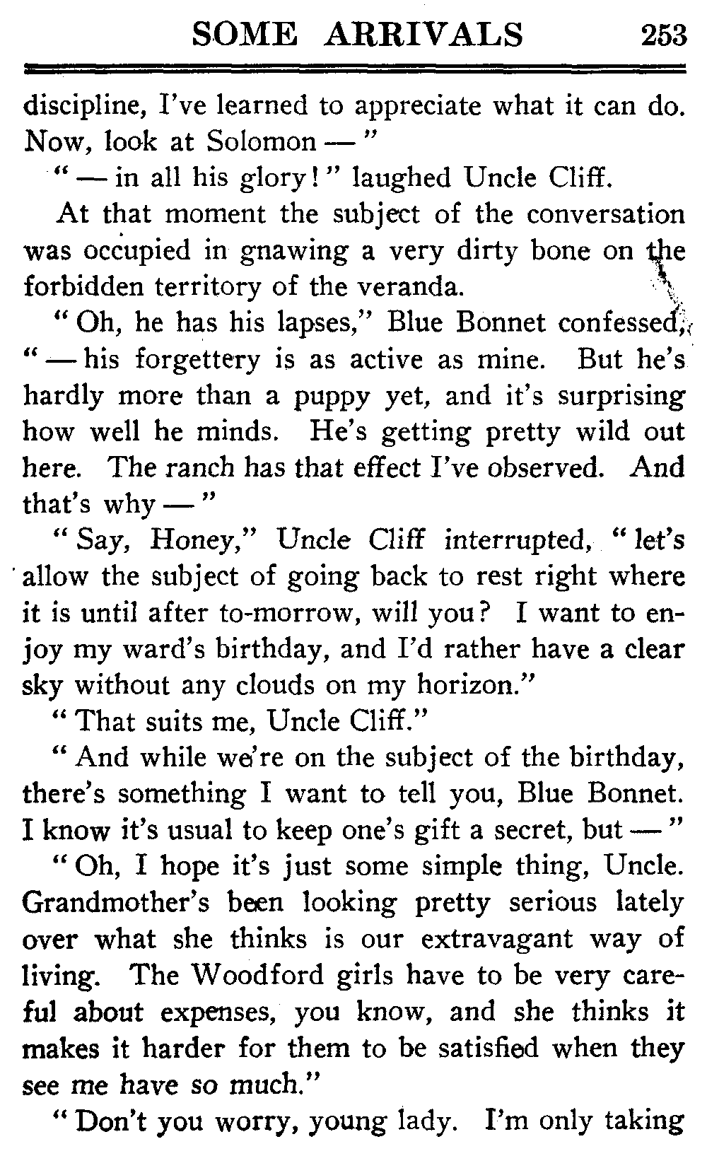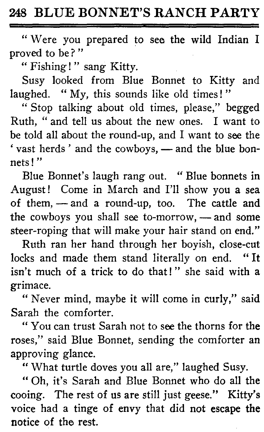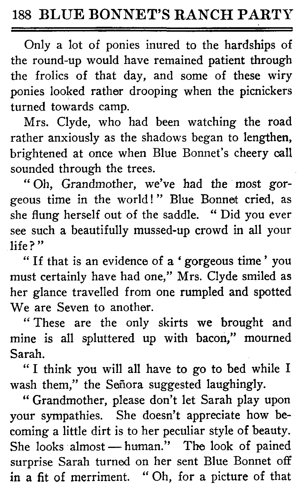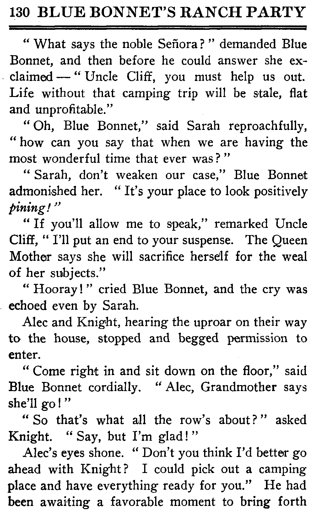 "Oh, I do think a ranch party is the grandest thing in the world," cried Blue Bonnet. "I've read of house parties, but they must be downright tame[4] compared with this kind of a party. And it's not to last just over a week-end either, but two whole months! Why, Uncle Cliff, any ordinary man would be scared to pieces at the prospect."