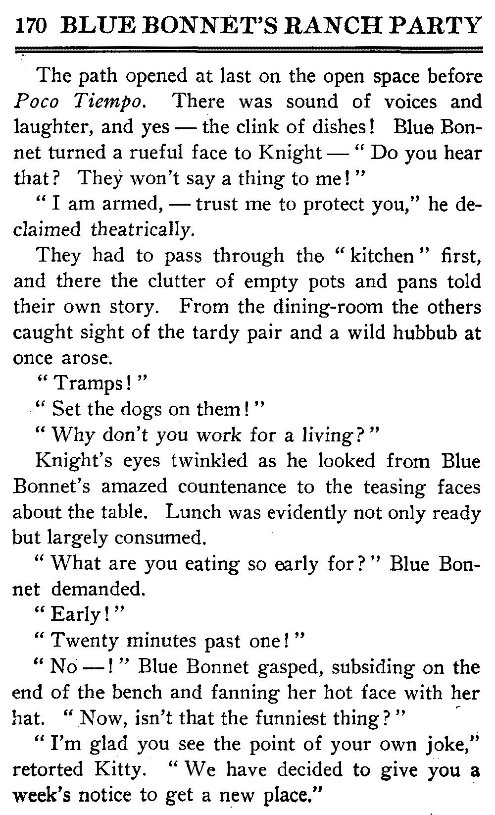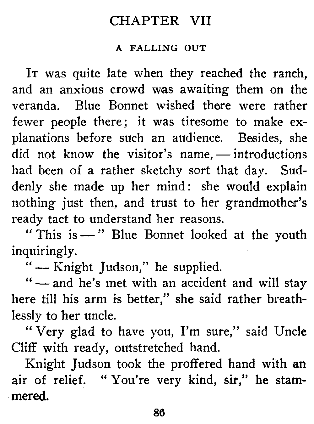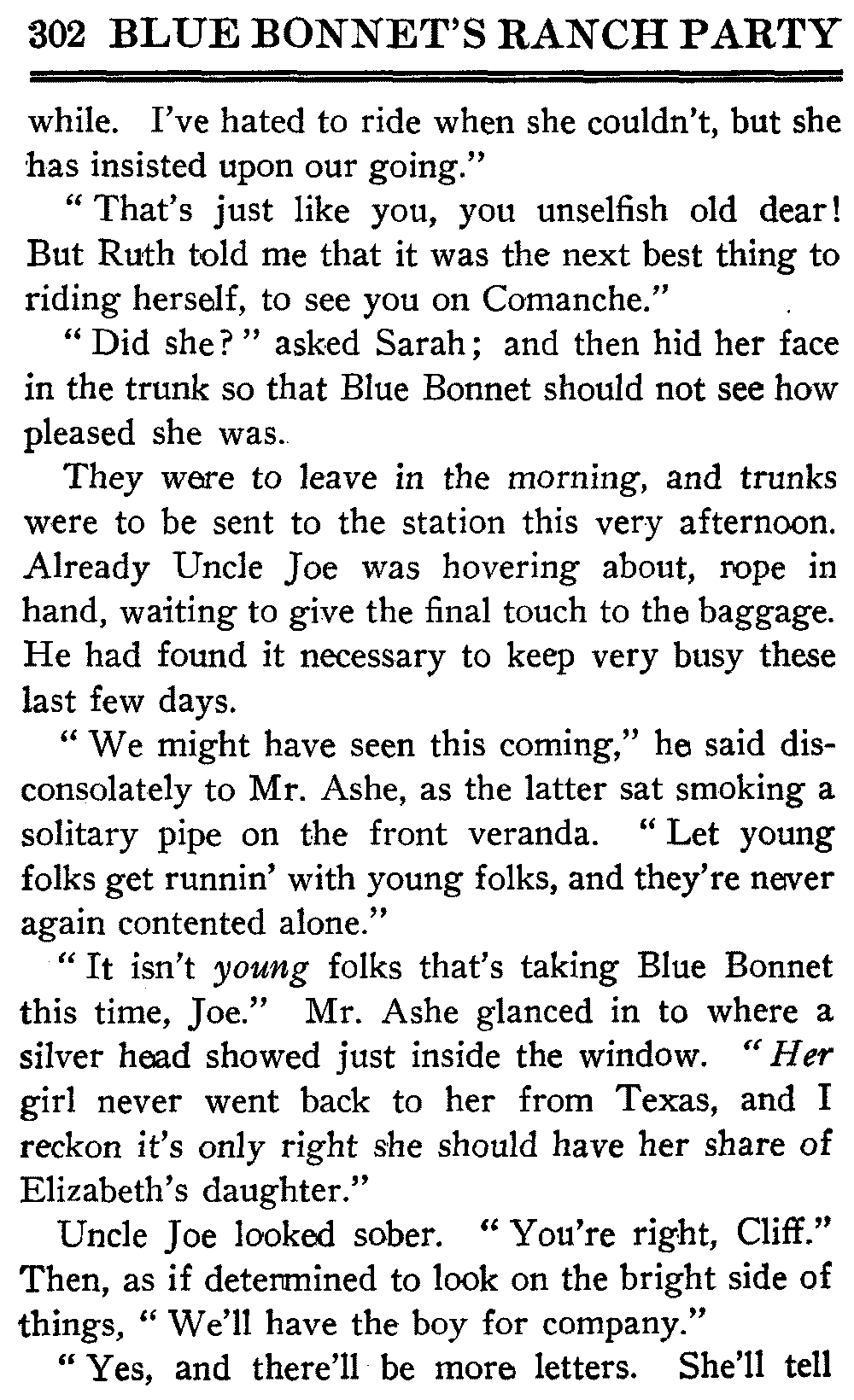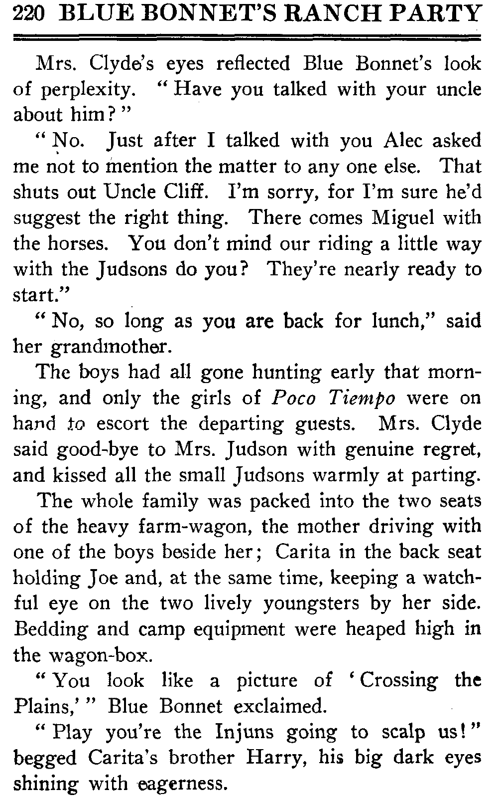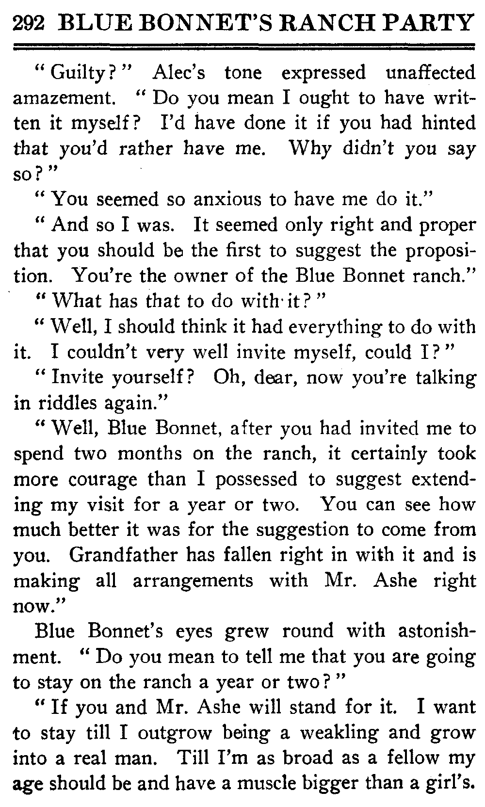 "Oh, I do think a ranch party is the grandest thing in the world," cried Blue Bonnet. "I've read of house parties, but they must be downright tame[4] compared with this kind of a party. And it's not to last just over a week-end either, but two whole months! Why, Uncle Cliff, any ordinary man would be scared to pieces at the prospect."