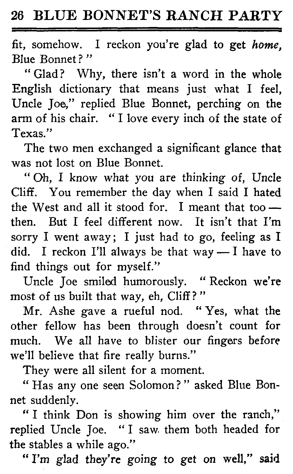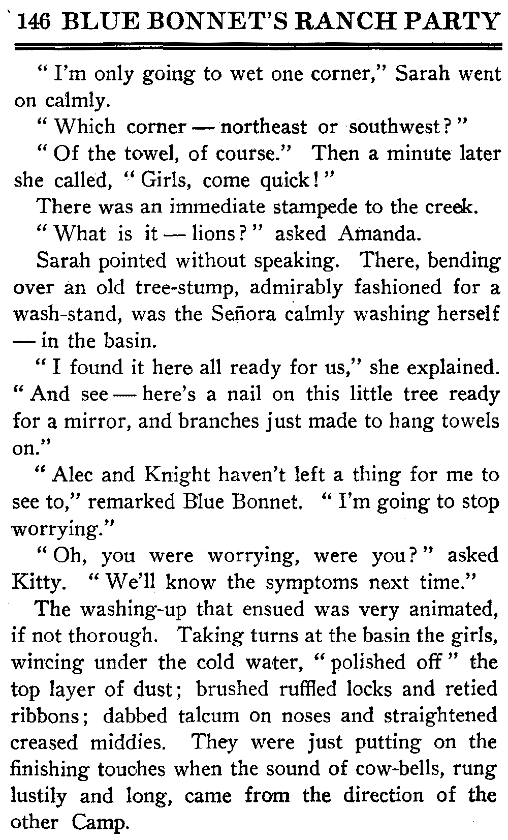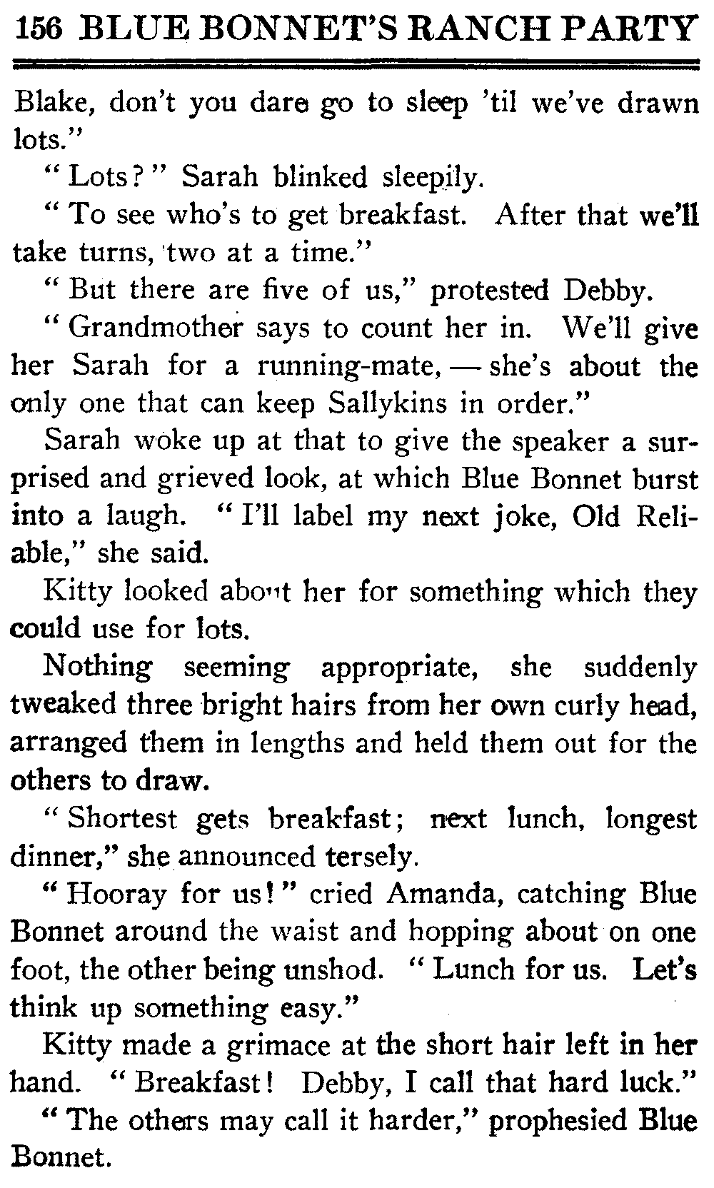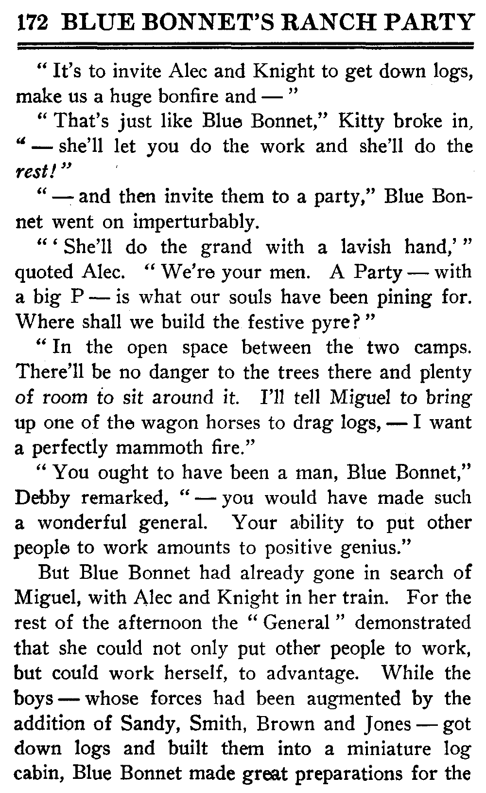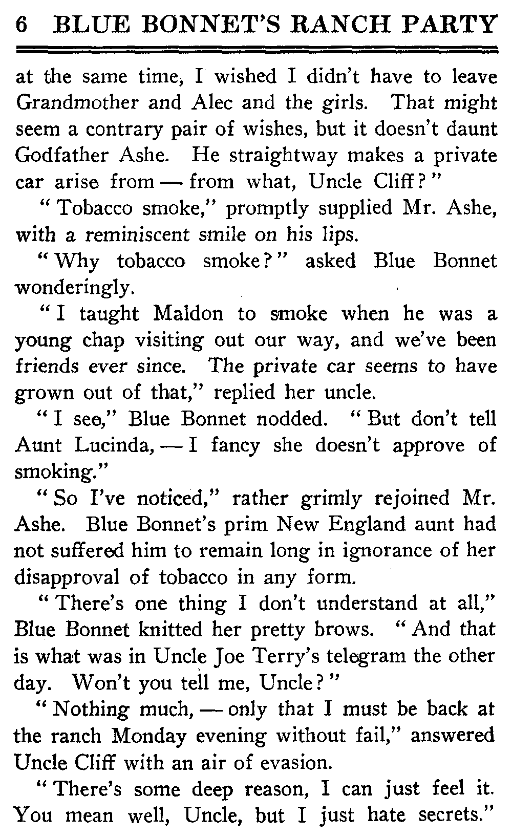 "Oh, I do think a ranch party is the grandest thing in the world," cried Blue Bonnet. "I've read of house parties, but they must be downright tame[4] compared with this kind of a party. And it's not to last just over a week-end either, but two whole months! Why, Uncle Cliff, any ordinary man would be scared to pieces at the prospect."
