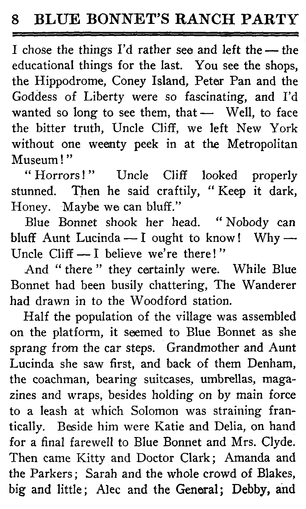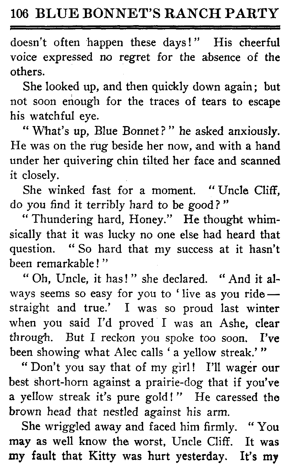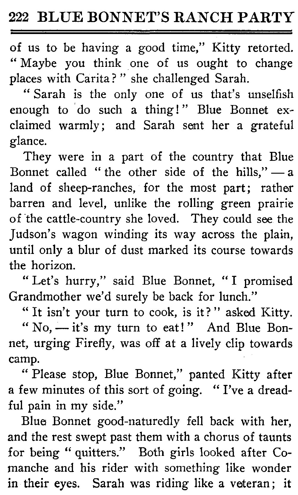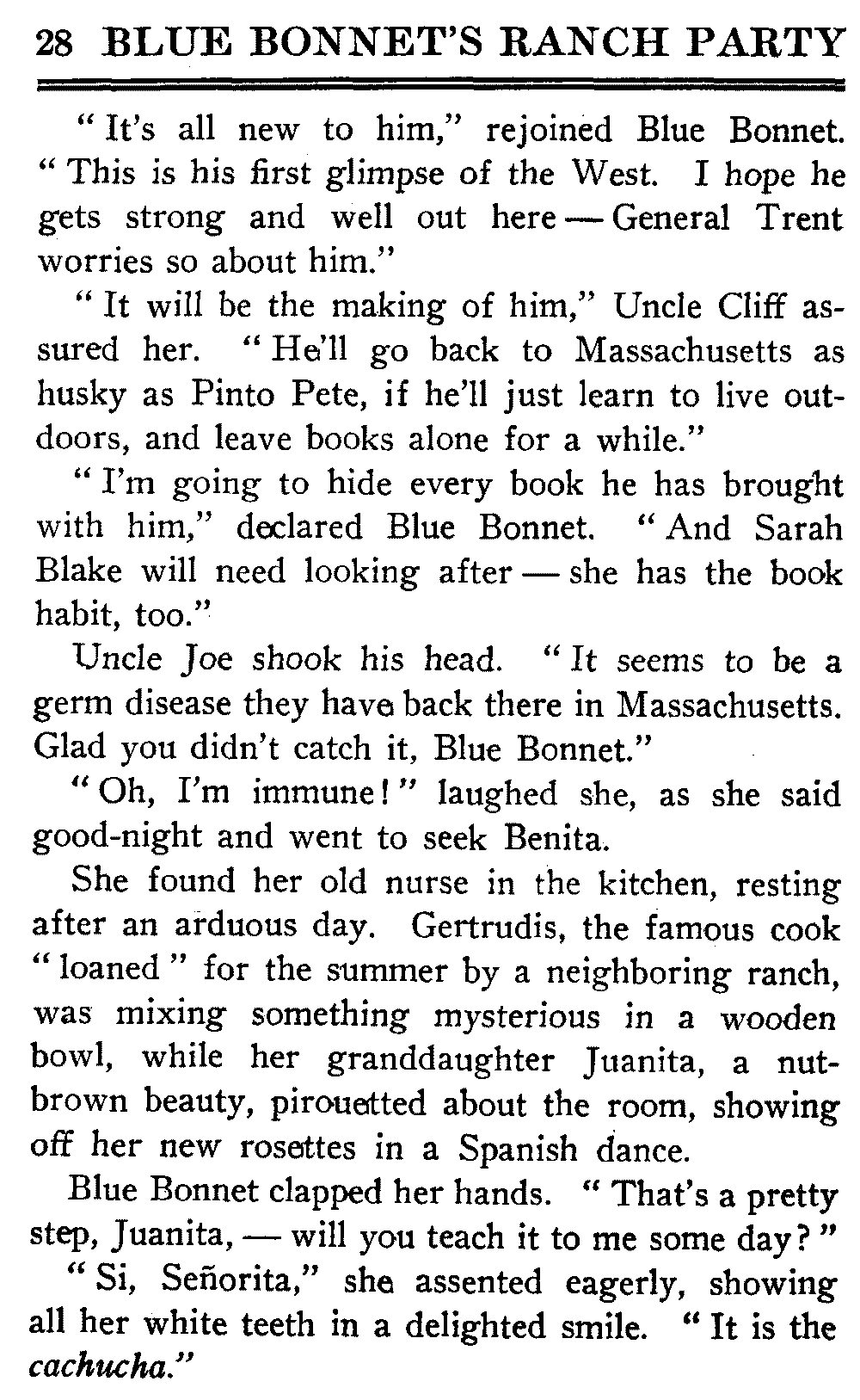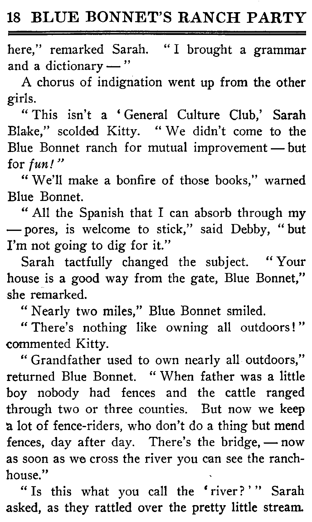 "Oh, I do think a ranch party is the grandest thing in the world," cried Blue Bonnet. "I've read of house parties, but they must be downright tame[4] compared with this kind of a party. And it's not to last just over a week-end either, but two whole months! Why, Uncle Cliff, any ordinary man would be scared to pieces at the prospect."