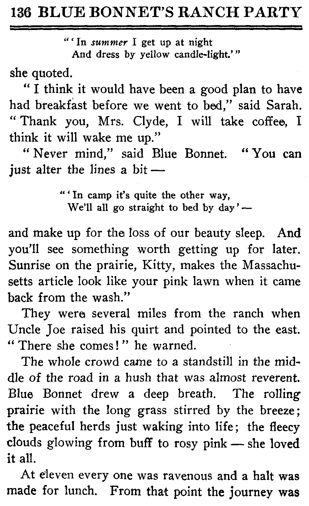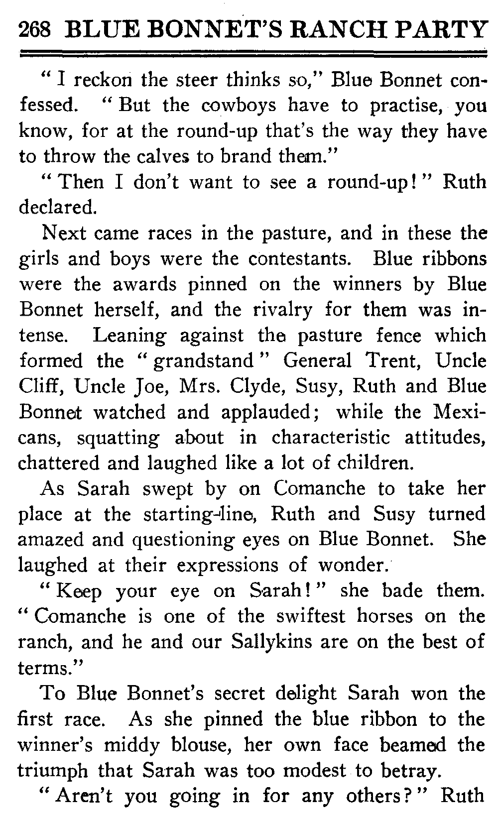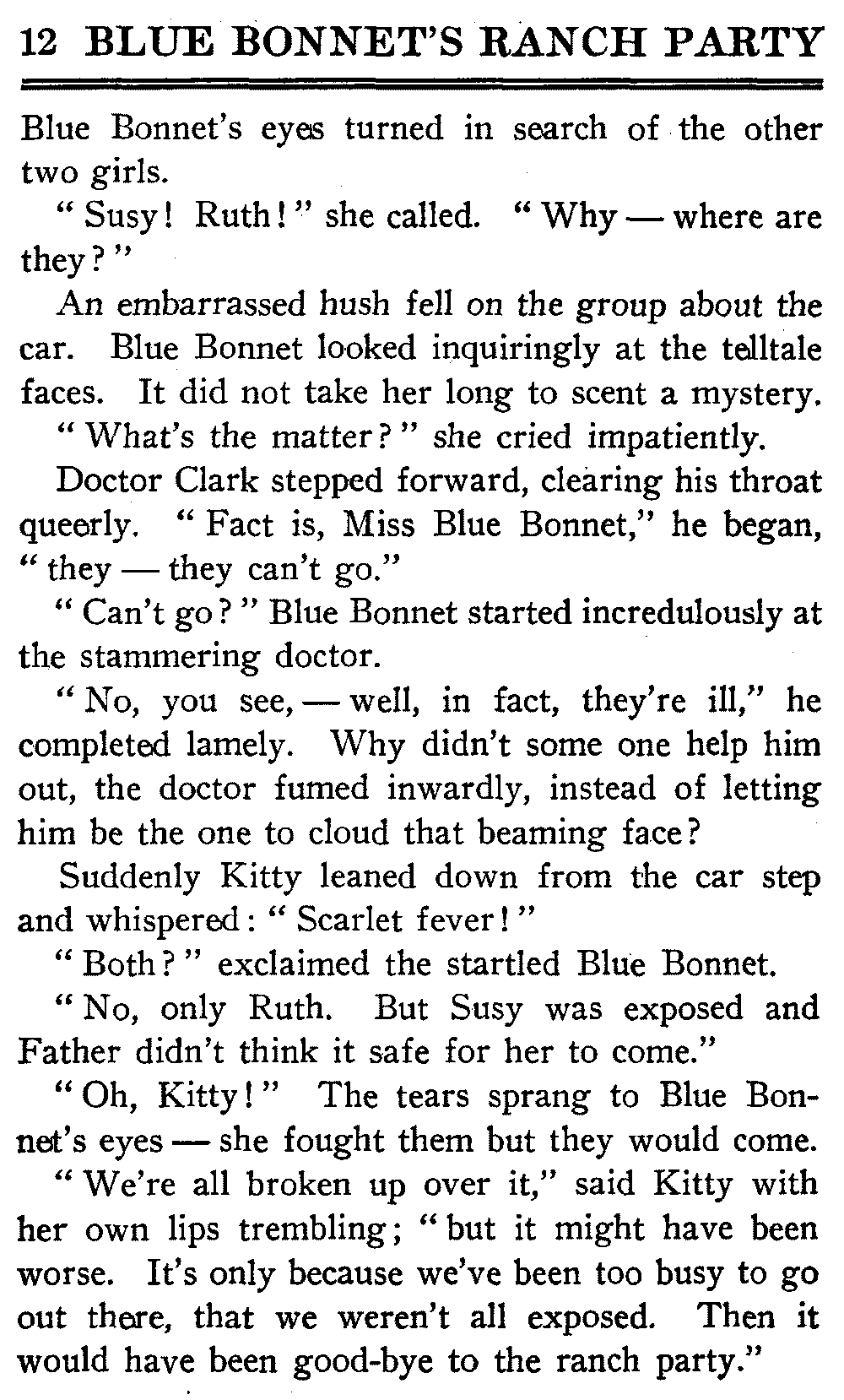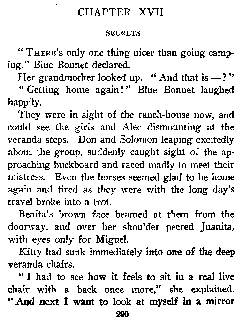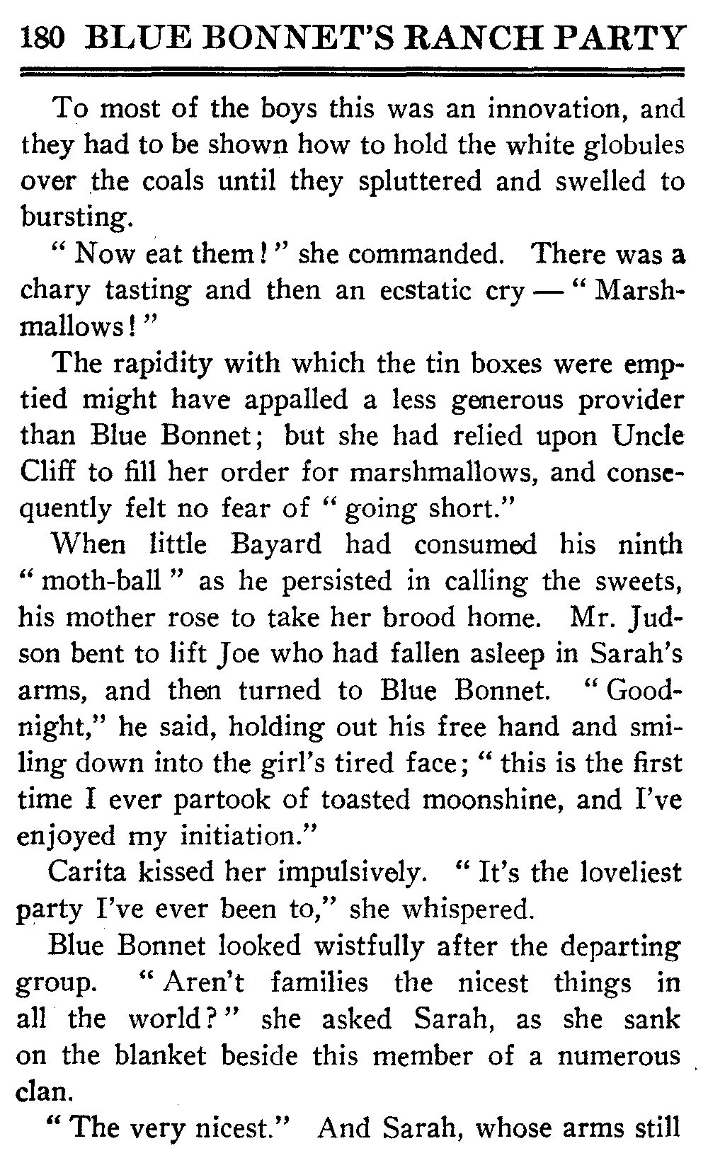 "Oh, I do think a ranch party is the grandest thing in the world," cried Blue Bonnet. "I've read of house parties, but they must be downright tame[4] compared with this kind of a party. And it's not to last just over a week-end either, but two whole months! Why, Uncle Cliff, any ordinary man would be scared to pieces at the prospect."