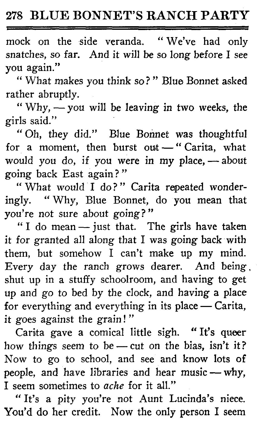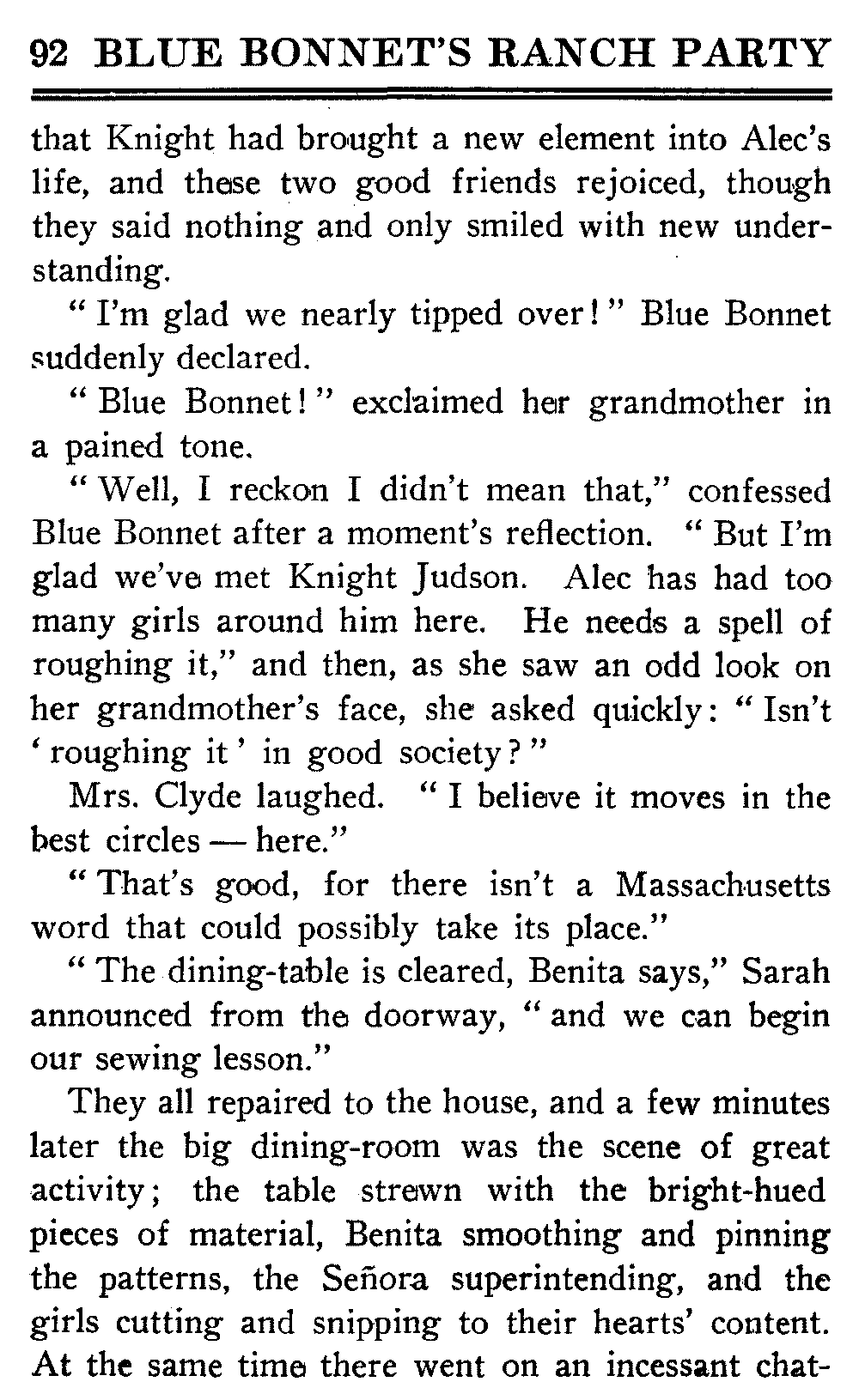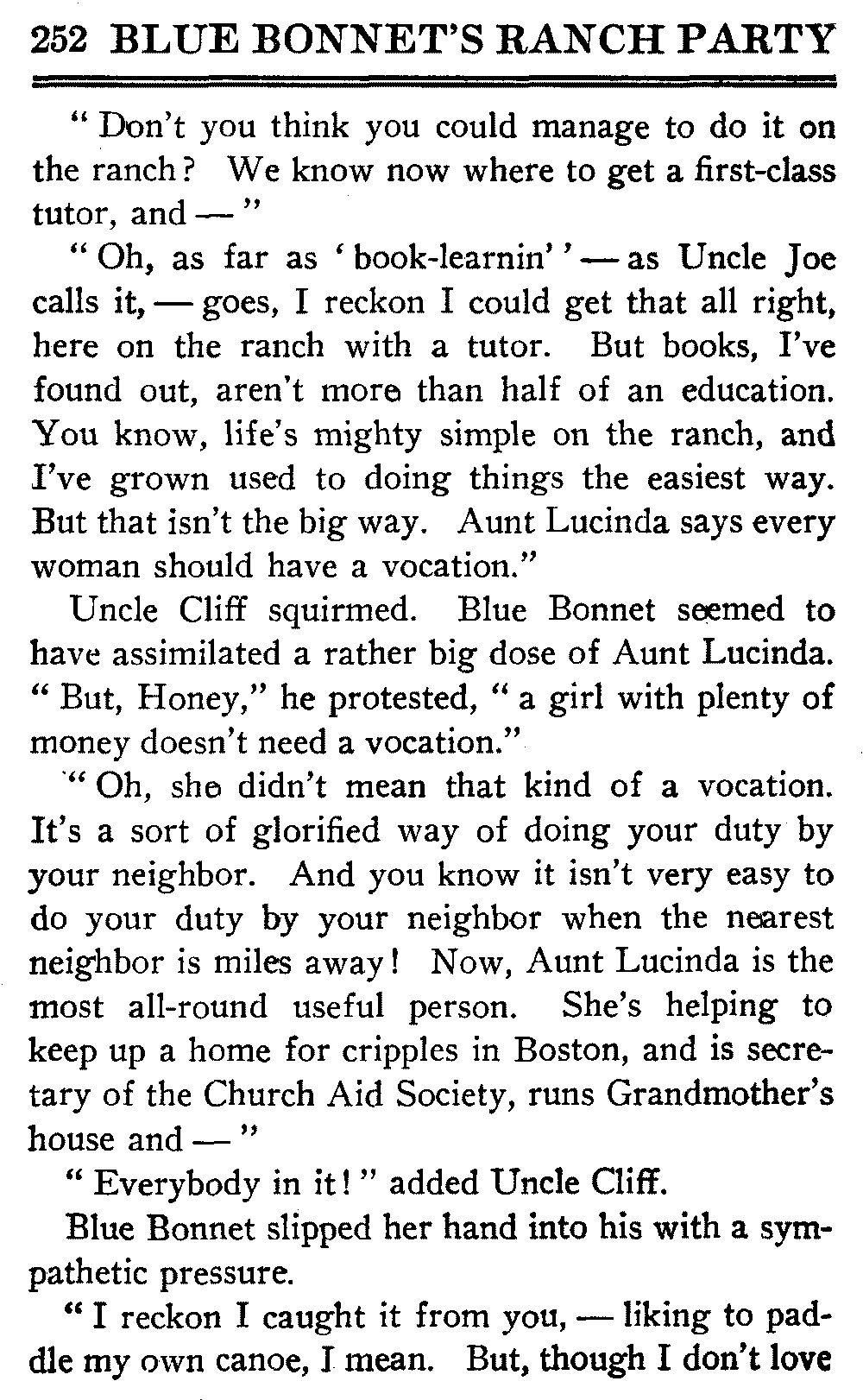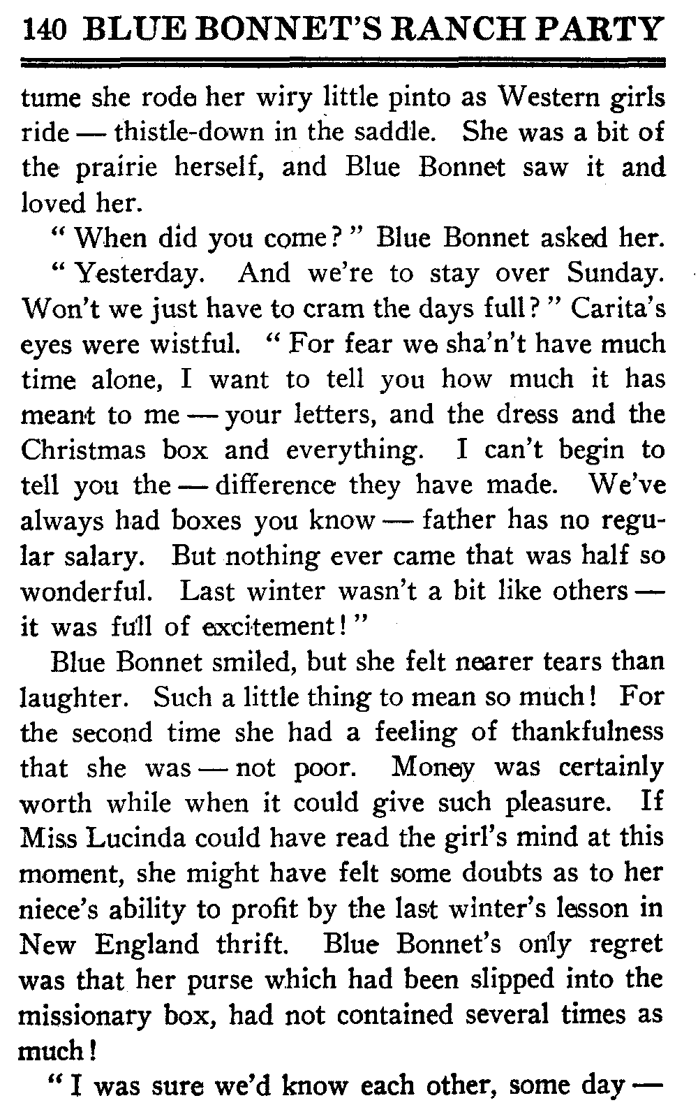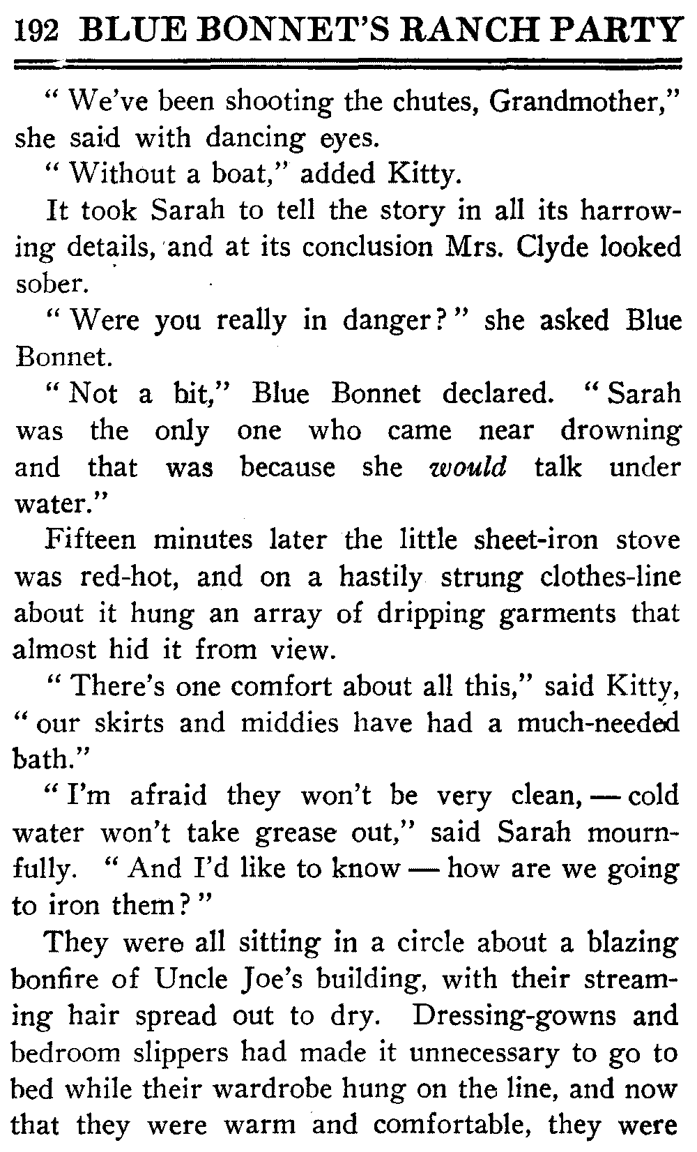 "Oh, I do think a ranch party is the grandest thing in the world," cried Blue Bonnet. "I've read of house parties, but they must be downright tame[4] compared with this kind of a party. And it's not to last just over a week-end either, but two whole months! Why, Uncle Cliff, any ordinary man would be scared to pieces at the prospect."