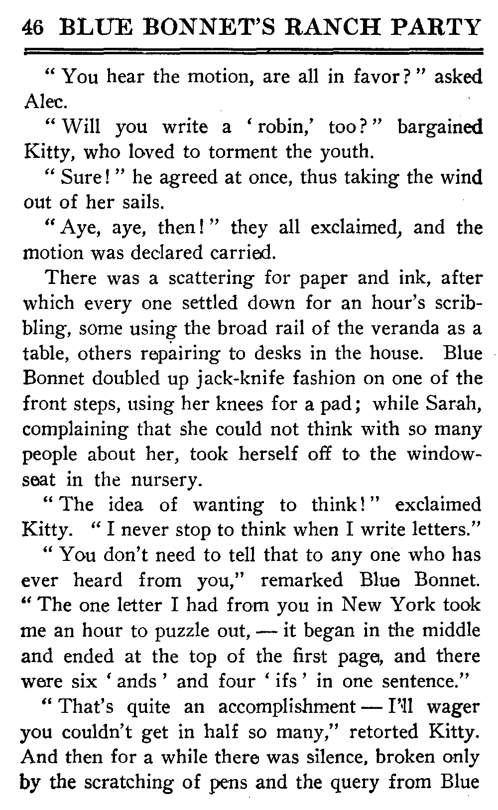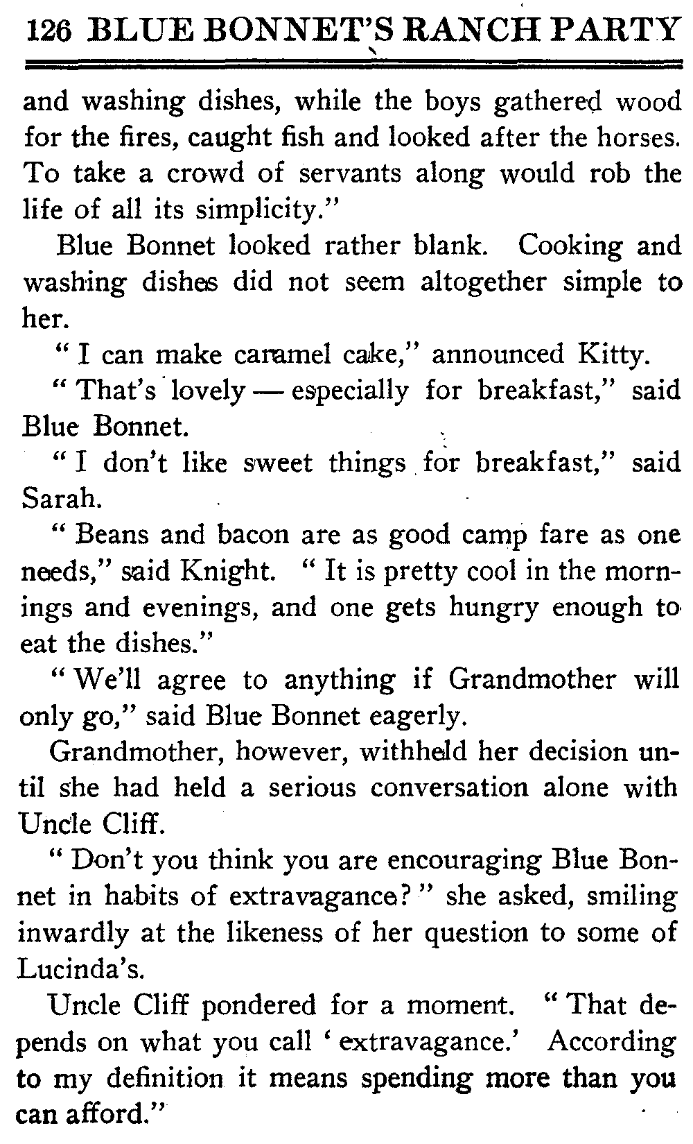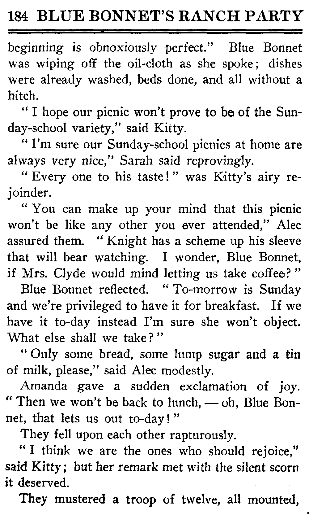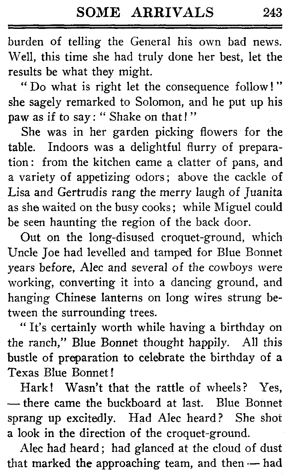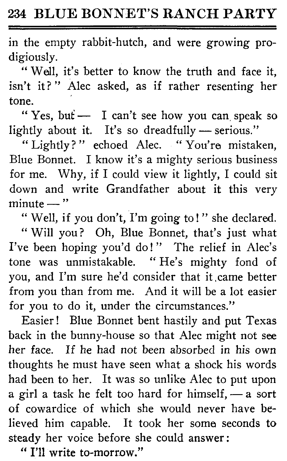 "Oh, I do think a ranch party is the grandest thing in the world," cried Blue Bonnet. "I've read of house parties, but they must be downright tame[4] compared with this kind of a party. And it's not to last just over a week-end either, but two whole months! Why, Uncle Cliff, any ordinary man would be scared to pieces at the prospect."