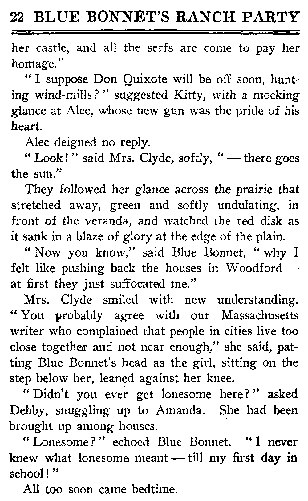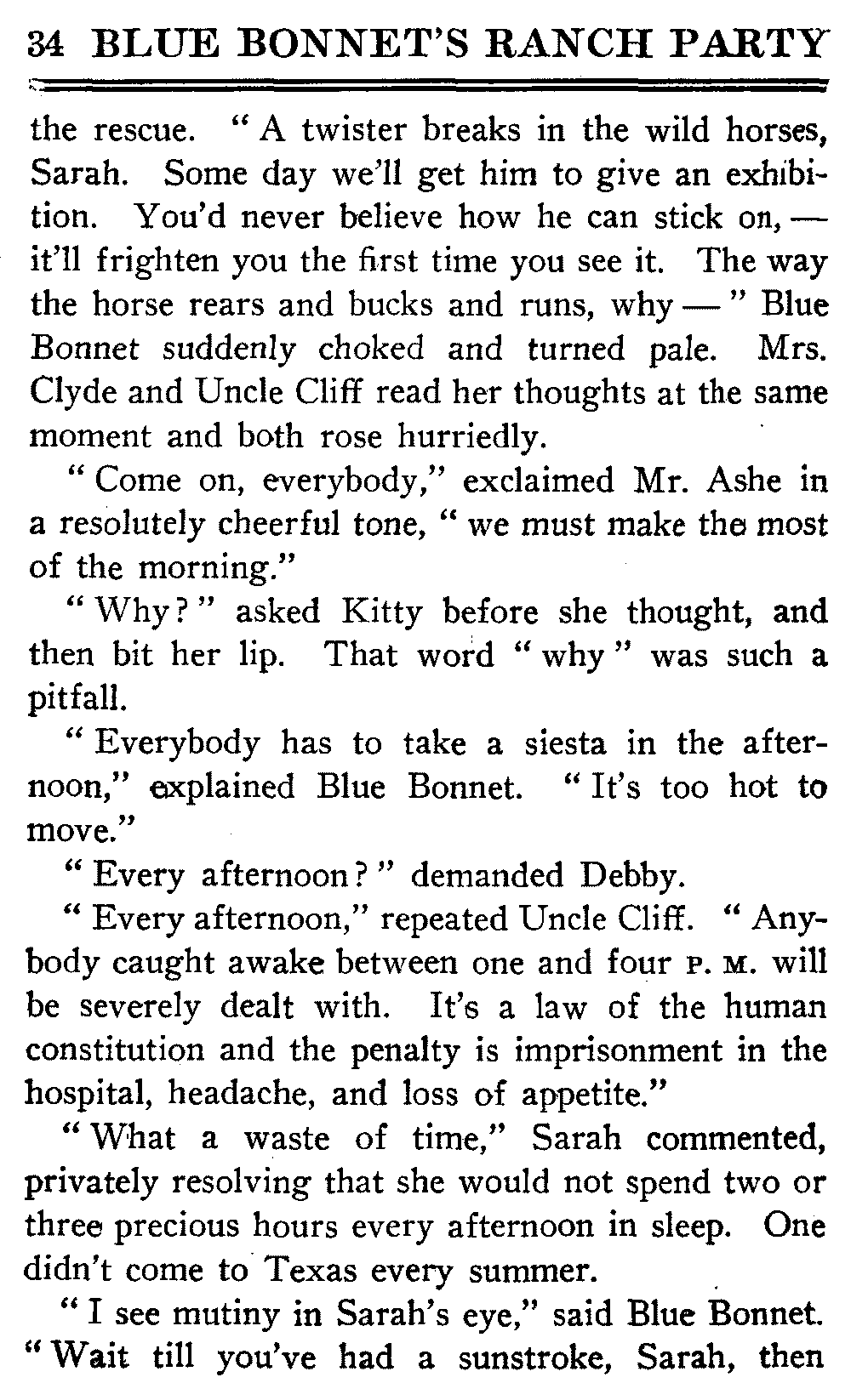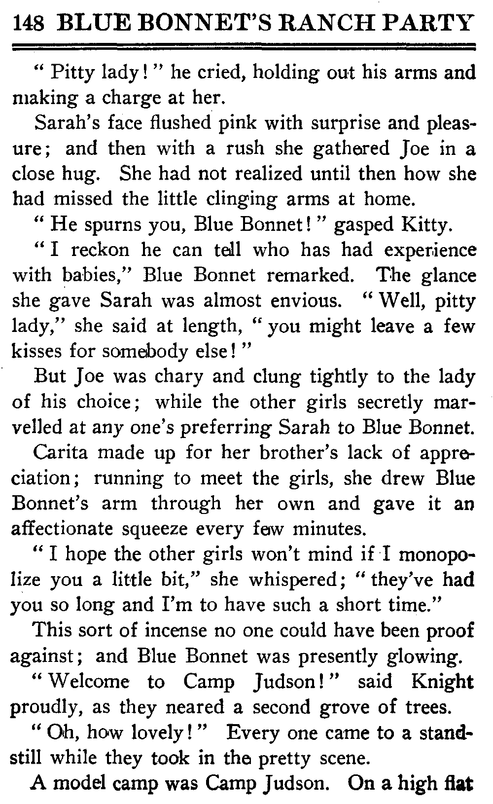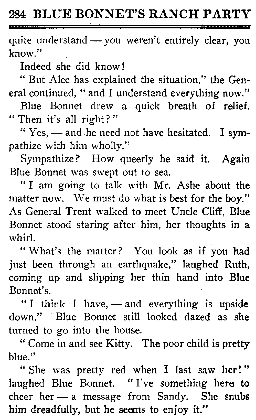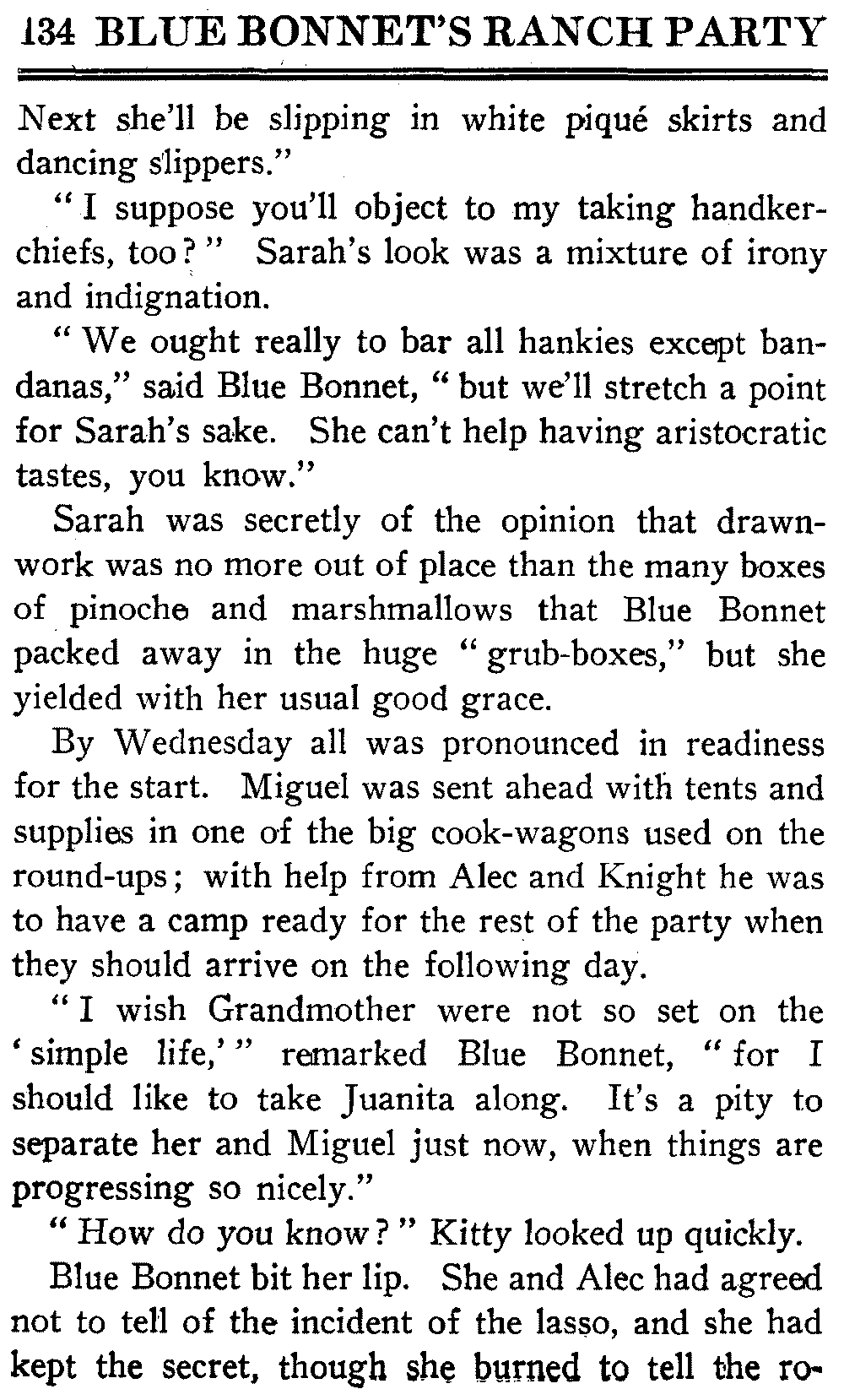 "Oh, I do think a ranch party is the grandest thing in the world," cried Blue Bonnet. "I've read of house parties, but they must be downright tame[4] compared with this kind of a party. And it's not to last just over a week-end either, but two whole months! Why, Uncle Cliff, any ordinary man would be scared to pieces at the prospect."