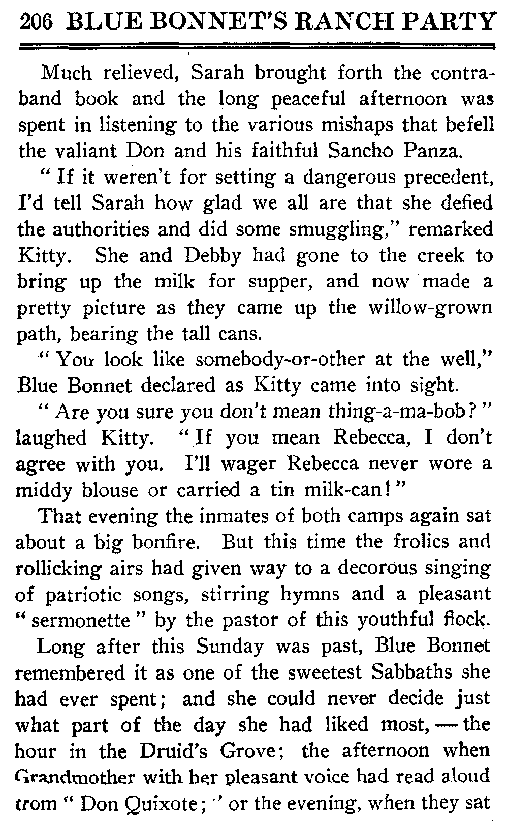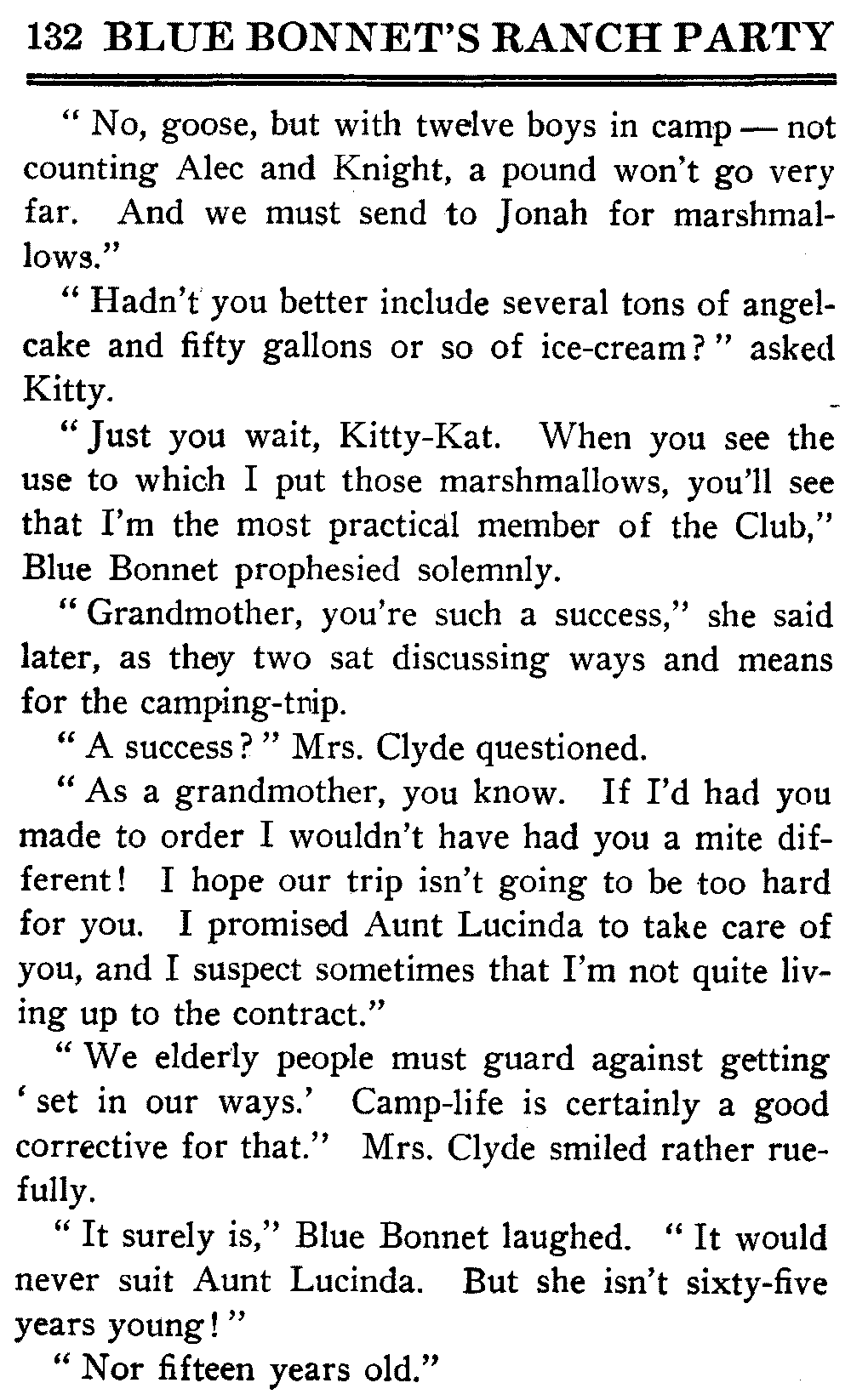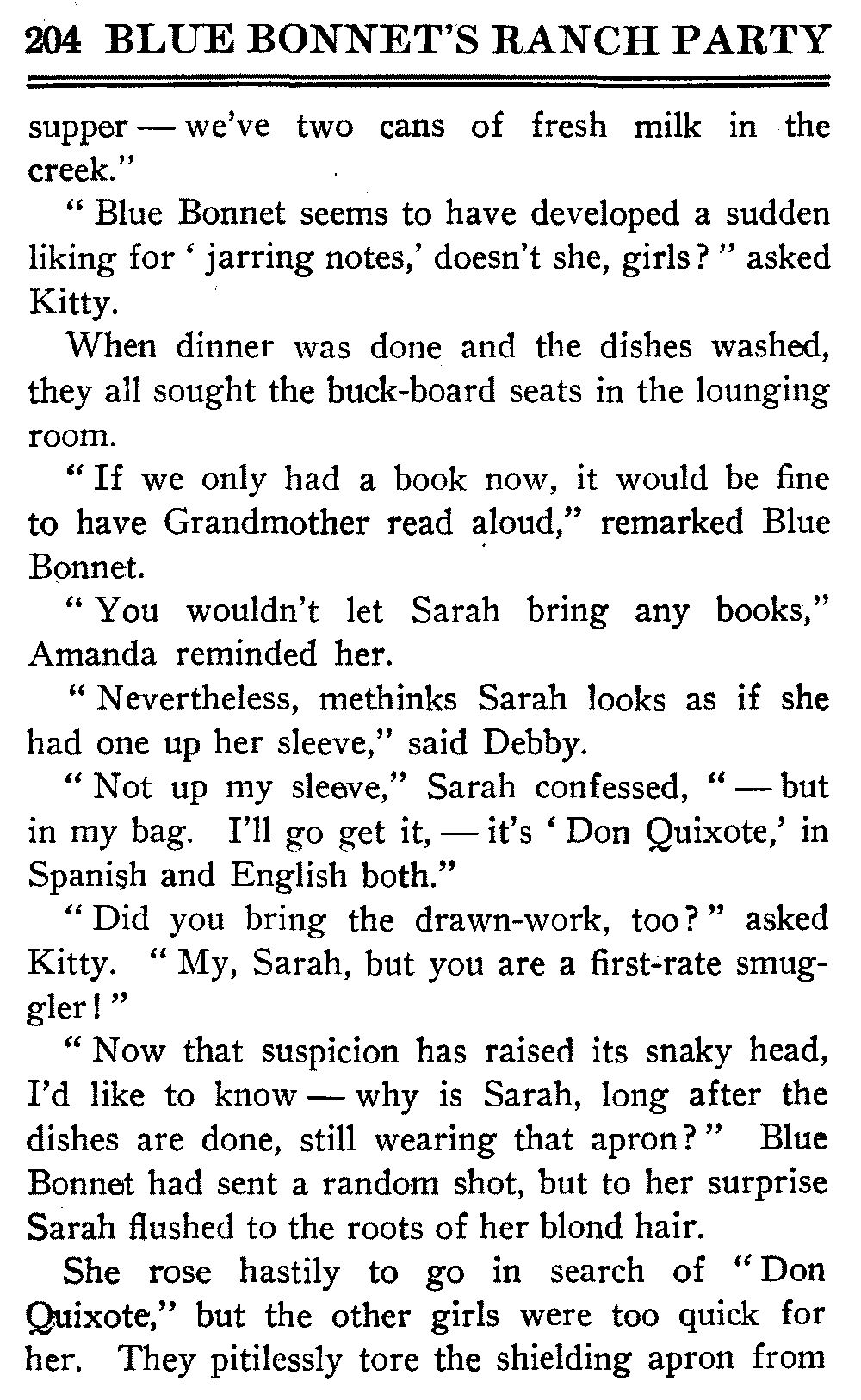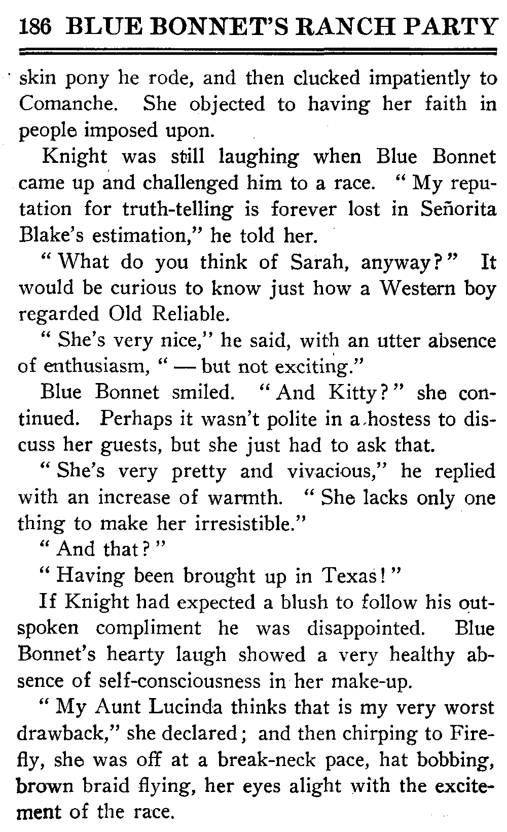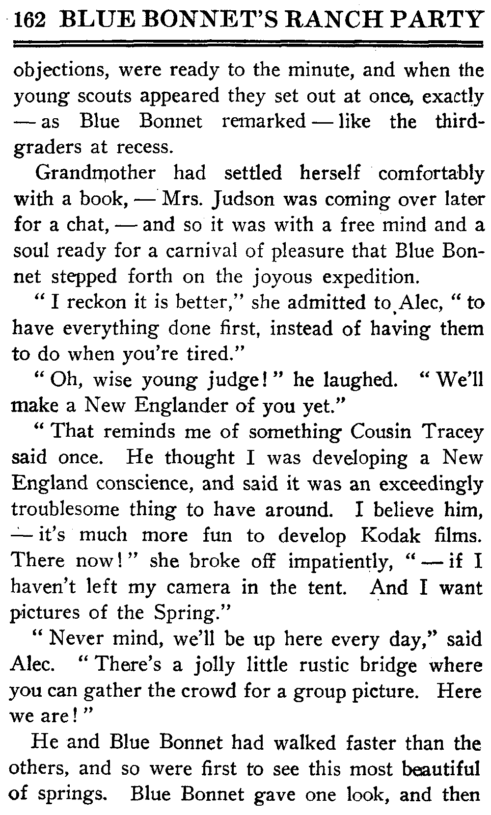 "Oh, I do think a ranch party is the grandest thing in the world," cried Blue Bonnet. "I've read of house parties, but they must be downright tame[4] compared with this kind of a party. And it's not to last just over a week-end either, but two whole months! Why, Uncle Cliff, any ordinary man would be scared to pieces at the prospect."
