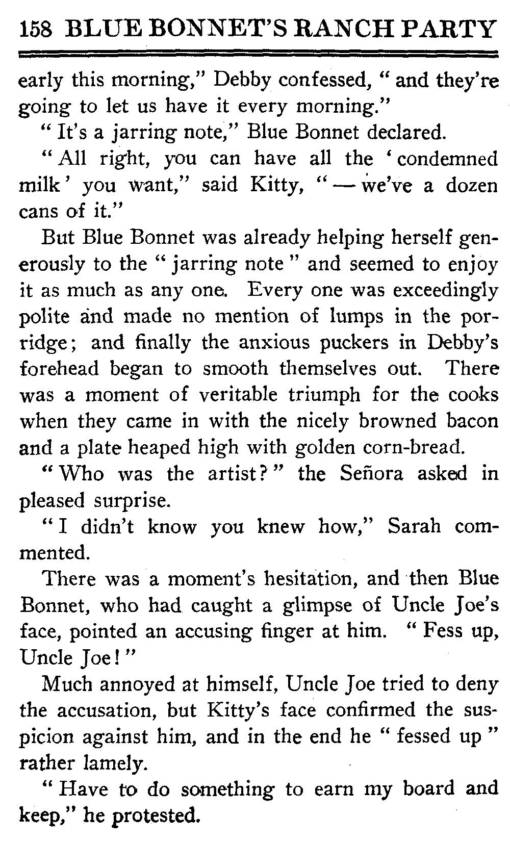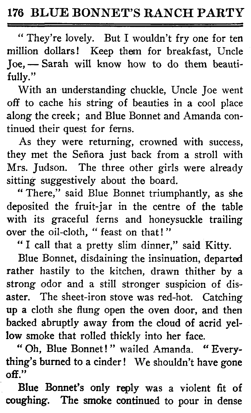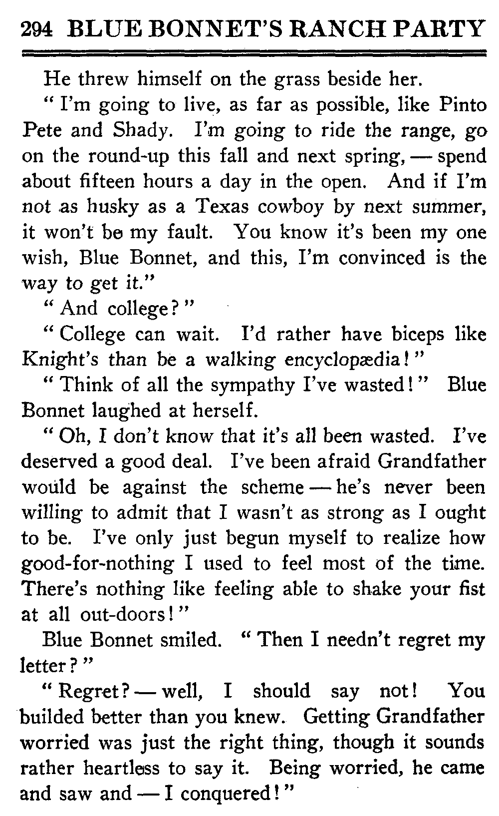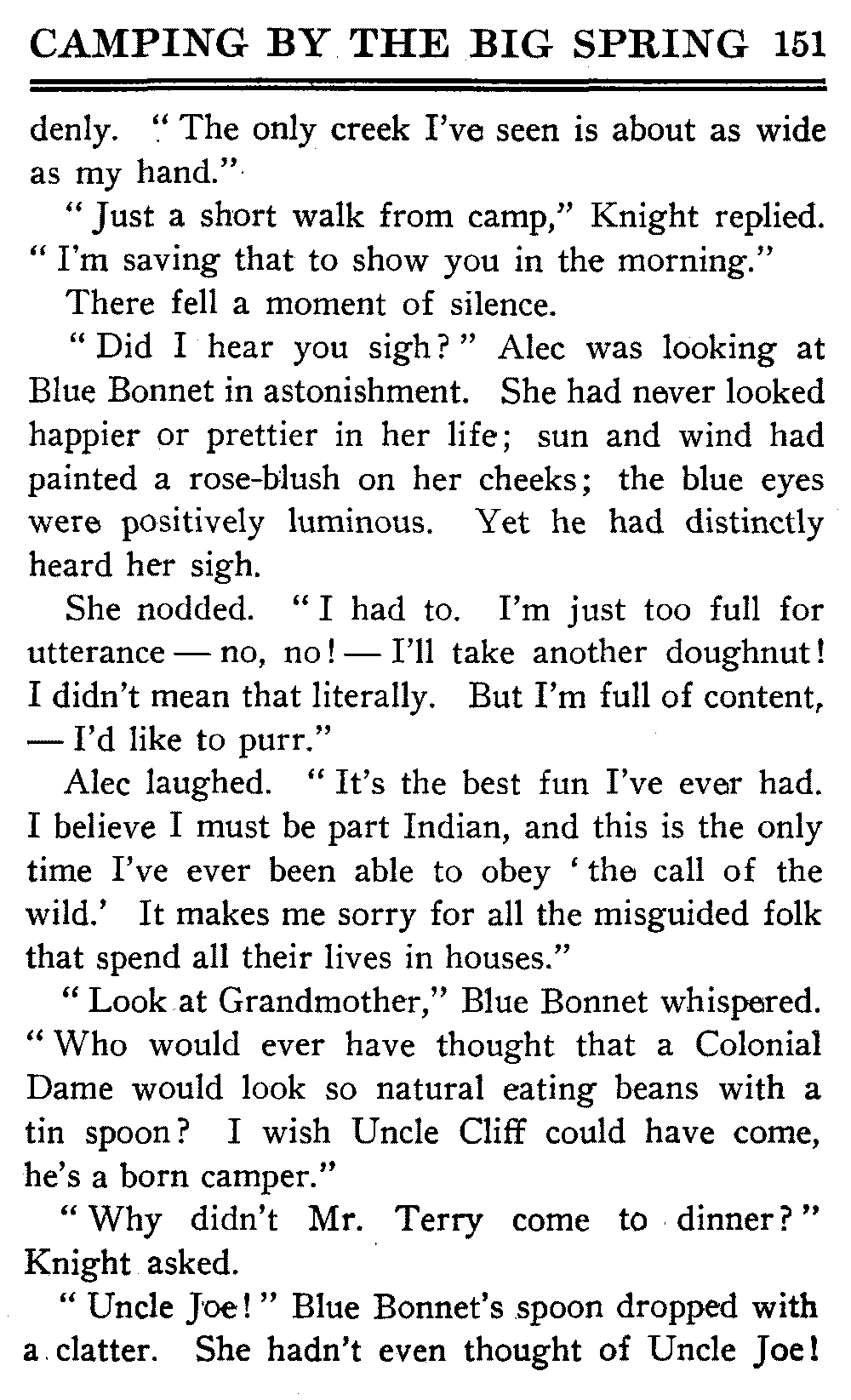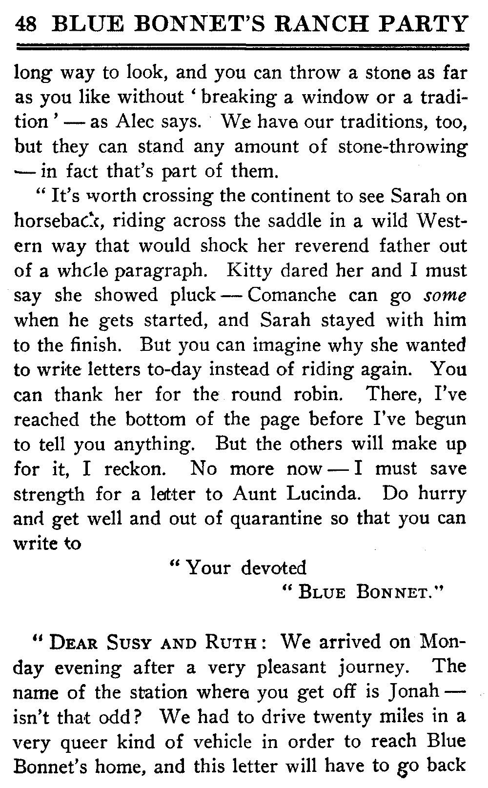 "Oh, I do think a ranch party is the grandest thing in the world," cried Blue Bonnet. "I've read of house parties, but they must be downright tame[4] compared with this kind of a party. And it's not to last just over a week-end either, but two whole months! Why, Uncle Cliff, any ordinary man would be scared to pieces at the prospect."
