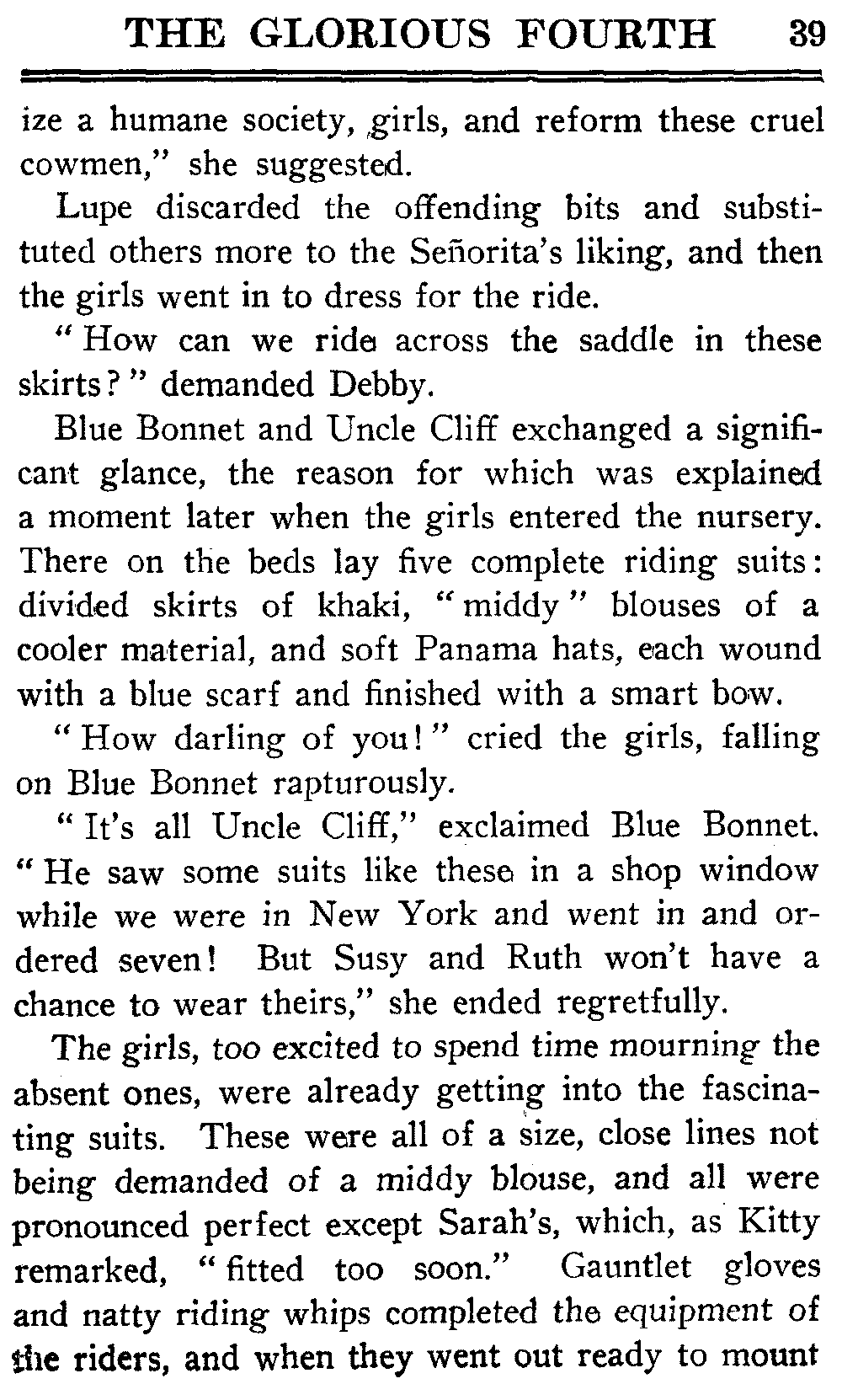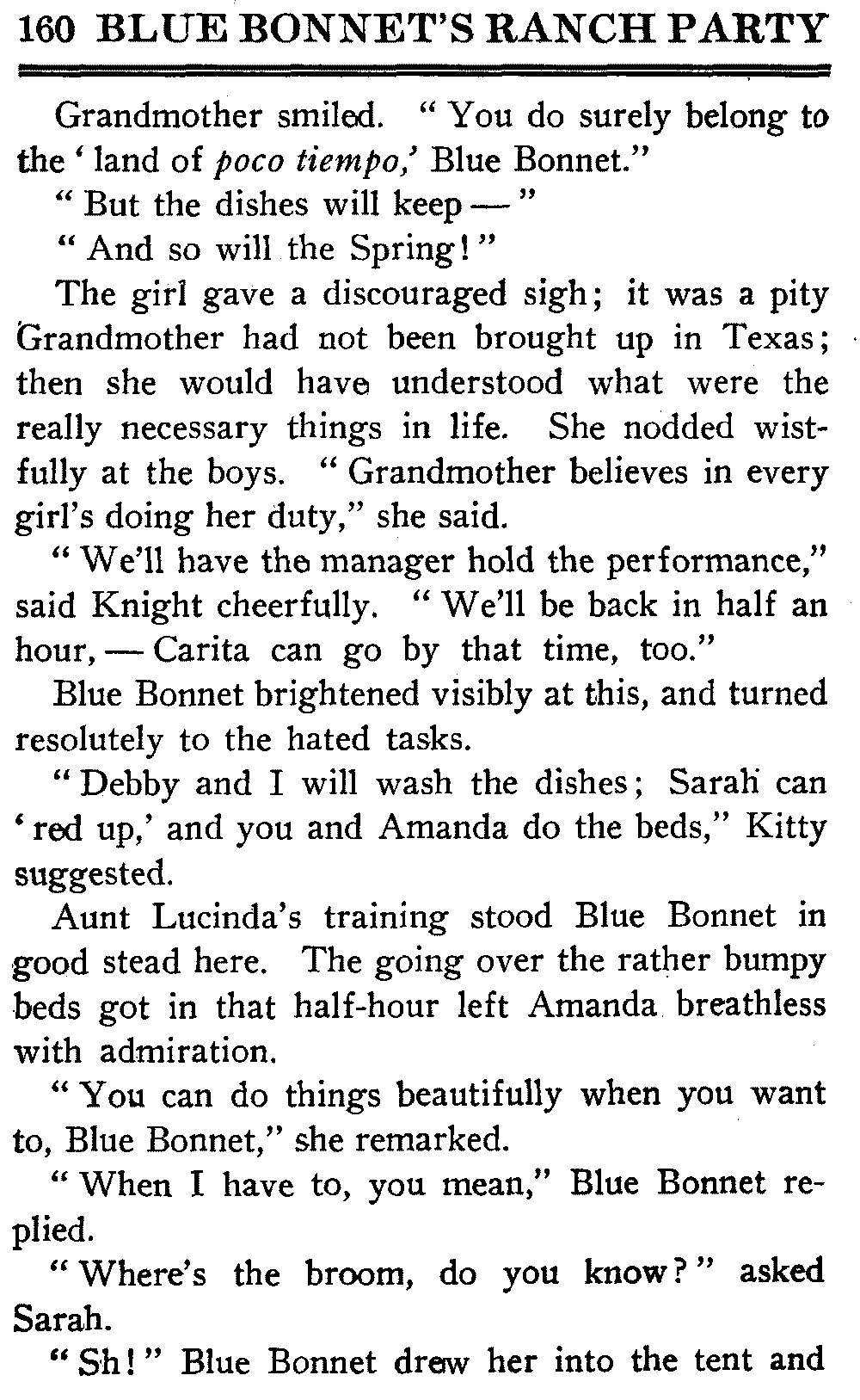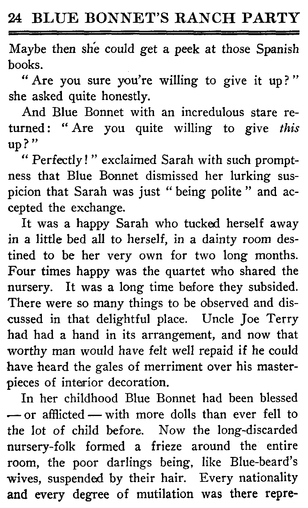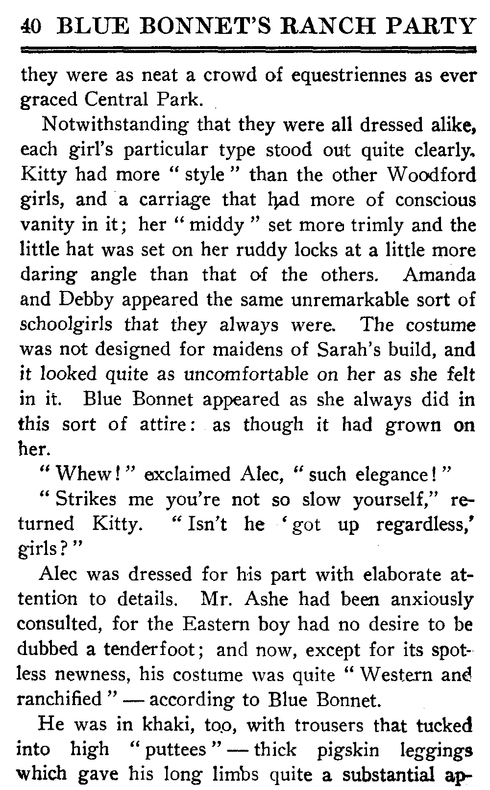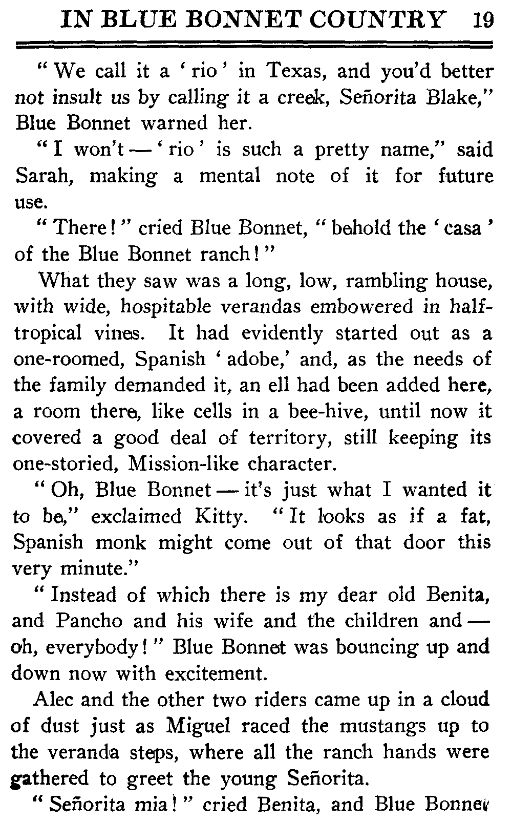 "Oh, I do think a ranch party is the grandest thing in the world," cried Blue Bonnet. "I've read of house parties, but they must be downright tame[4] compared with this kind of a party. And it's not to last just over a week-end either, but two whole months! Why, Uncle Cliff, any ordinary man would be scared to pieces at the prospect."