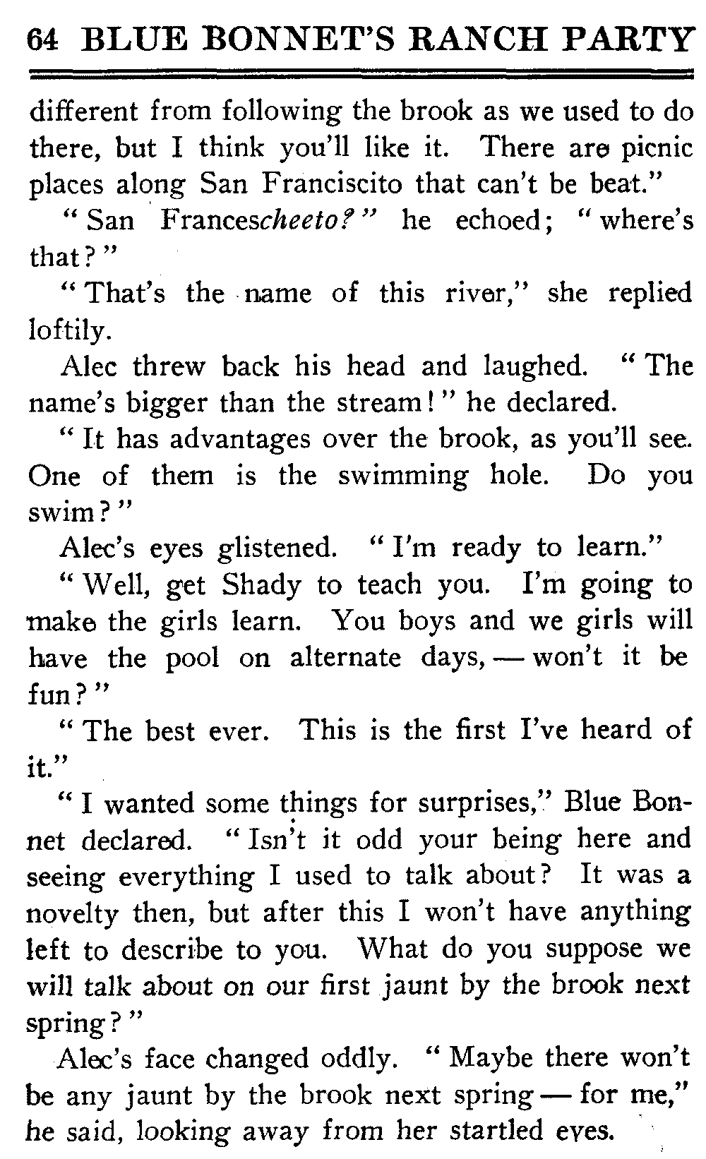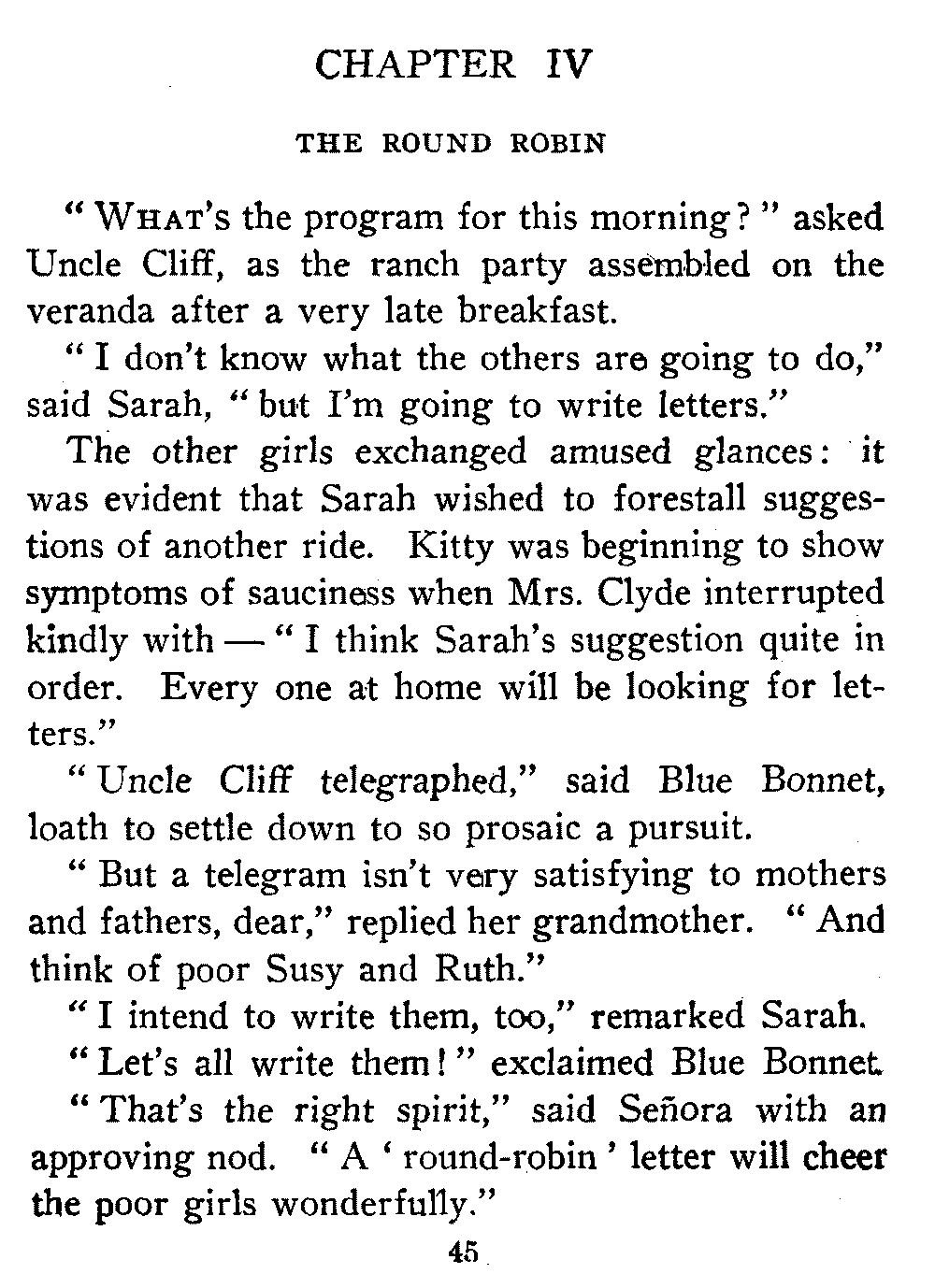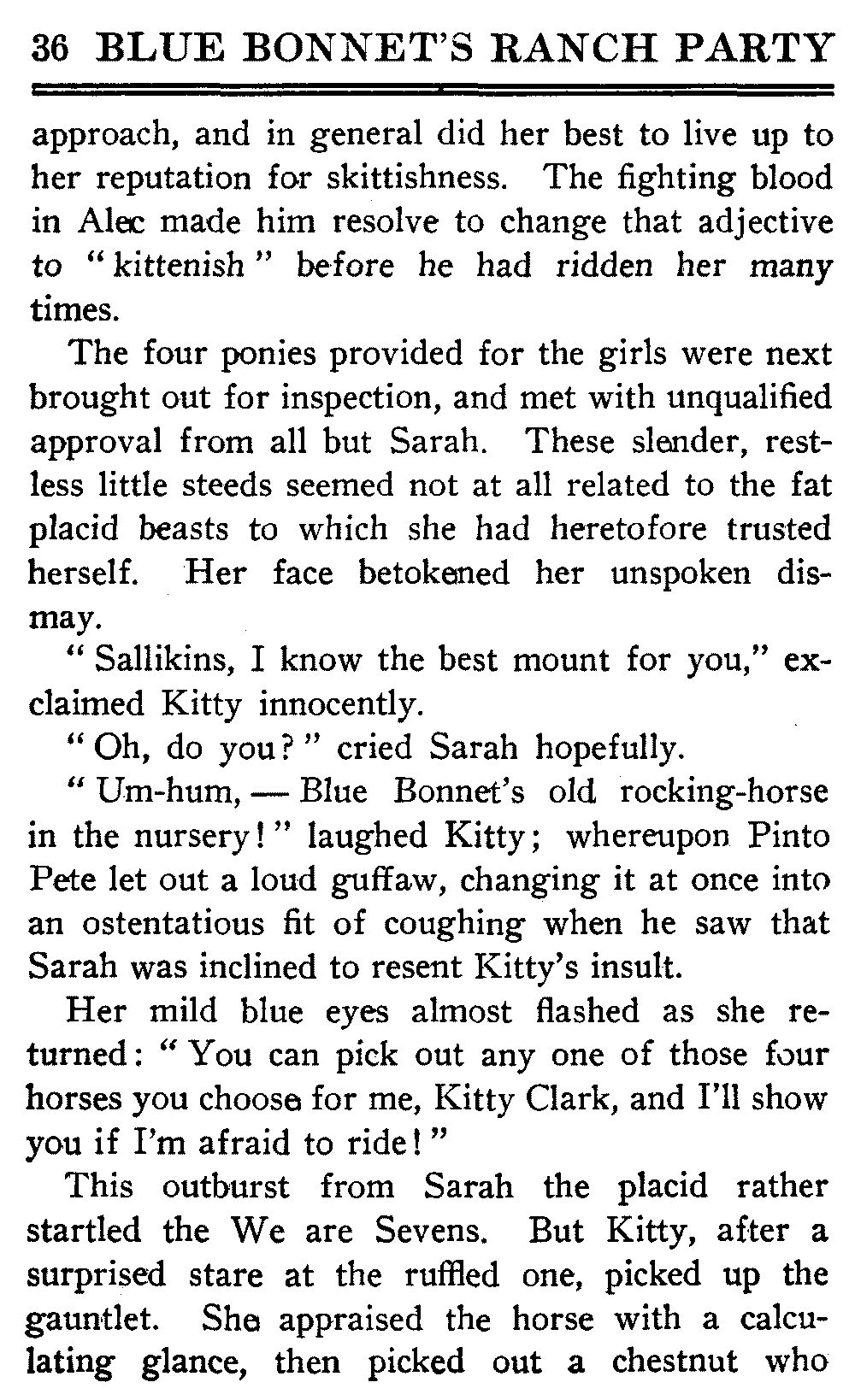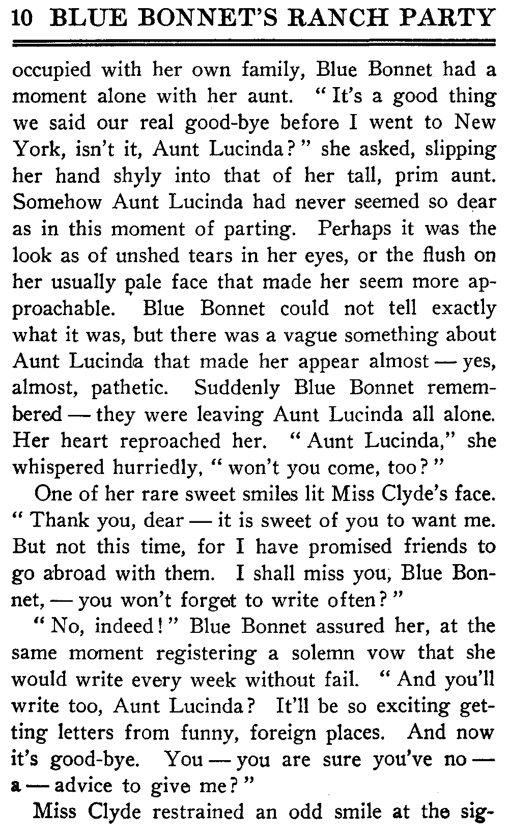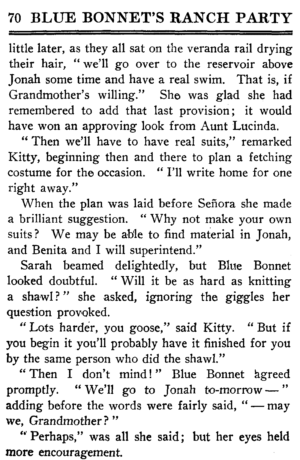 "Oh, I do think a ranch party is the grandest thing in the world," cried Blue Bonnet. "I've read of house parties, but they must be downright tame[4] compared with this kind of a party. And it's not to last just over a week-end either, but two whole months! Why, Uncle Cliff, any ordinary man would be scared to pieces at the prospect."
