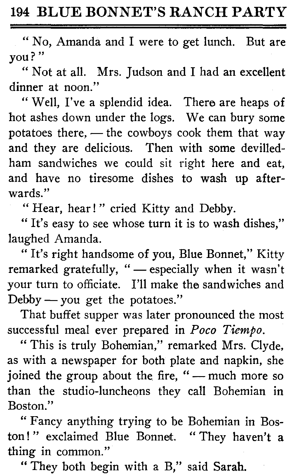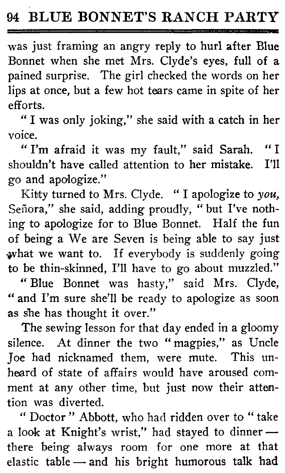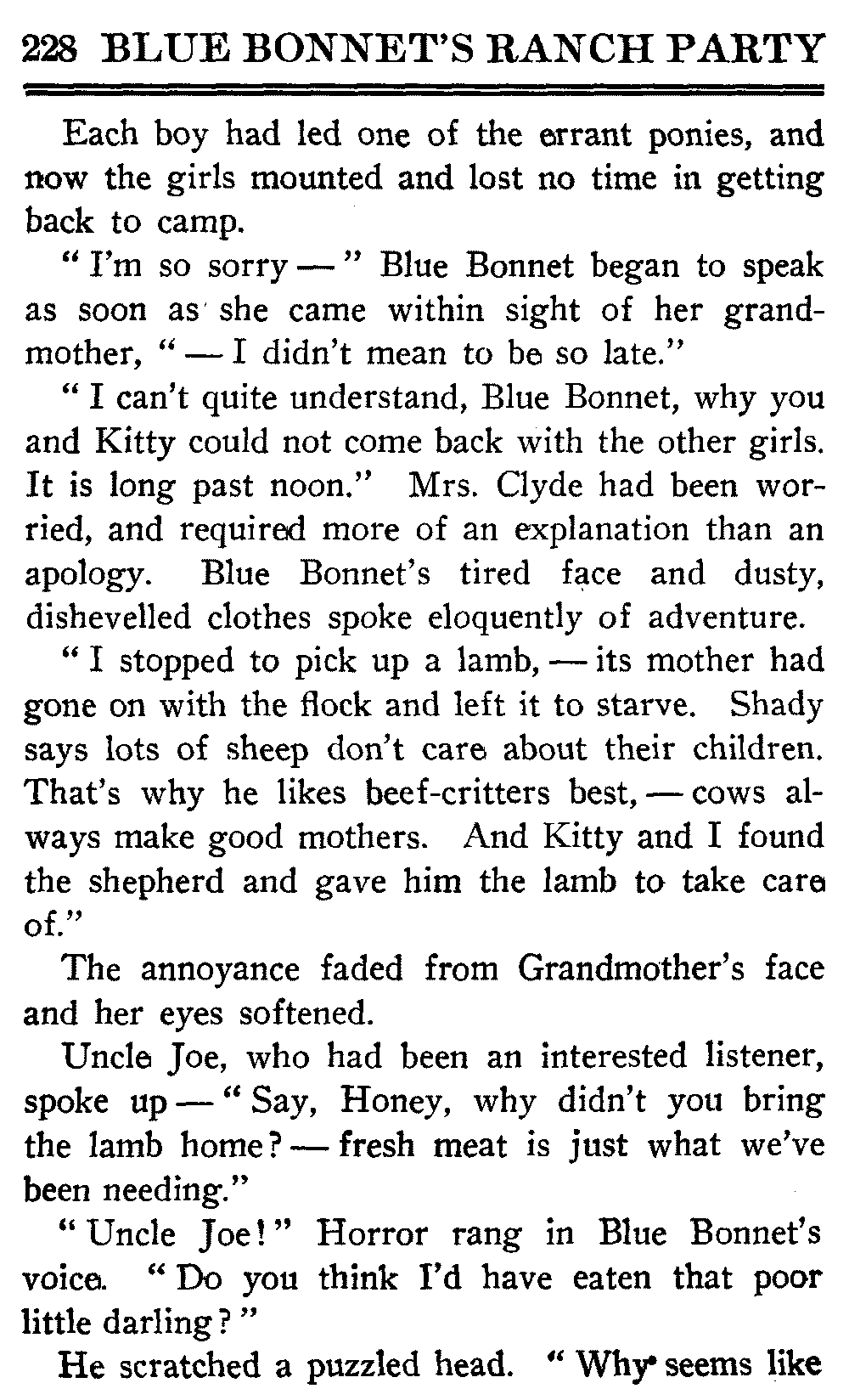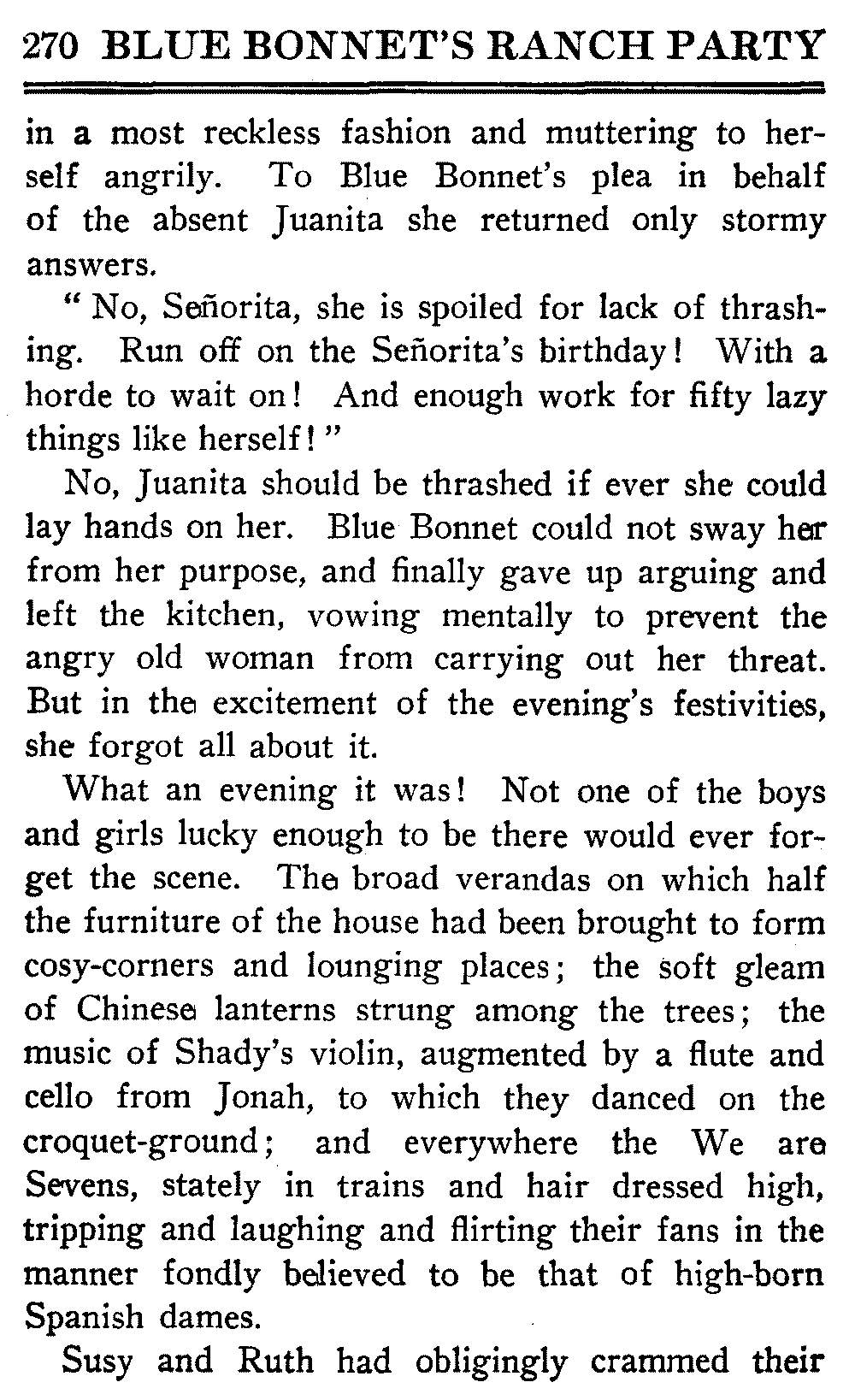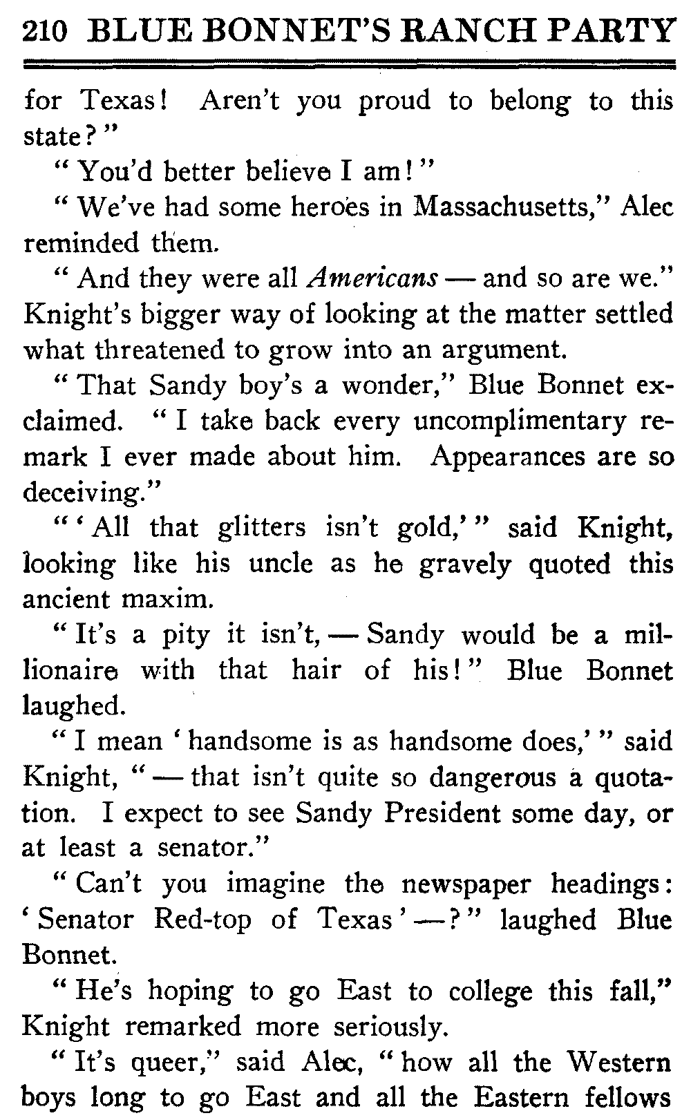 "Oh, I do think a ranch party is the grandest thing in the world," cried Blue Bonnet. "I've read of house parties, but they must be downright tame[4] compared with this kind of a party. And it's not to last just over a week-end either, but two whole months! Why, Uncle Cliff, any ordinary man would be scared to pieces at the prospect."