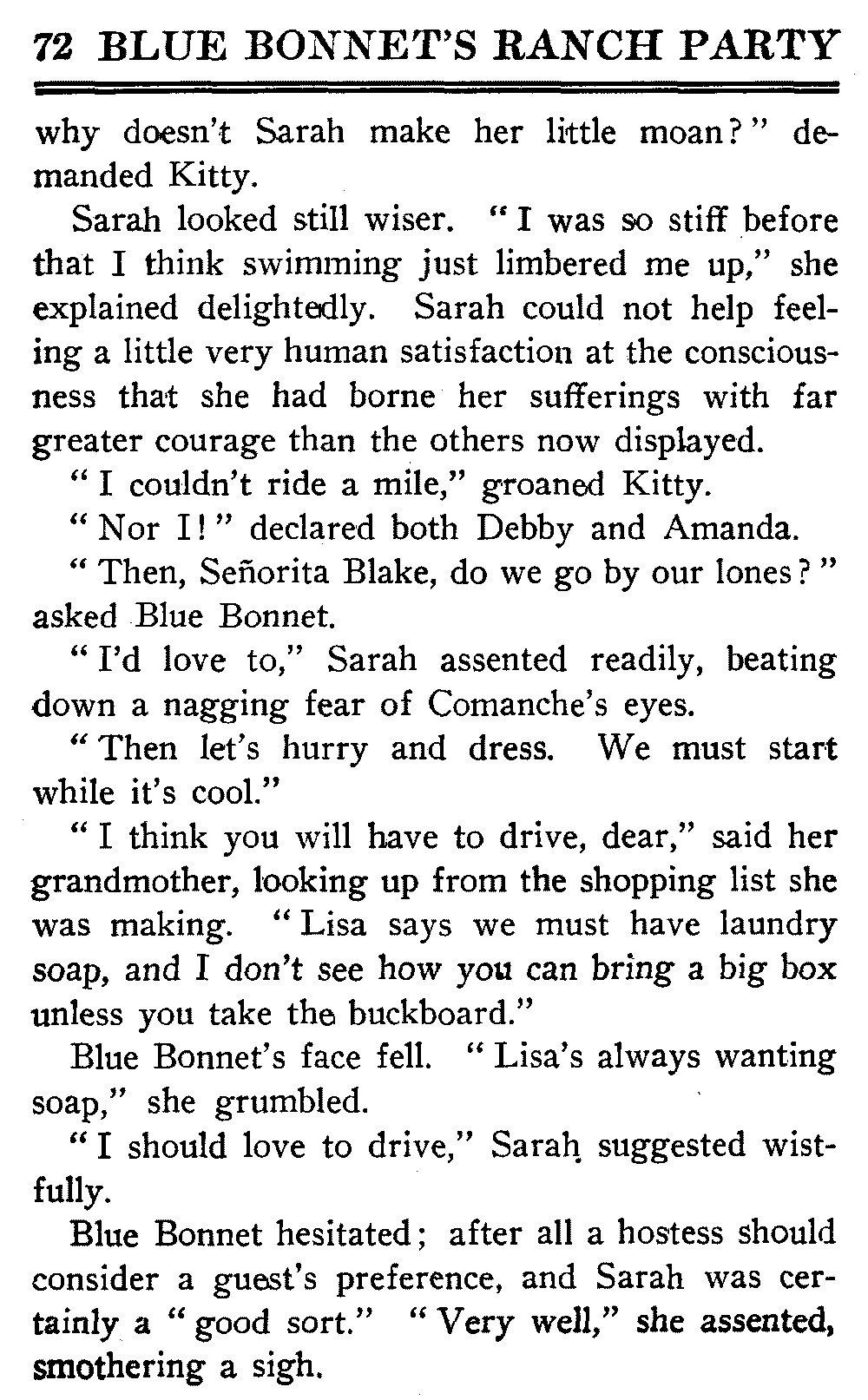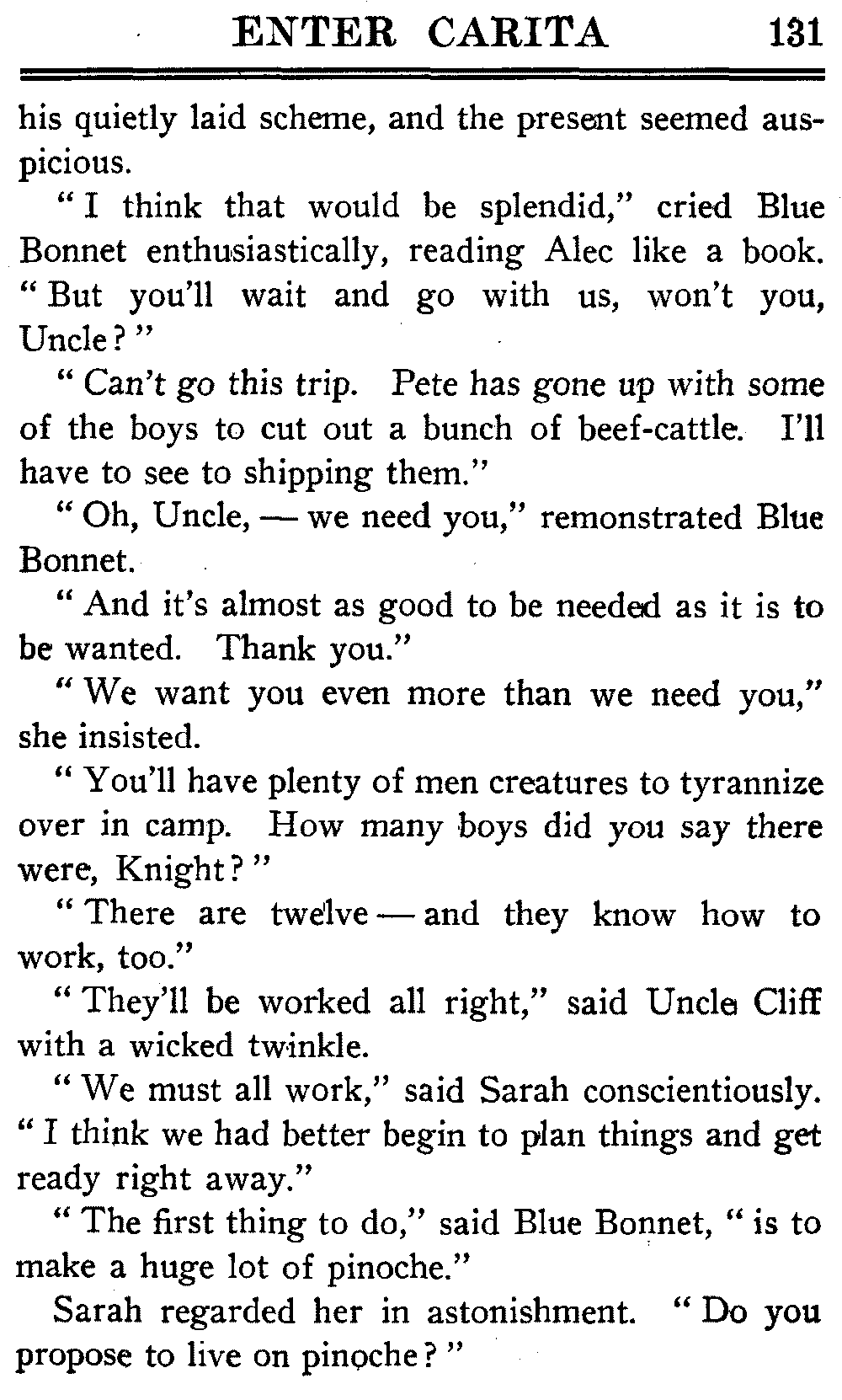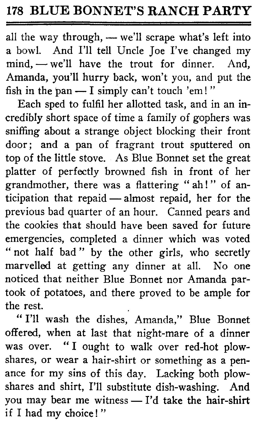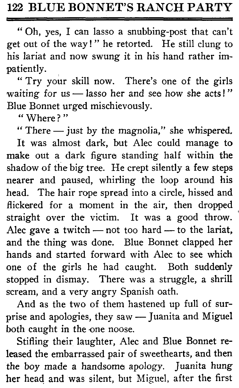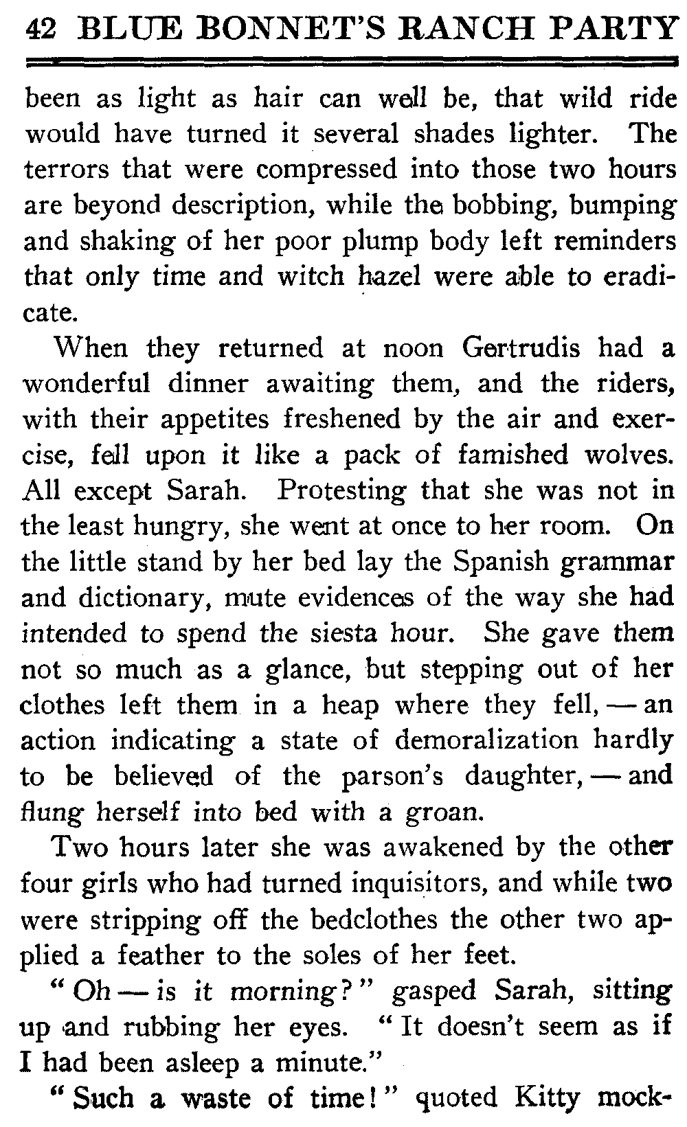 "Oh, I do think a ranch party is the grandest thing in the world," cried Blue Bonnet. "I've read of house parties, but they must be downright tame[4] compared with this kind of a party. And it's not to last just over a week-end either, but two whole months! Why, Uncle Cliff, any ordinary man would be scared to pieces at the prospect."