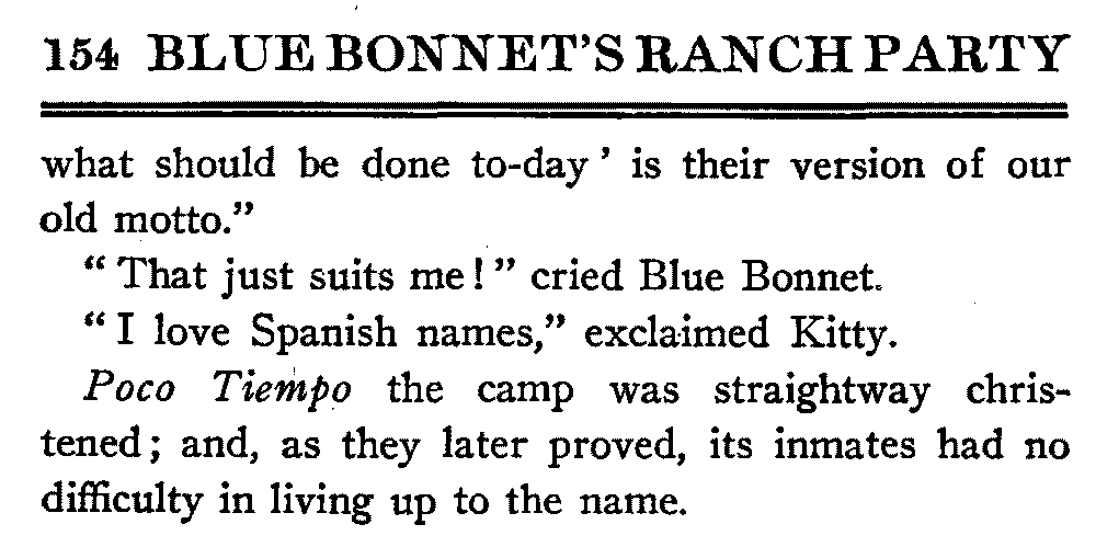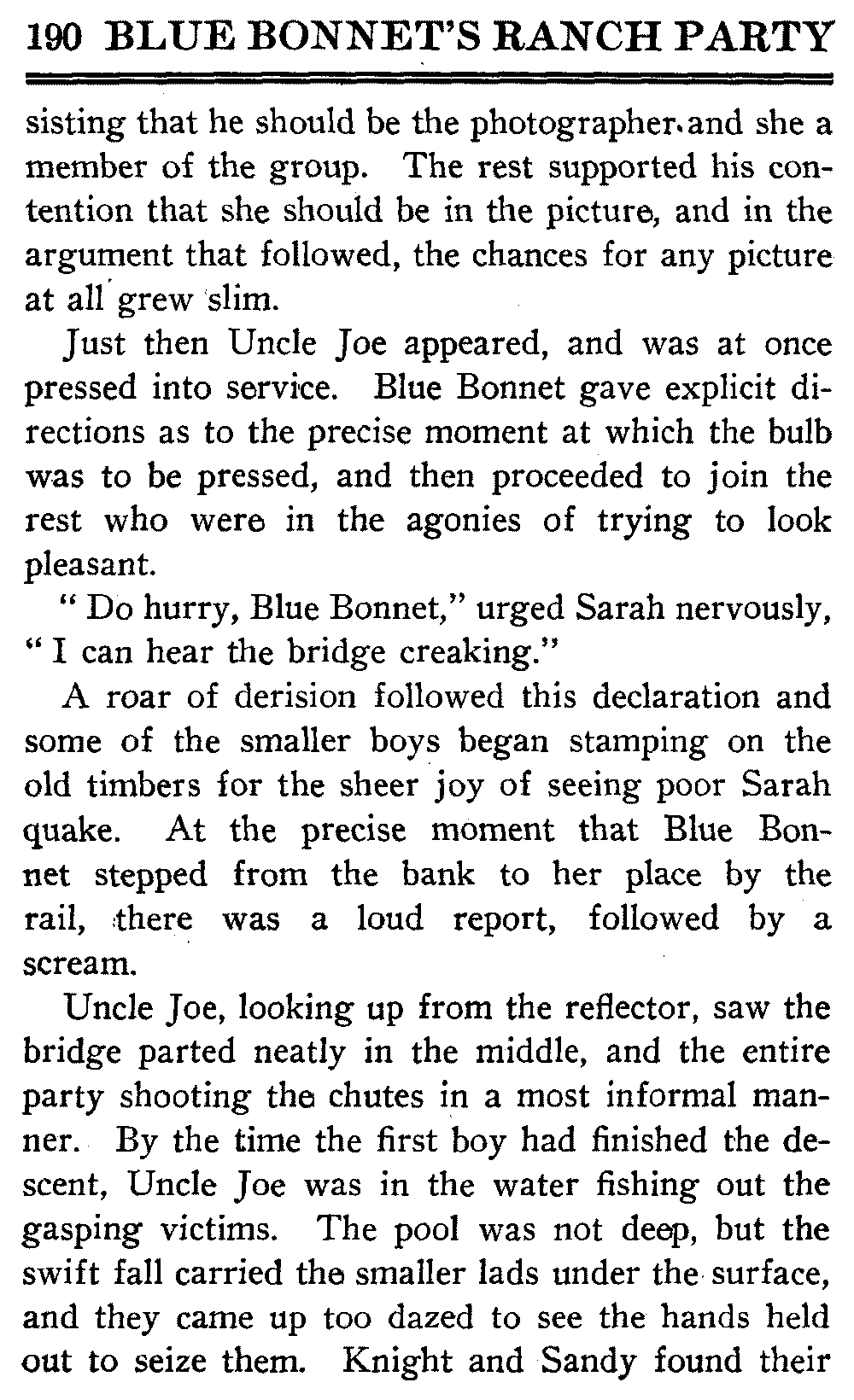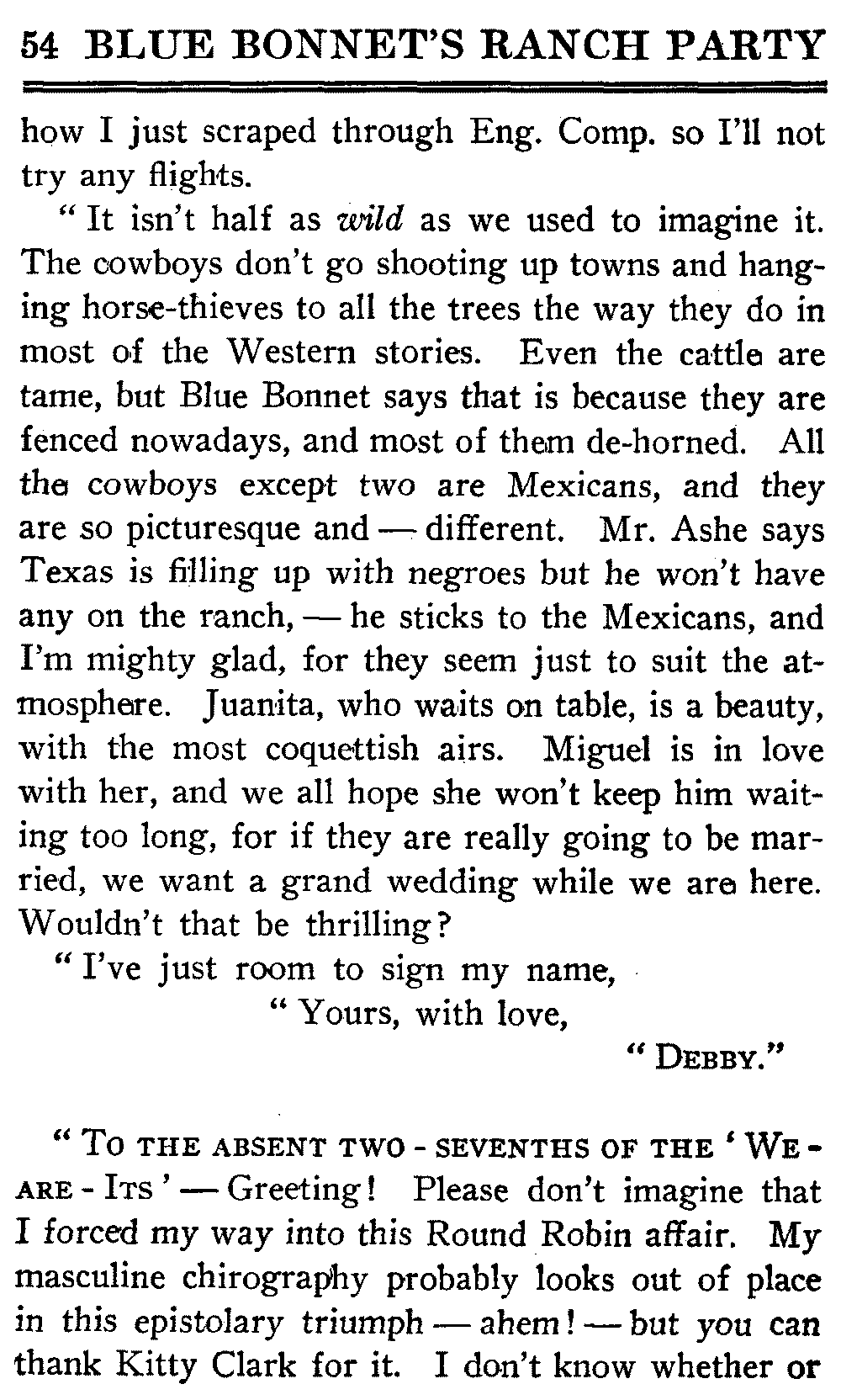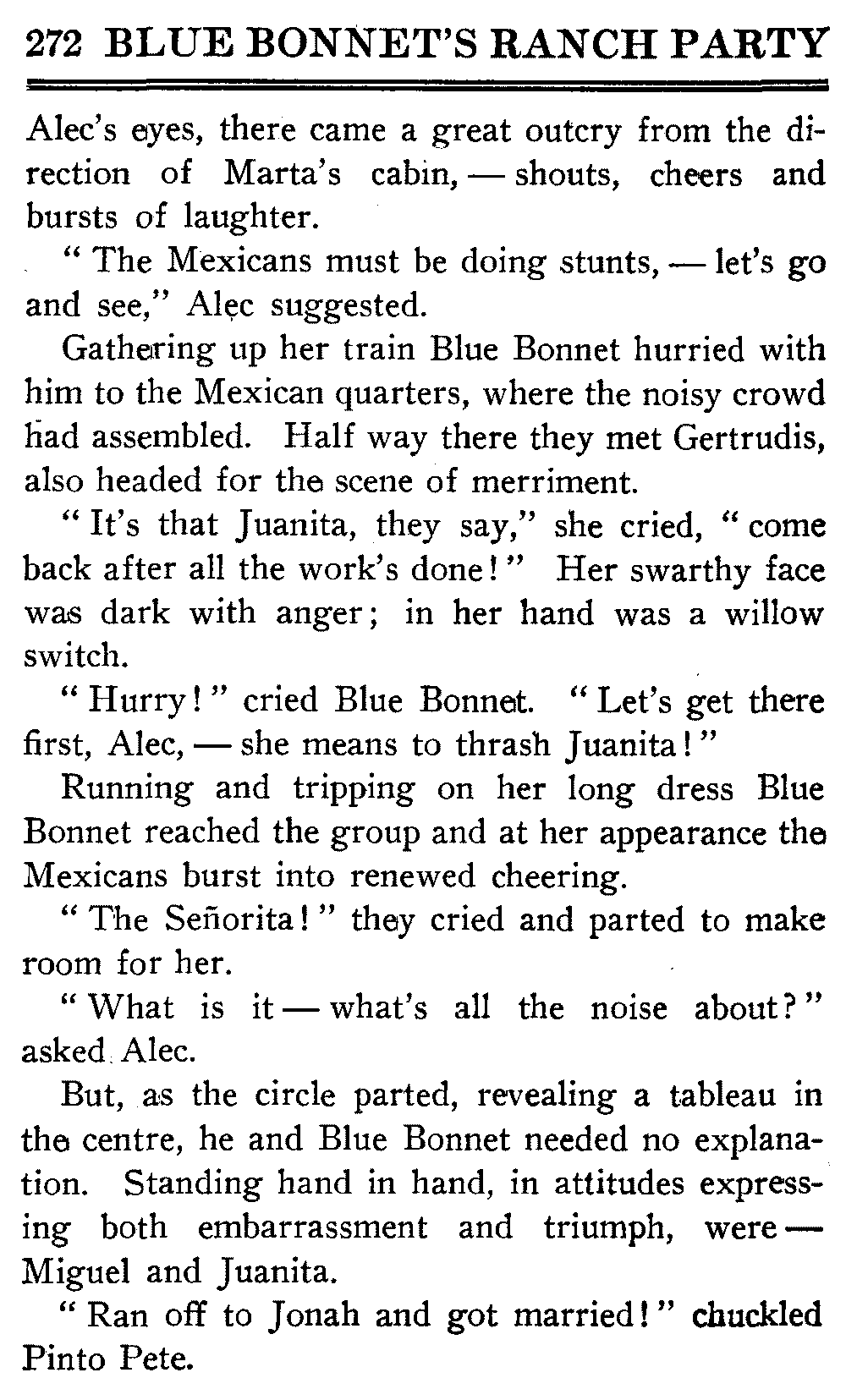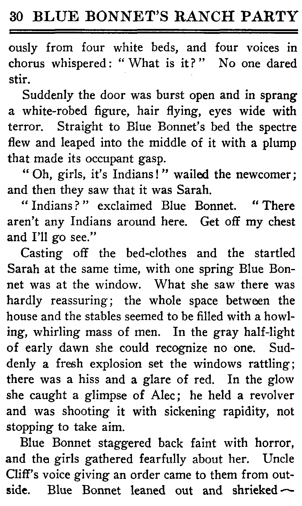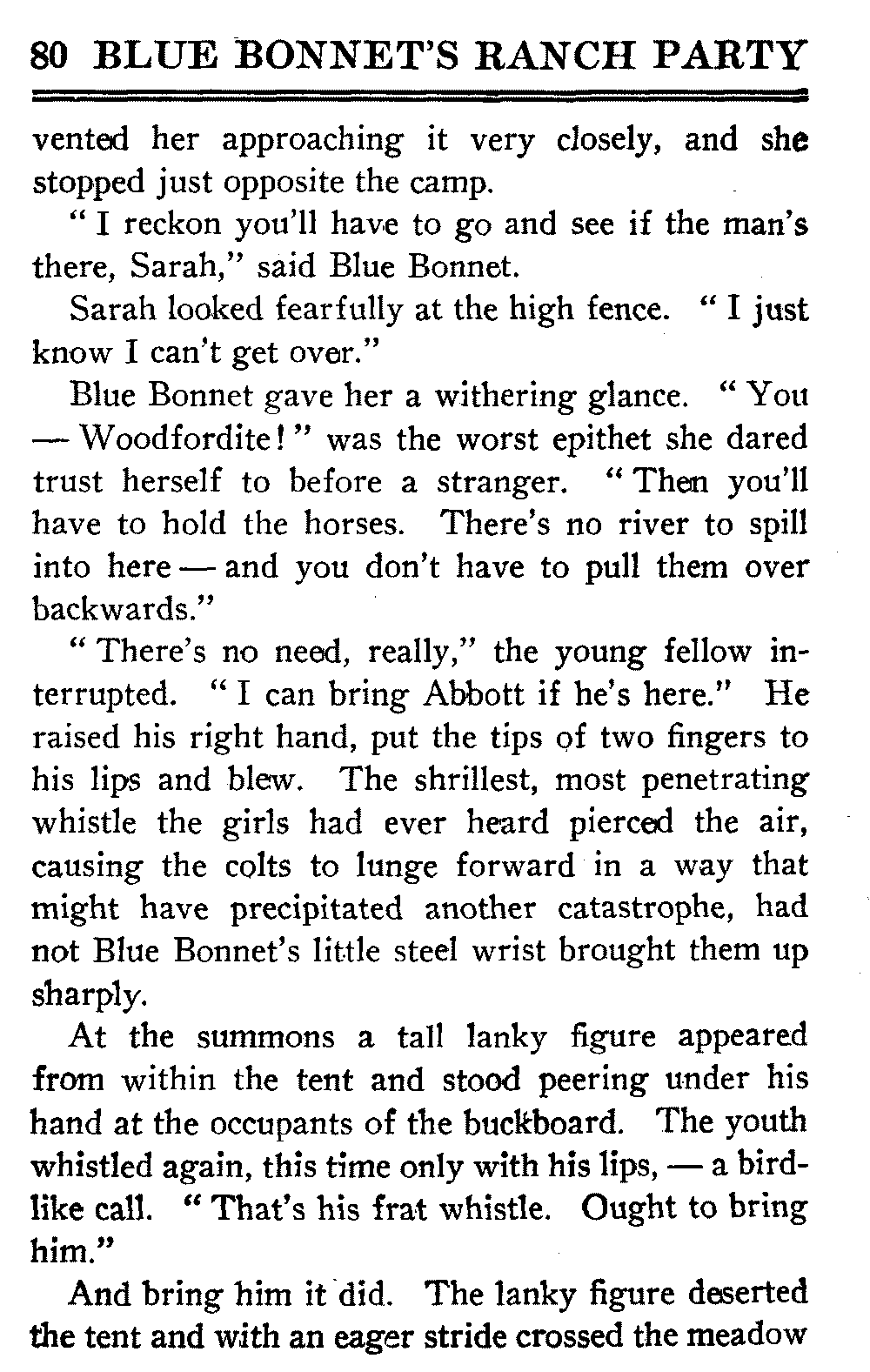 "Oh, I do think a ranch party is the grandest thing in the world," cried Blue Bonnet. "I've read of house parties, but they must be downright tame[4] compared with this kind of a party. And it's not to last just over a week-end either, but two whole months! Why, Uncle Cliff, any ordinary man would be scared to pieces at the prospect."