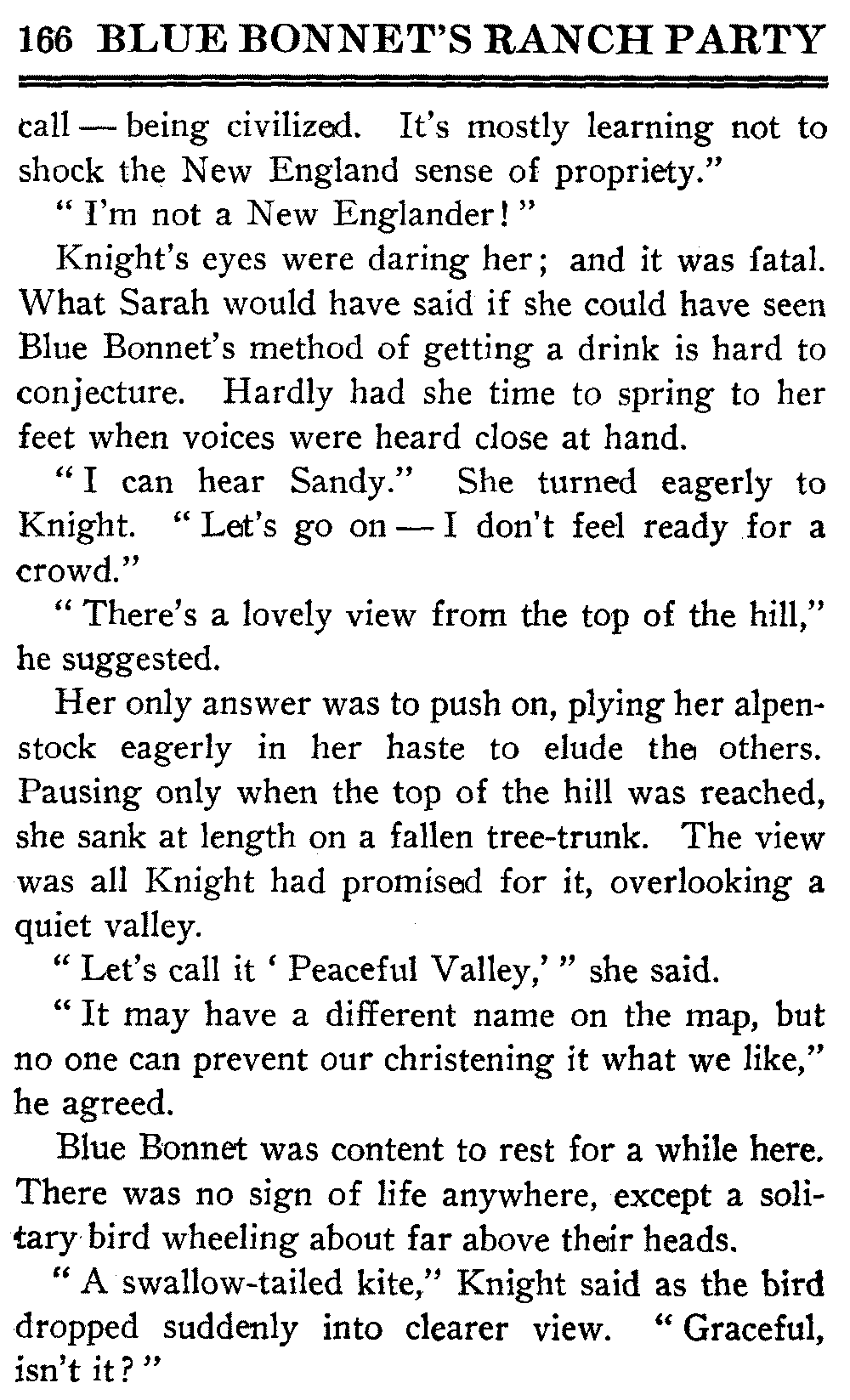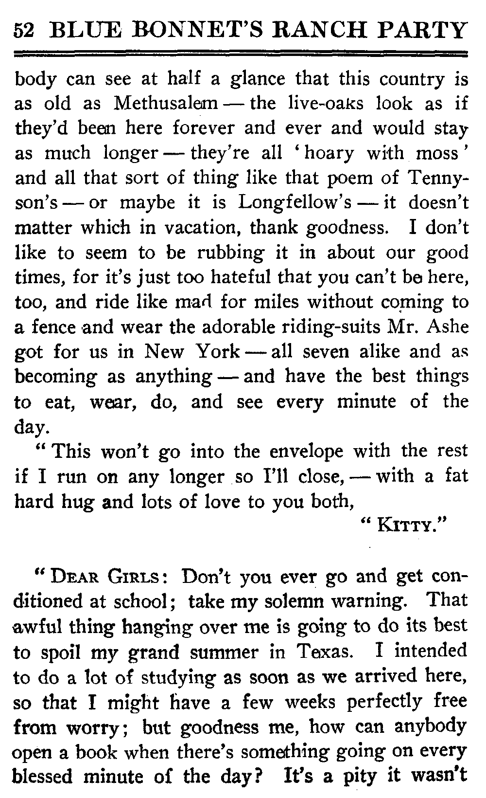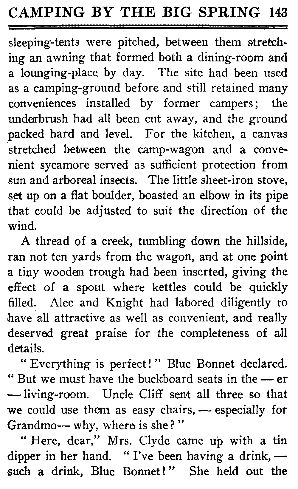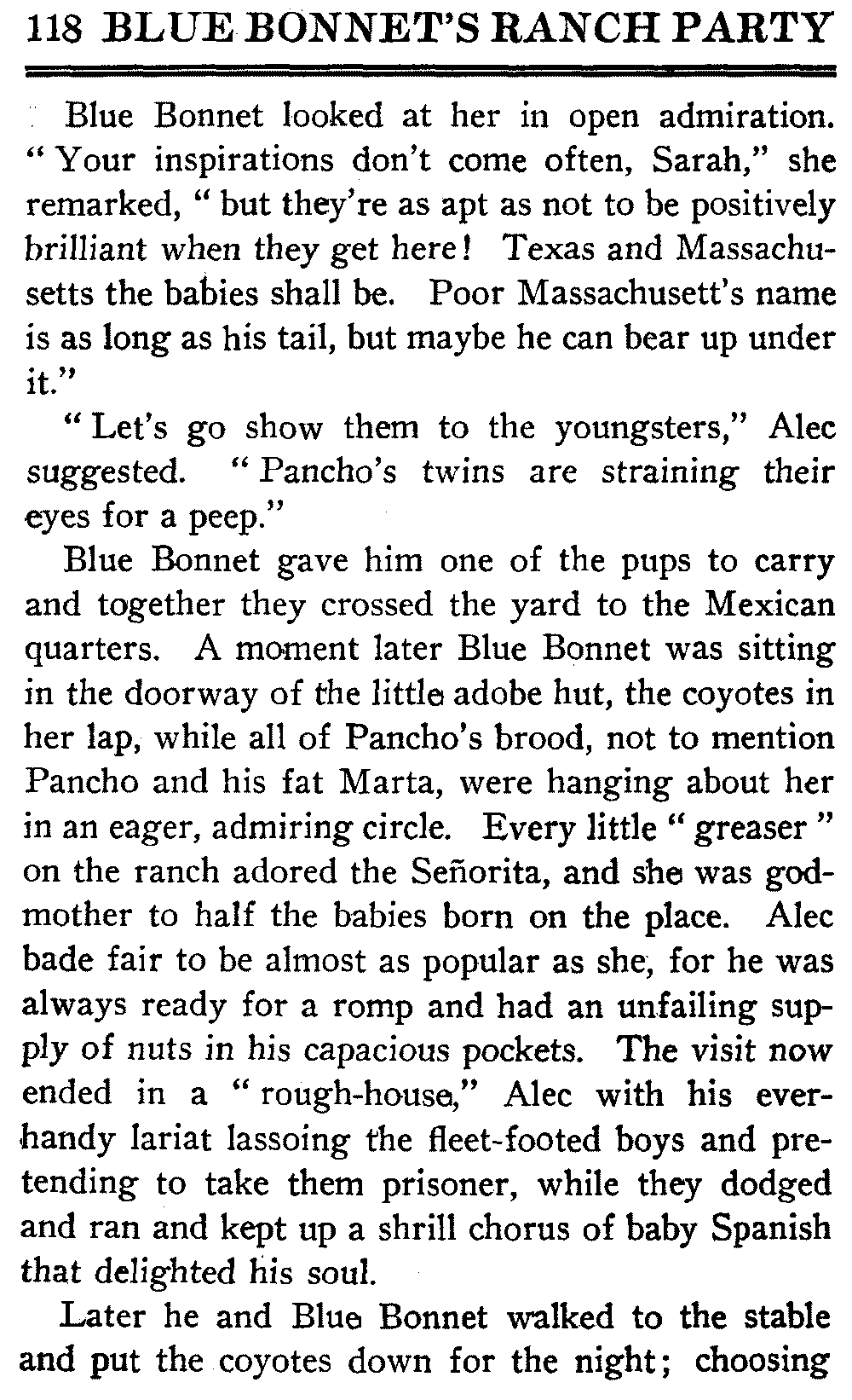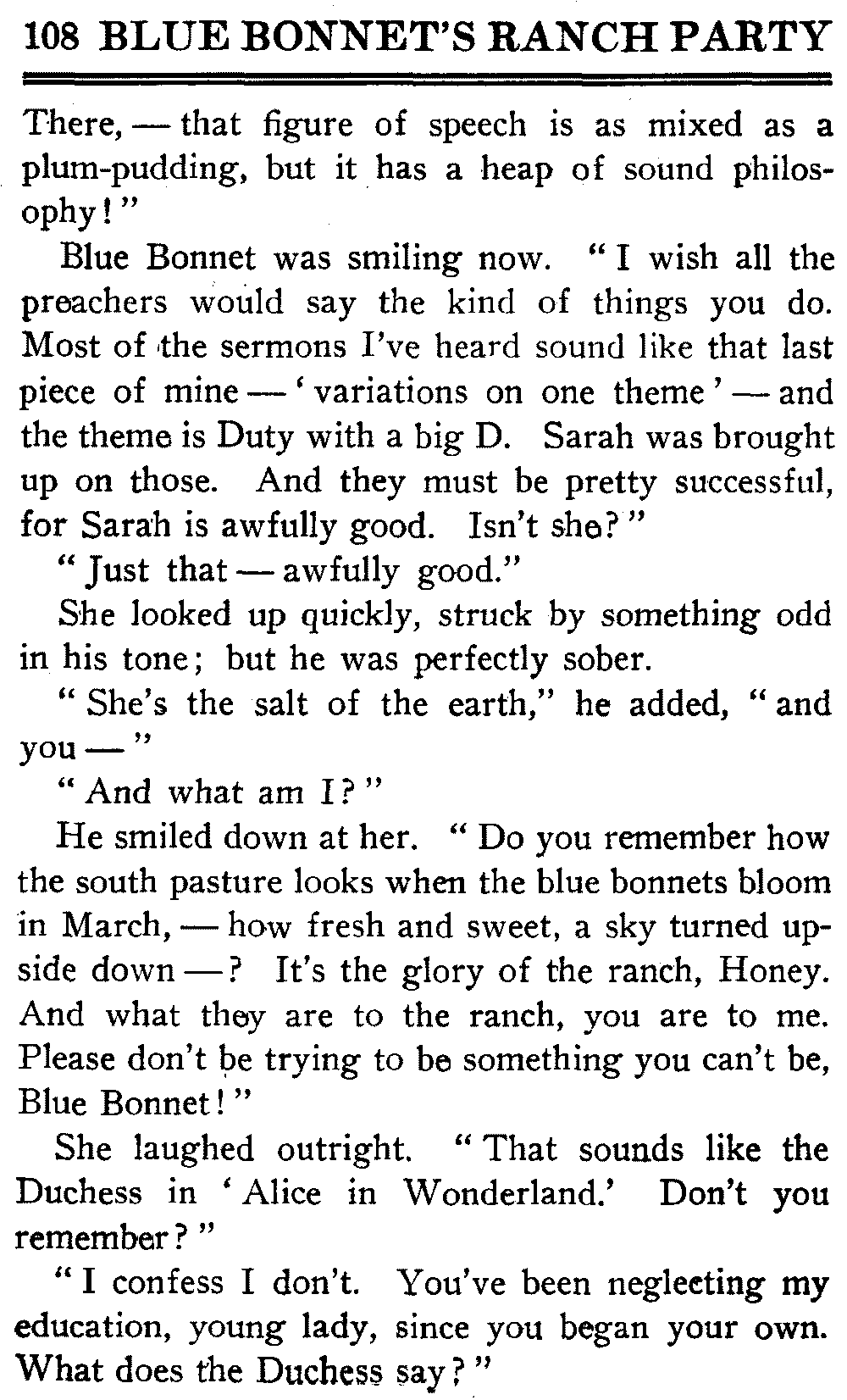 "Oh, I do think a ranch party is the grandest thing in the world," cried Blue Bonnet. "I've read of house parties, but they must be downright tame[4] compared with this kind of a party. And it's not to last just over a week-end either, but two whole months! Why, Uncle Cliff, any ordinary man would be scared to pieces at the prospect."