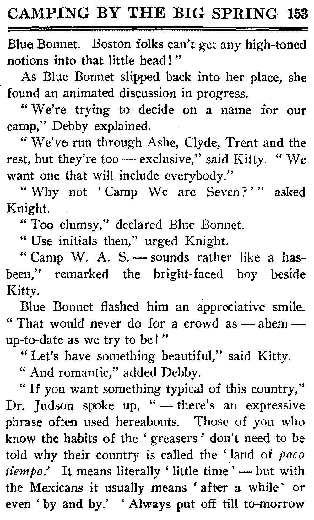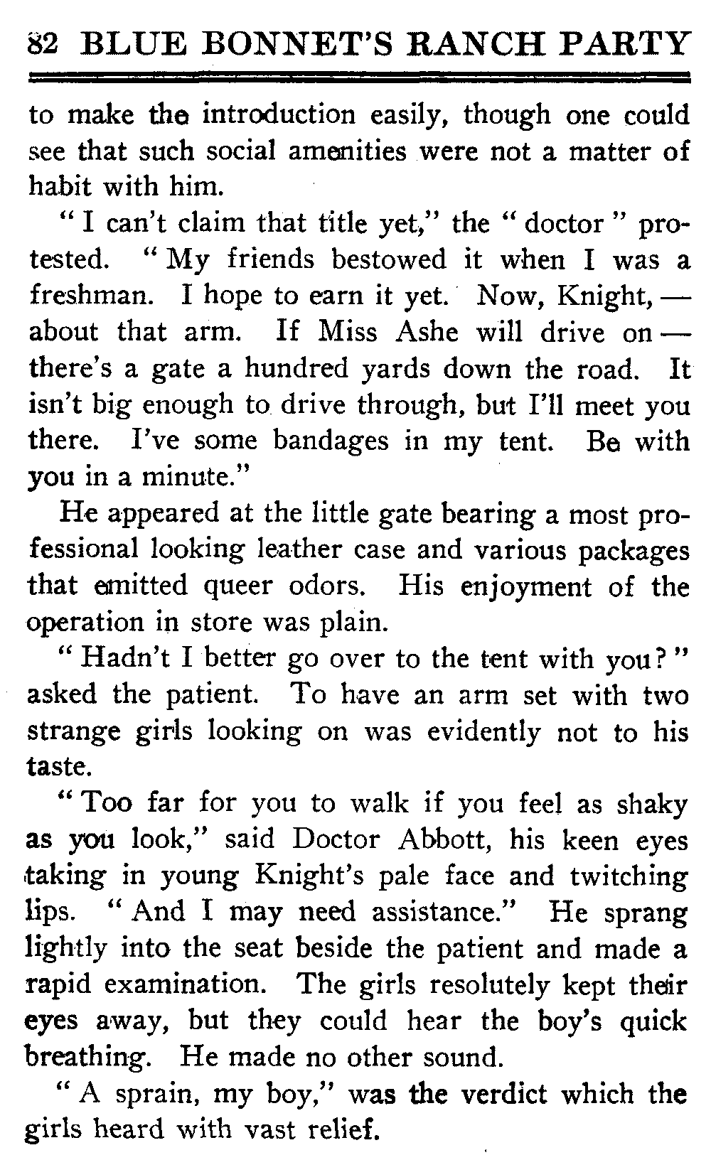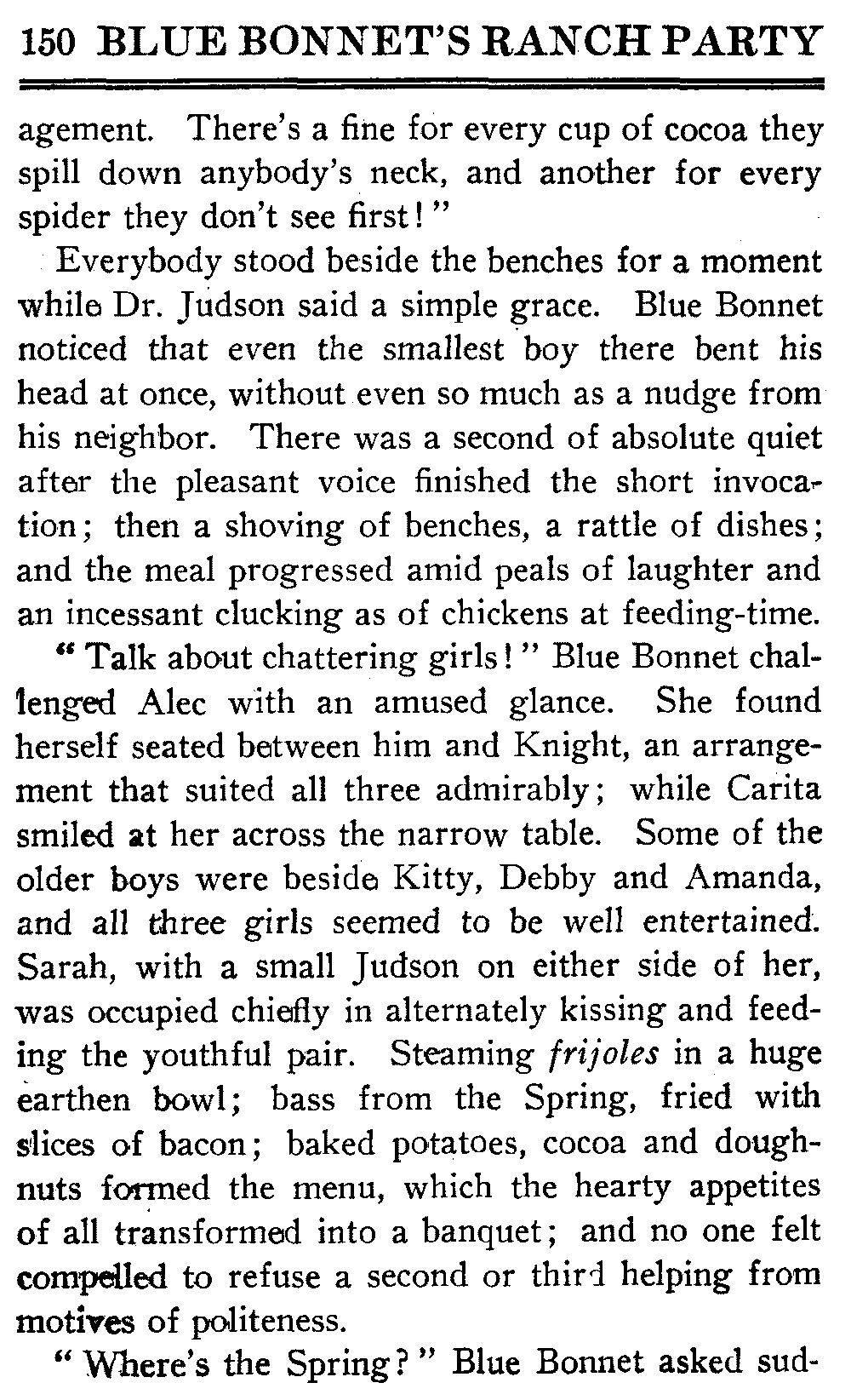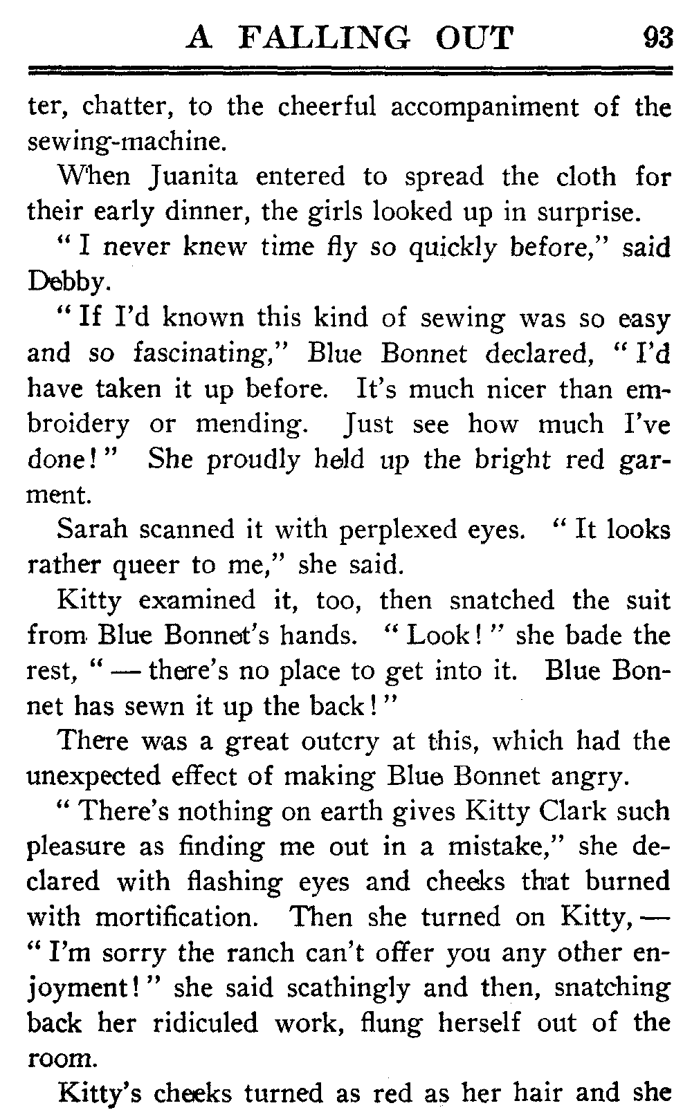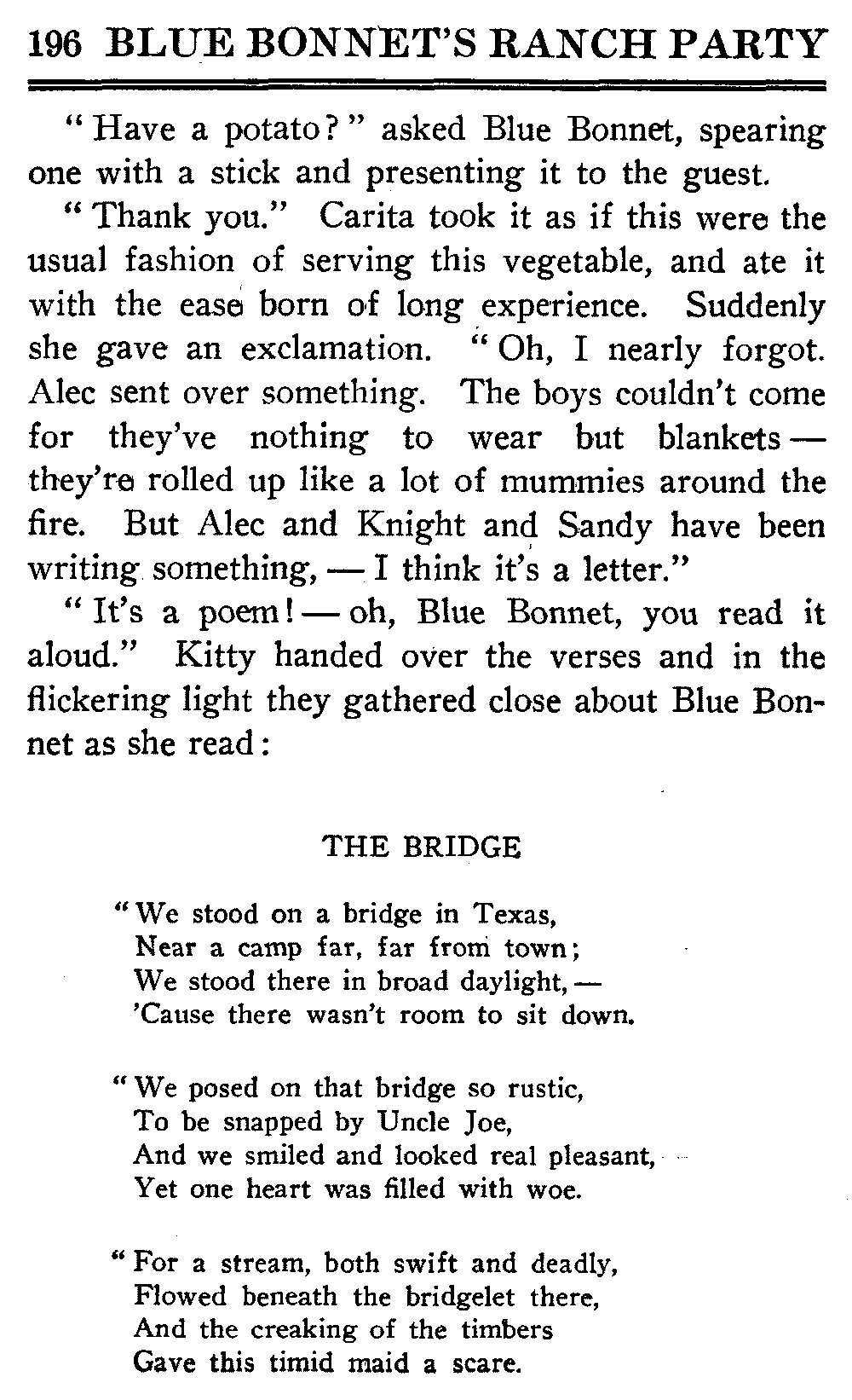 "Oh, I do think a ranch party is the grandest thing in the world," cried Blue Bonnet. "I've read of house parties, but they must be downright tame[4] compared with this kind of a party. And it's not to last just over a week-end either, but two whole months! Why, Uncle Cliff, any ordinary man would be scared to pieces at the prospect."