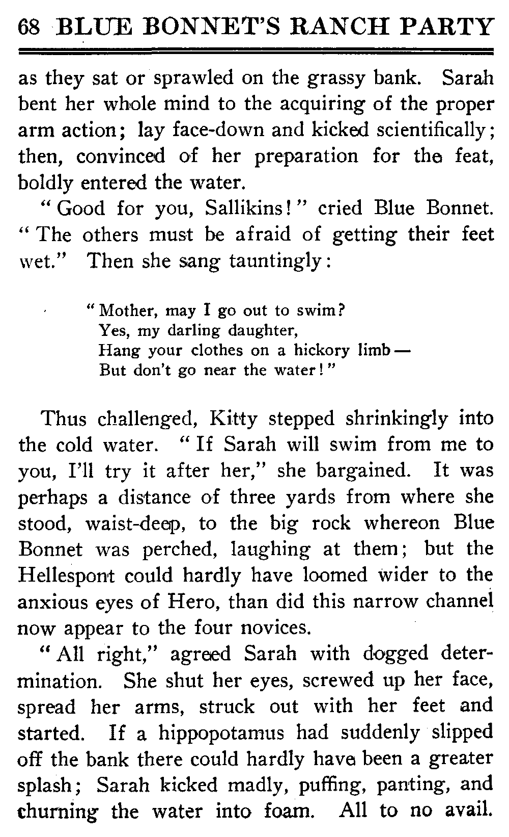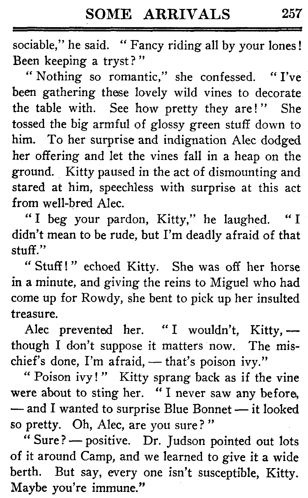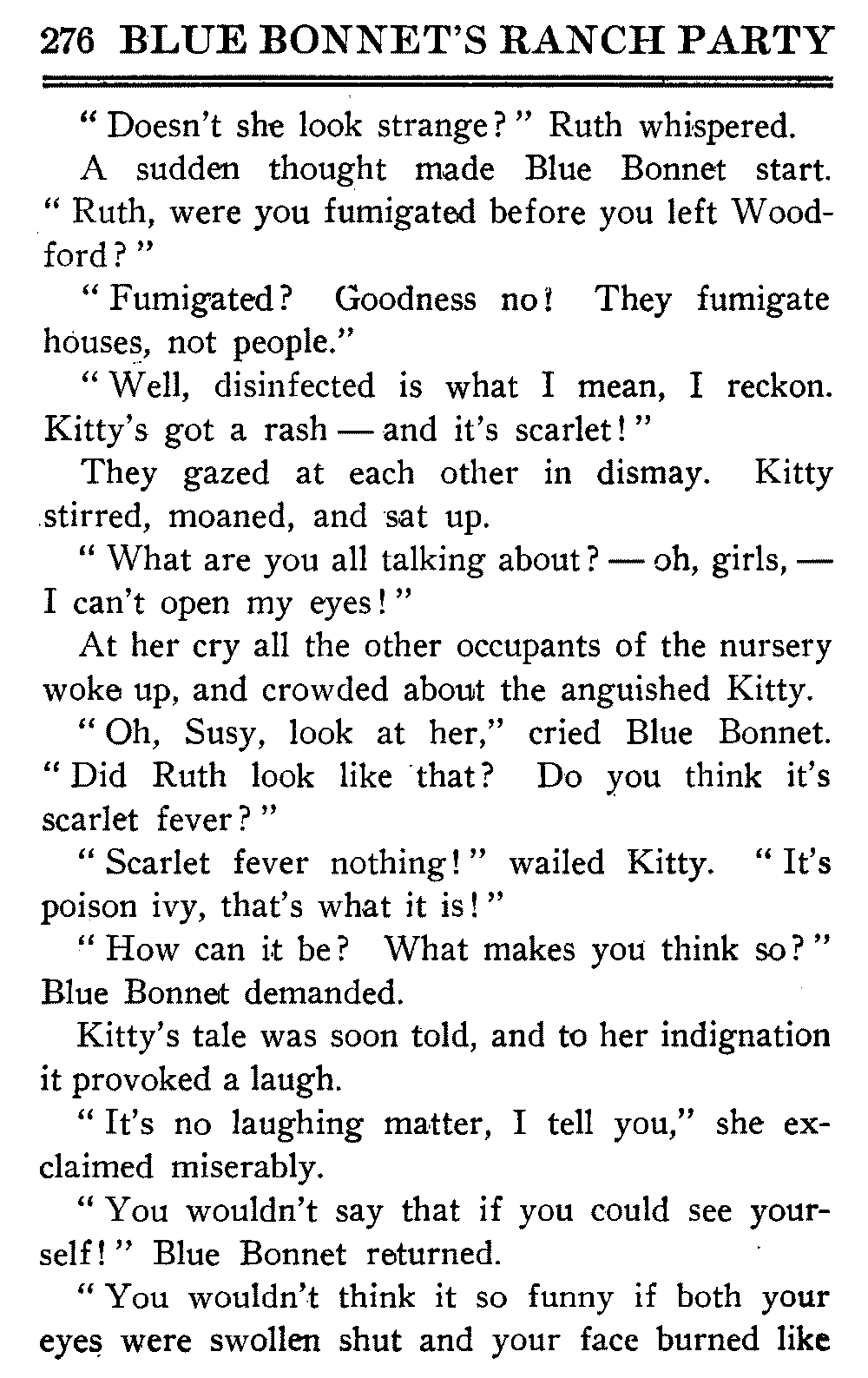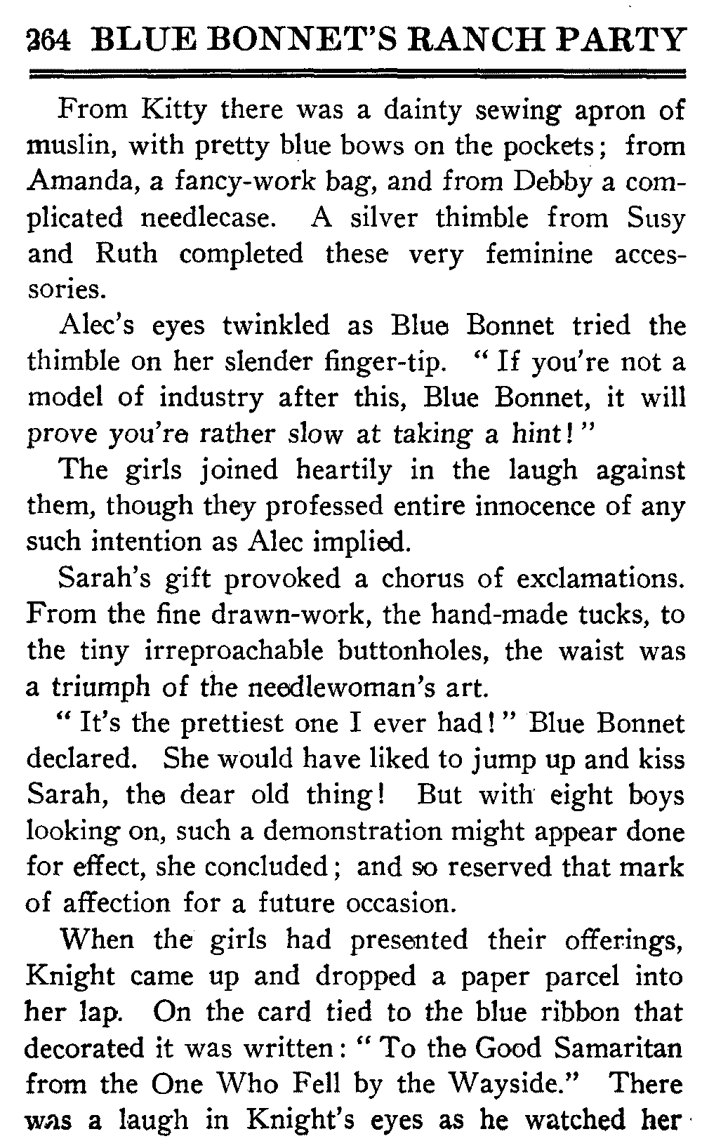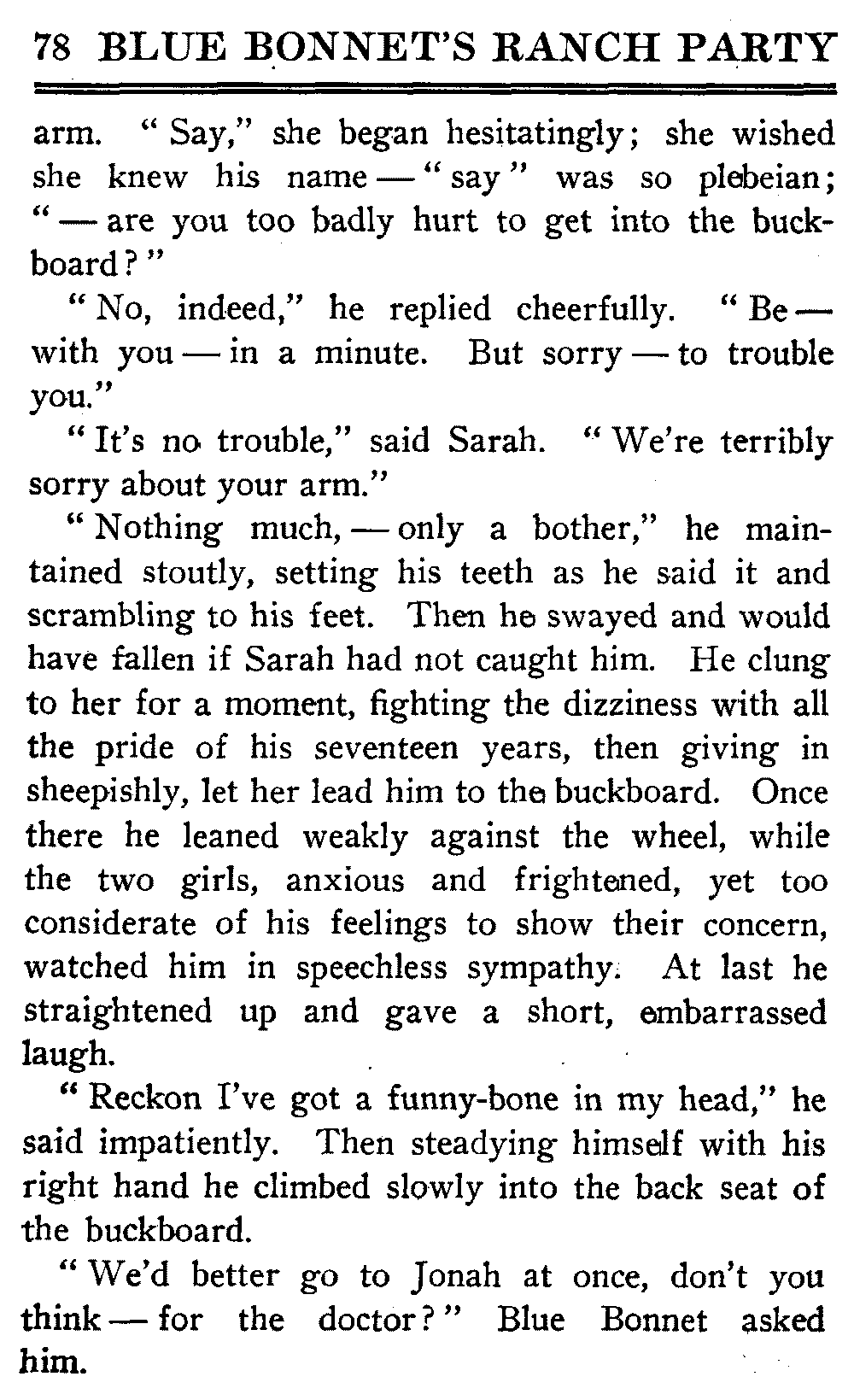 "Oh, I do think a ranch party is the grandest thing in the world," cried Blue Bonnet. "I've read of house parties, but they must be downright tame[4] compared with this kind of a party. And it's not to last just over a week-end either, but two whole months! Why, Uncle Cliff, any ordinary man would be scared to pieces at the prospect."