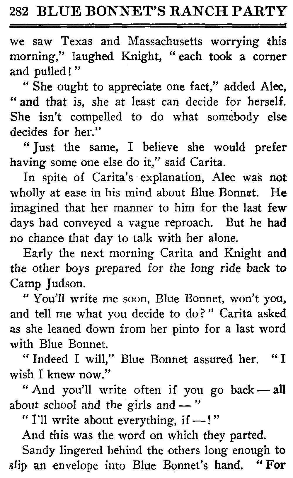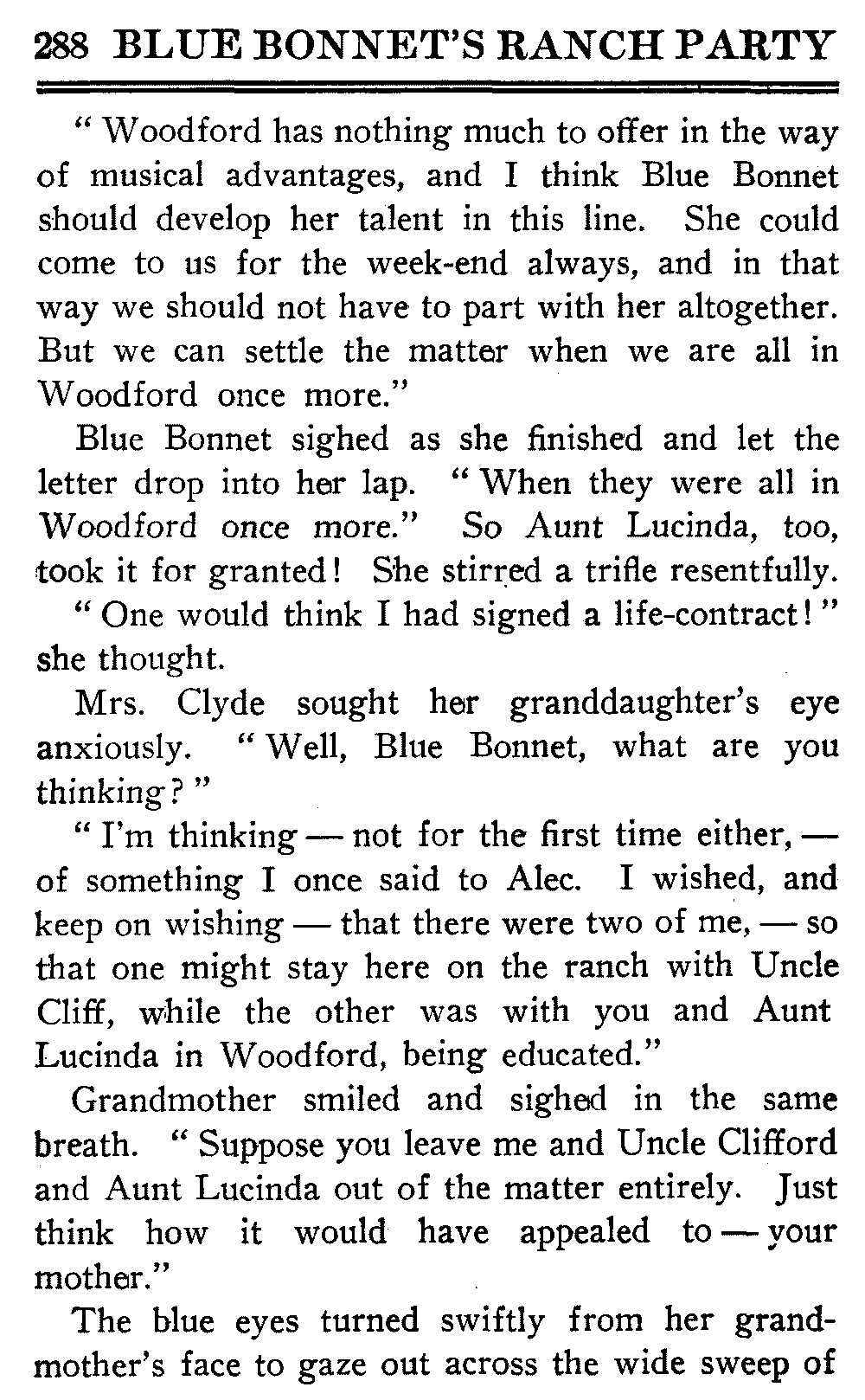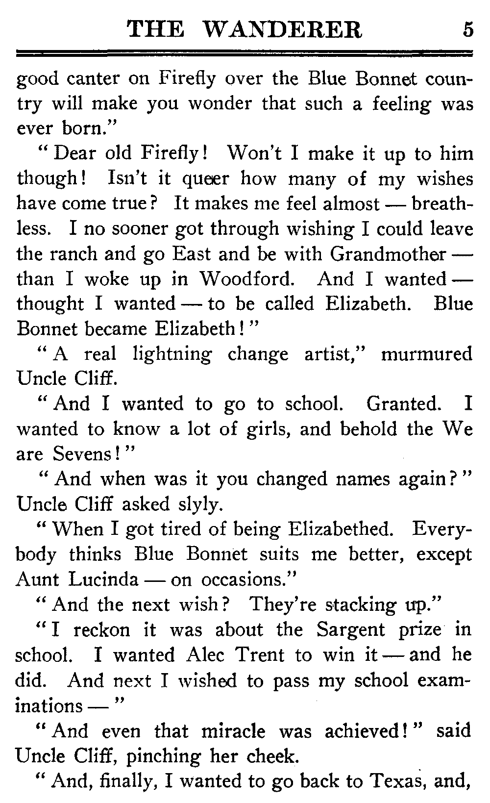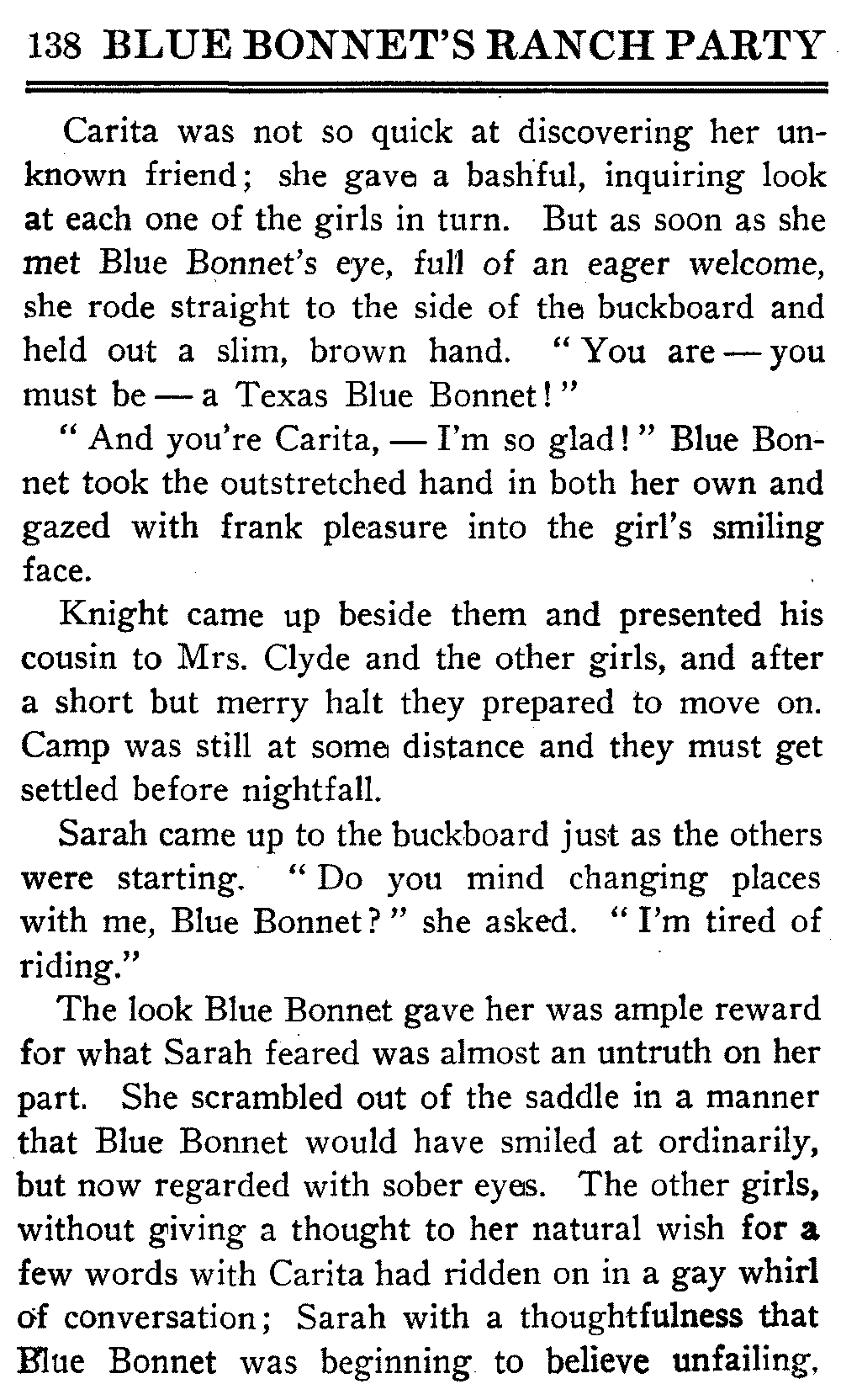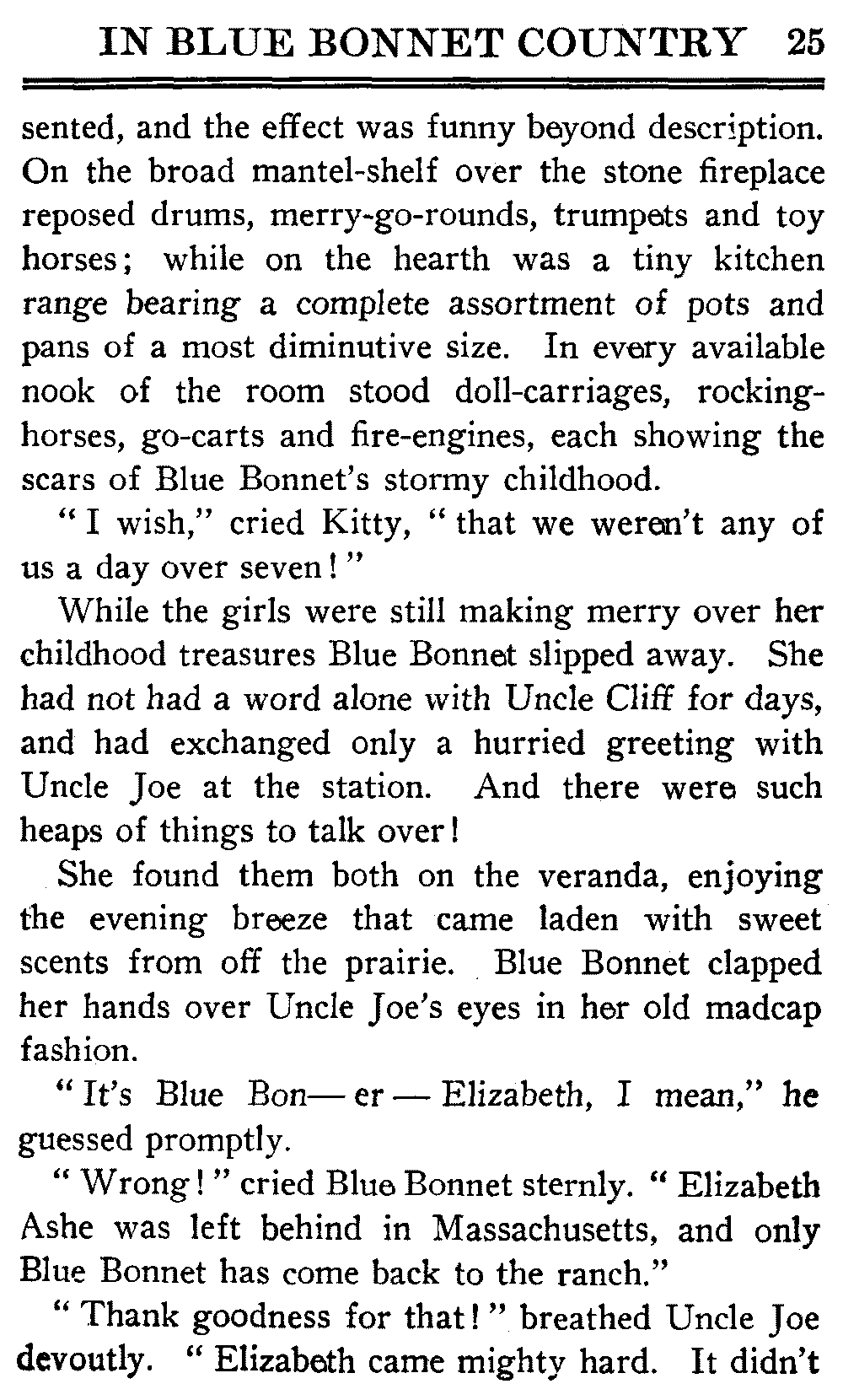 "Dear old Firefly! Won't I make it up to him though! Isn't it queer how many of my wishes have come true? It makes me feel almost—breathless. I no sooner got through wishing I could leave the ranch and go East and be with Grandmother—than I woke up in Woodford. And I wanted—thought I wanted—to be called Elizabeth. Blue Bonnet became Elizabeth!"