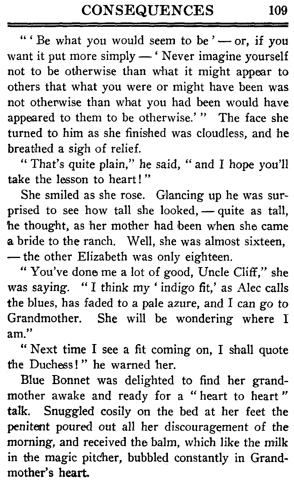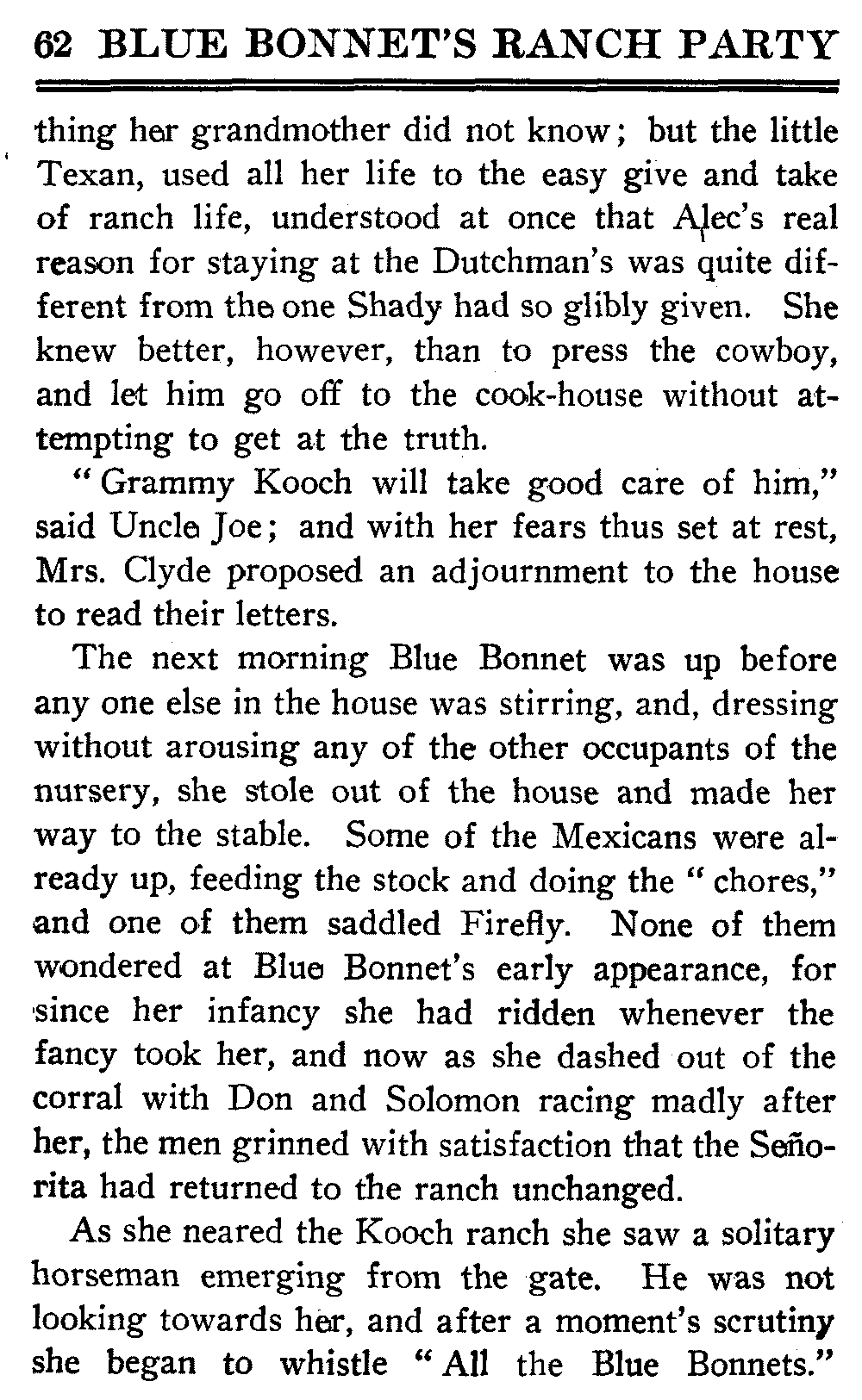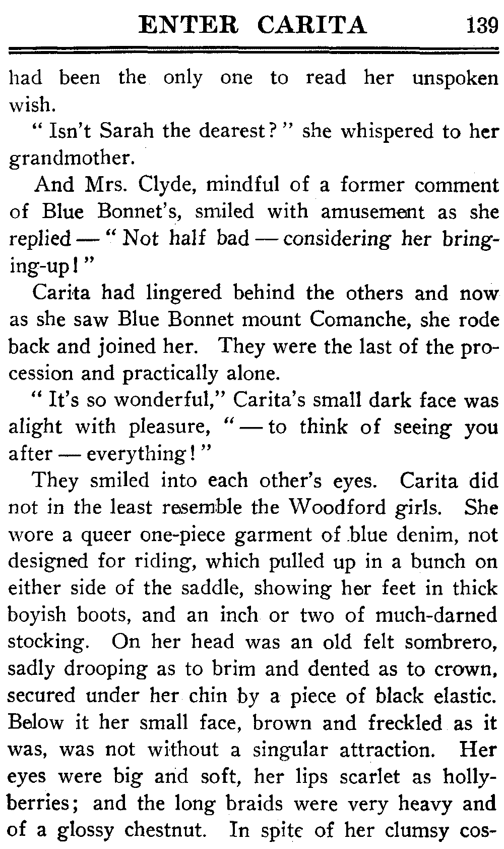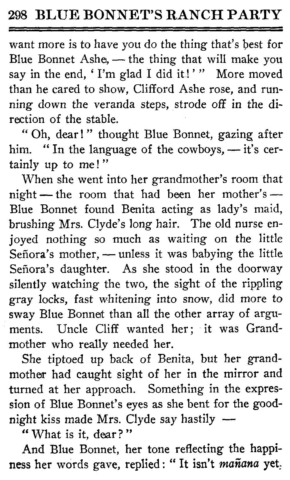 "Dear old Firefly! Won't I make it up to him though! Isn't it queer how many of my wishes have come true? It makes me feel almost—breathless. I no sooner got through wishing I could leave the ranch and go East and be with Grandmother—than I woke up in Woodford. And I wanted—thought I wanted—to be called Elizabeth. Blue Bonnet became Elizabeth!"