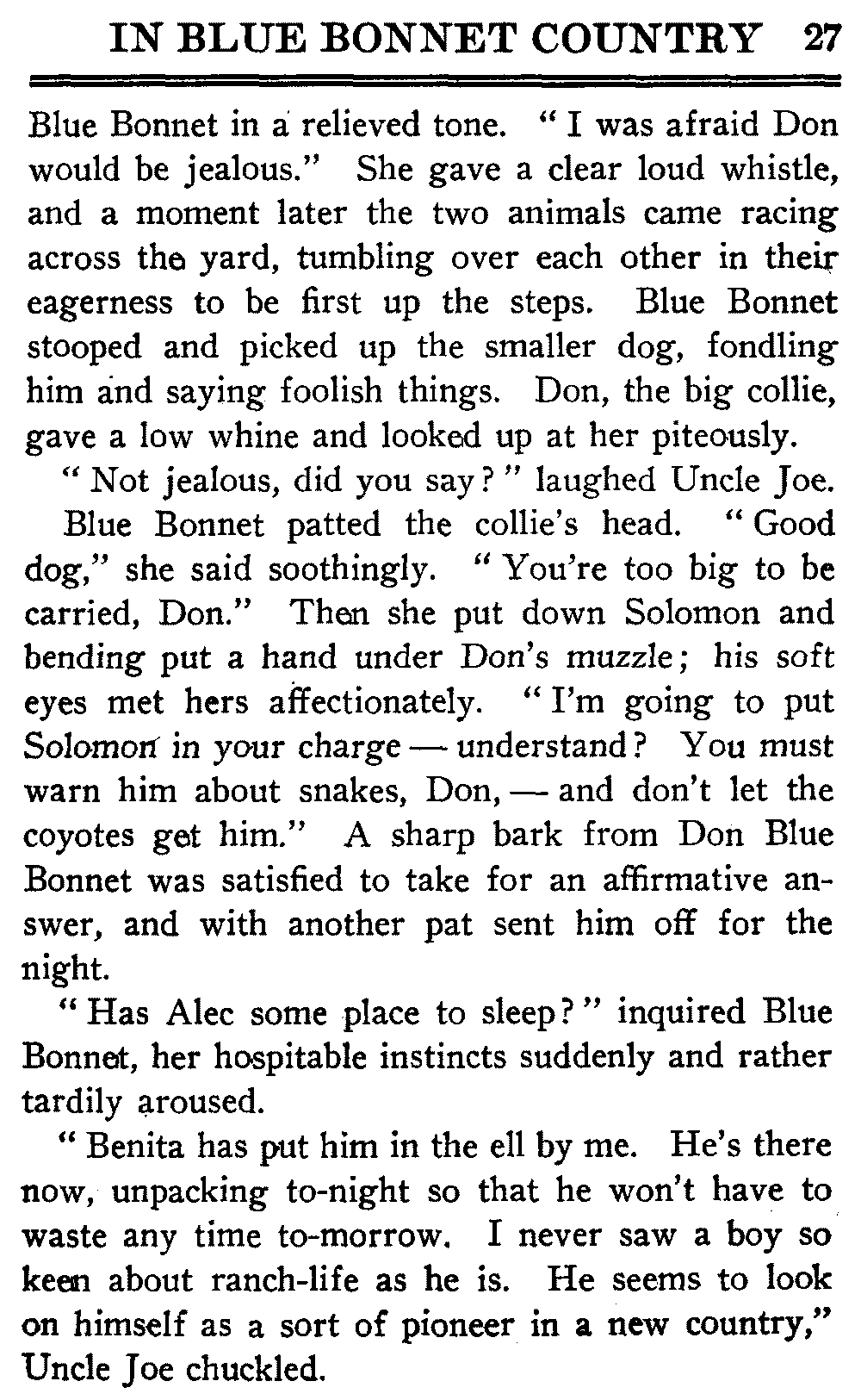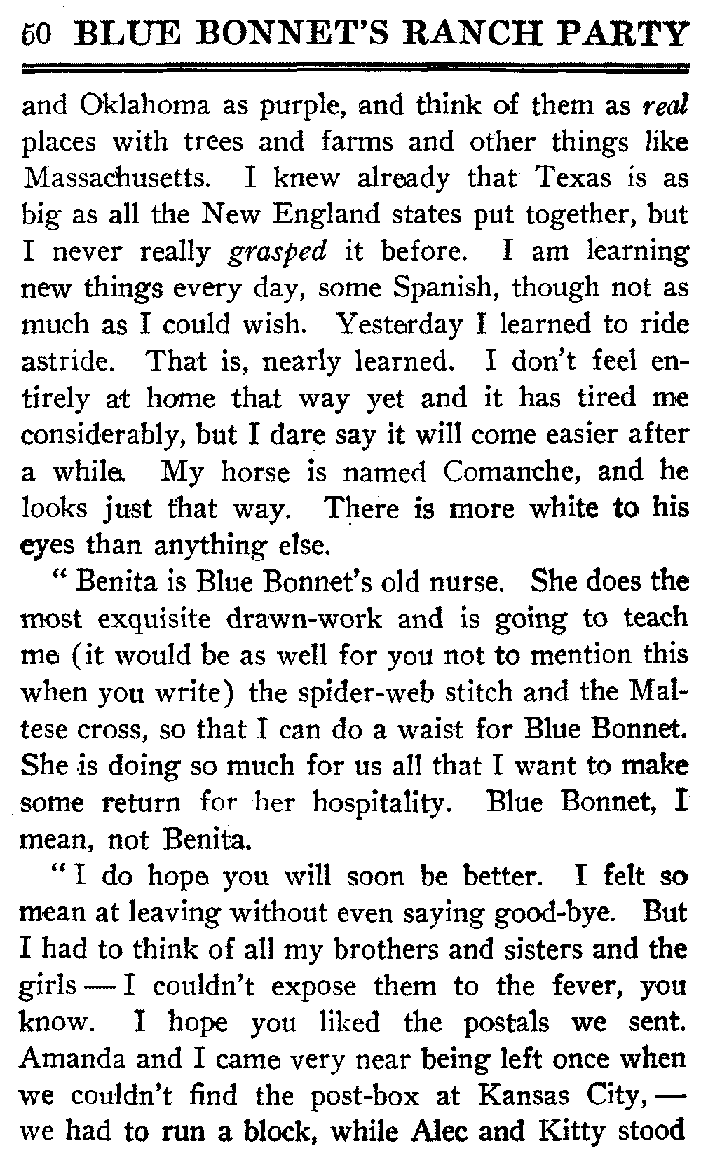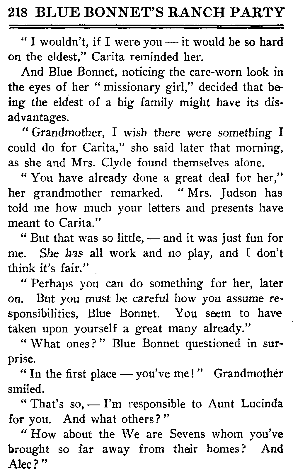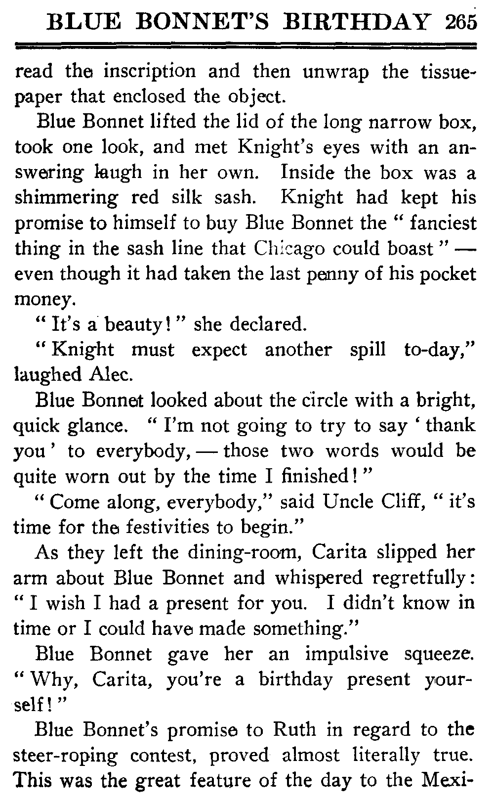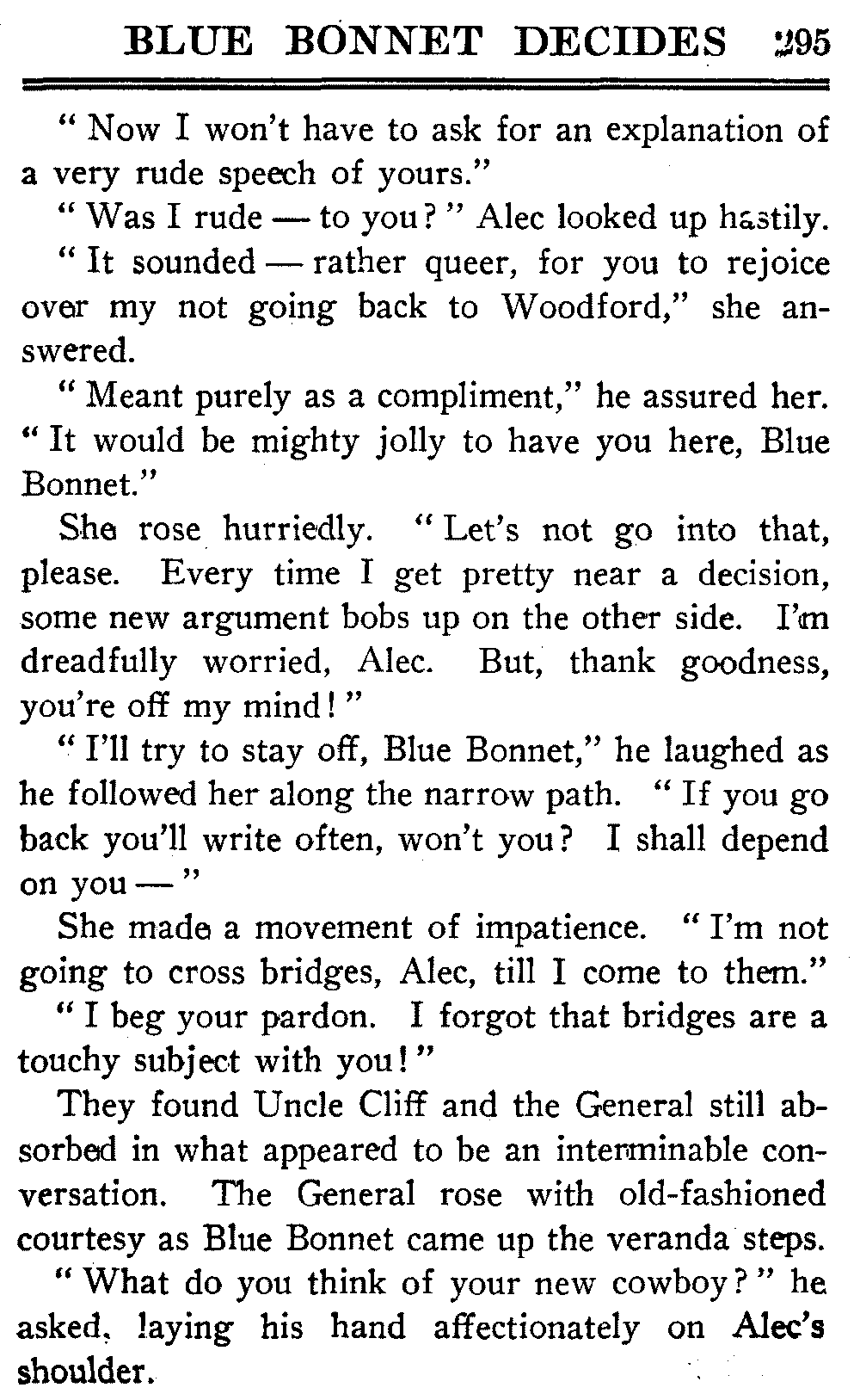 "Dear old Firefly! Won't I make it up to him though! Isn't it queer how many of my wishes have come true? It makes me feel almost—breathless. I no sooner got through wishing I could leave the ranch and go East and be with Grandmother—than I woke up in Woodford. And I wanted—thought I wanted—to be called Elizabeth. Blue Bonnet became Elizabeth!"