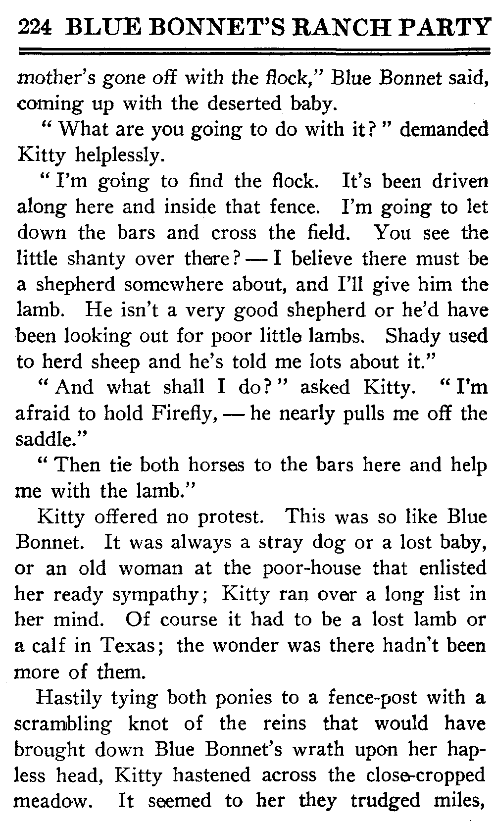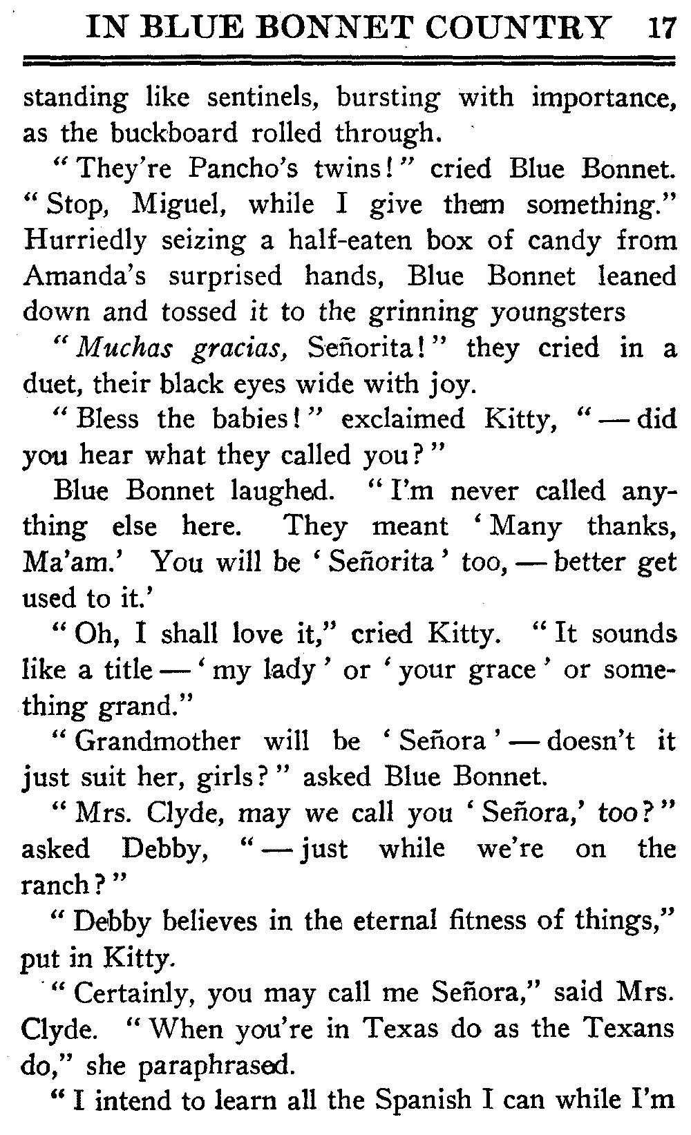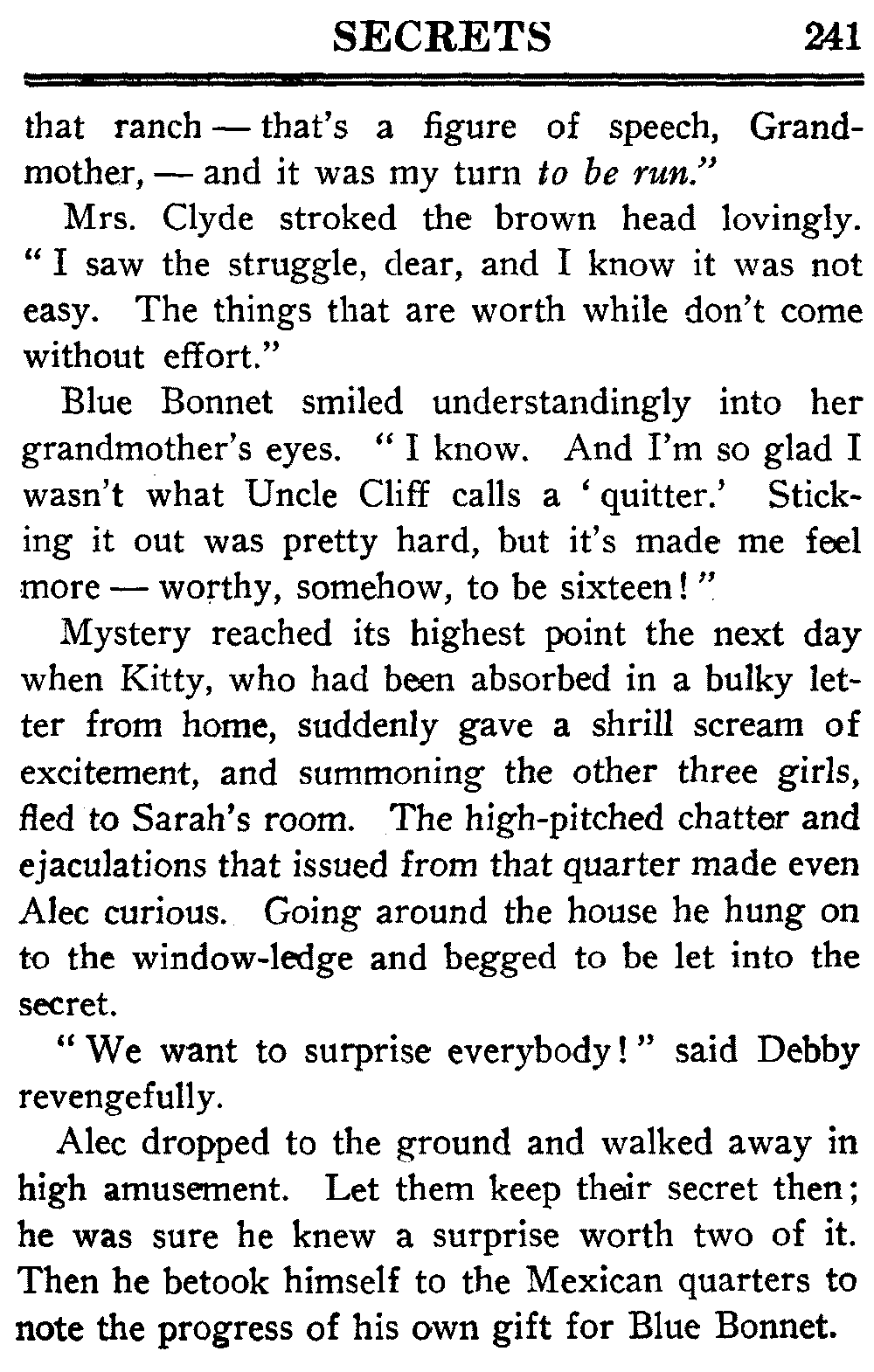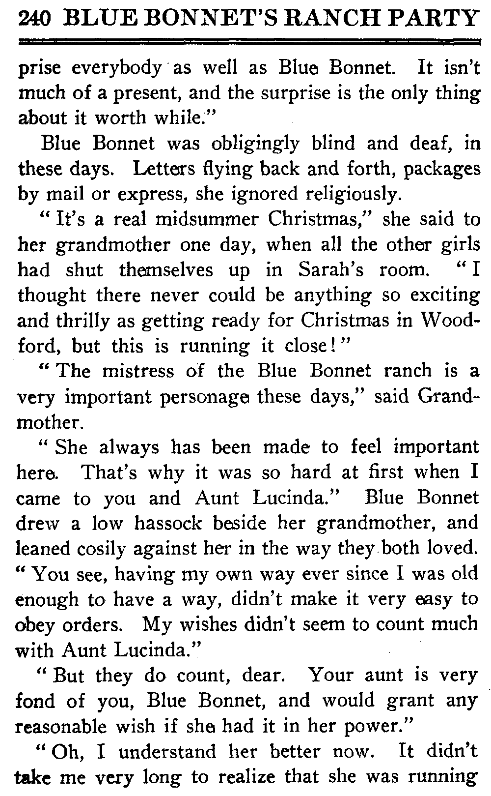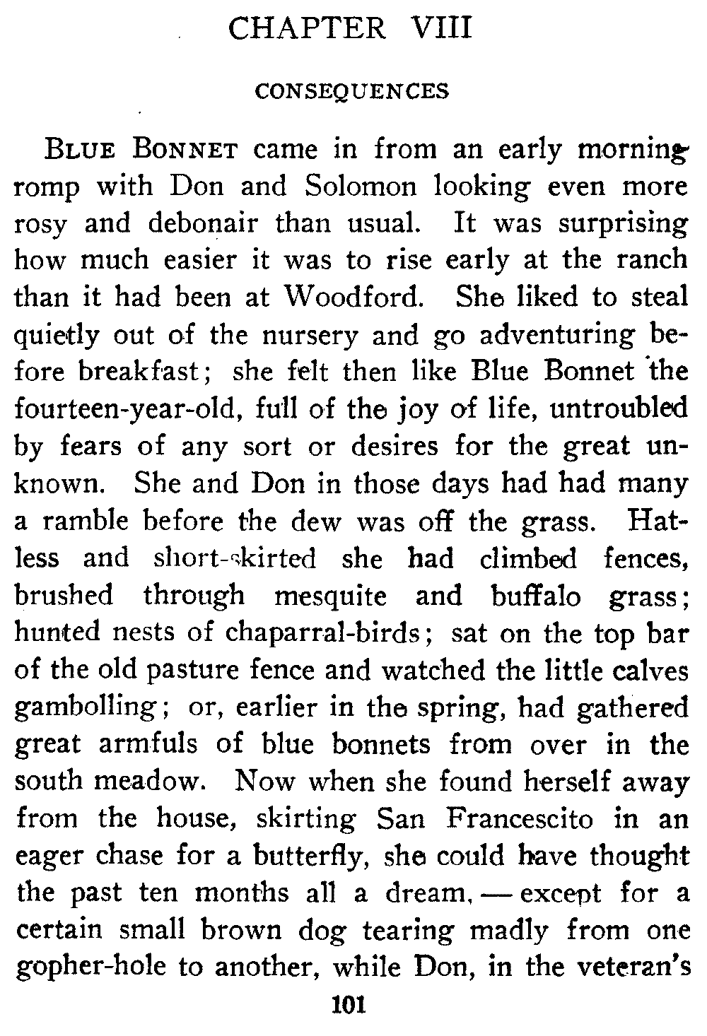 "Dear old Firefly! Won't I make it up to him though! Isn't it queer how many of my wishes have come true? It makes me feel almost—breathless. I no sooner got through wishing I could leave the ranch and go East and be with Grandmother—than I woke up in Woodford. And I wanted—thought I wanted—to be called Elizabeth. Blue Bonnet became Elizabeth!"