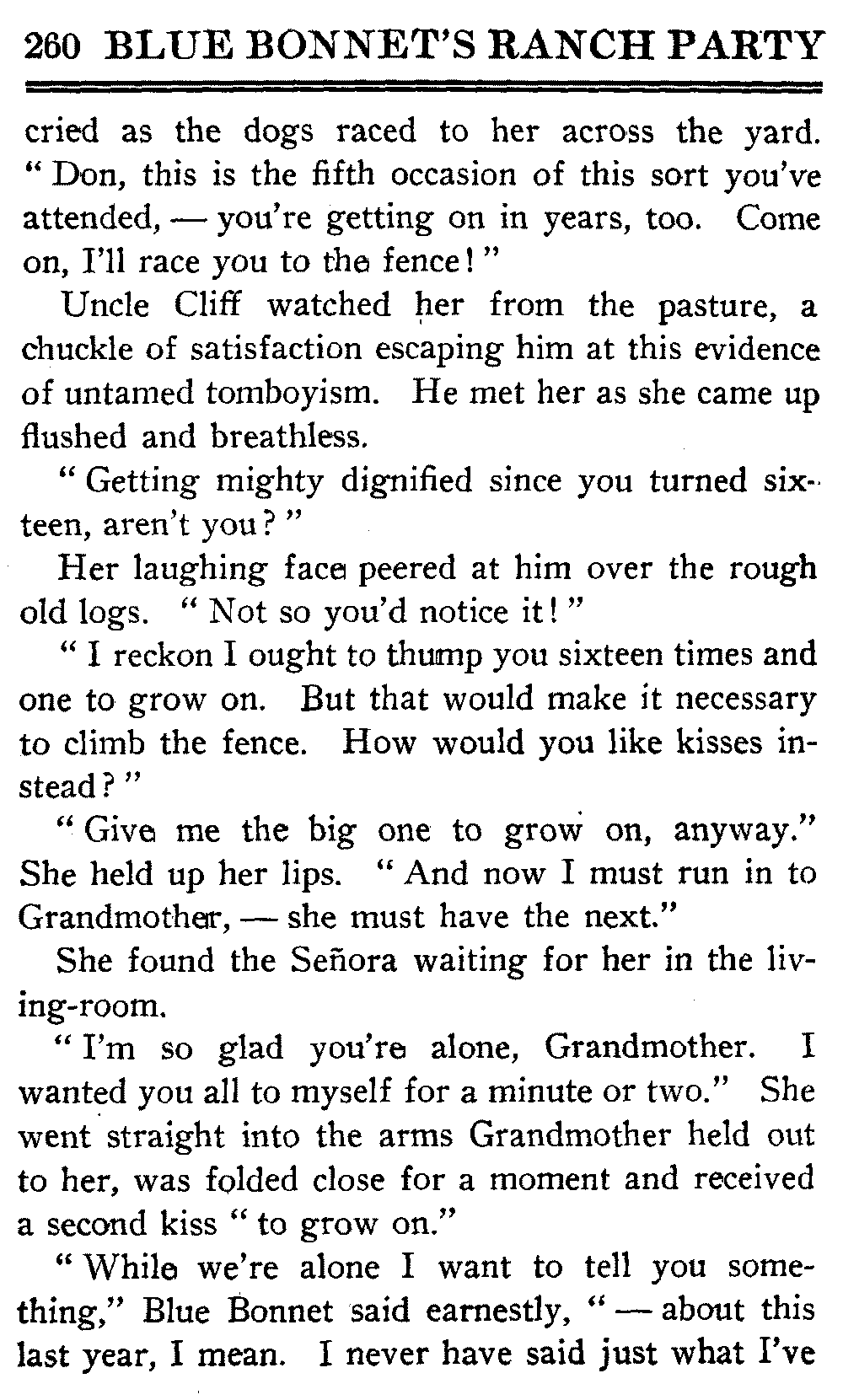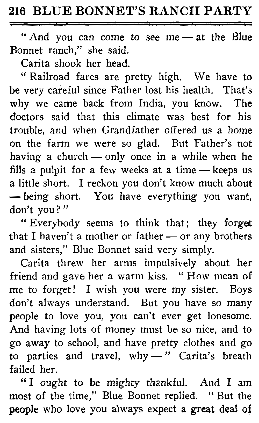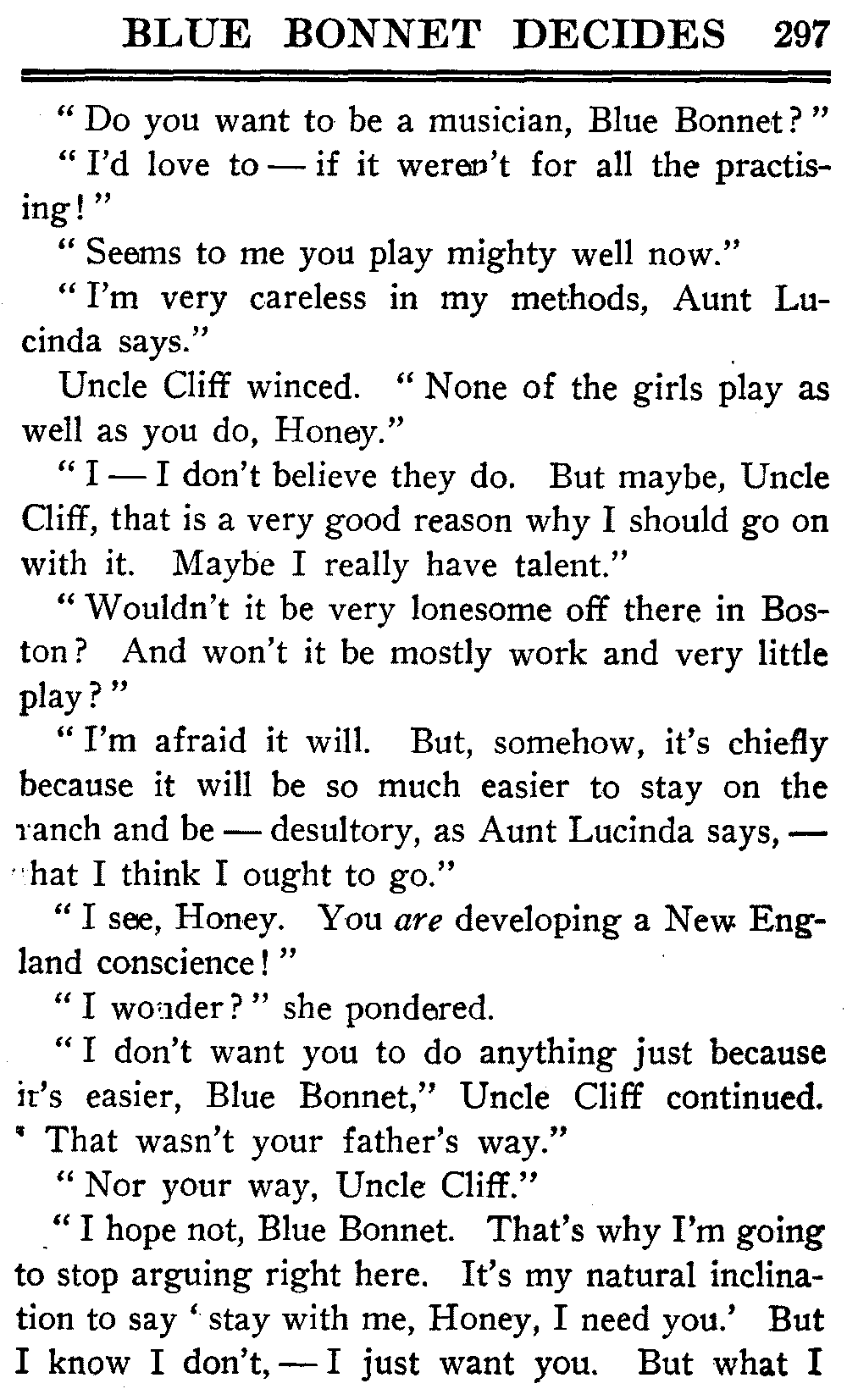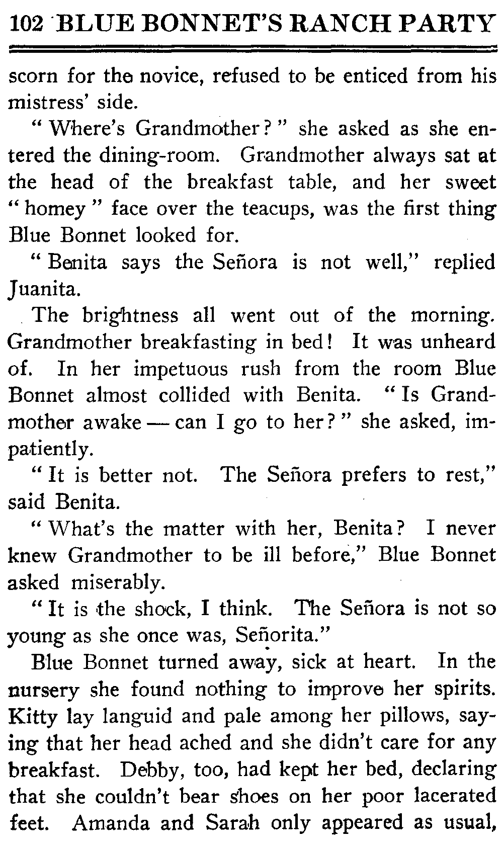 "Dear old Firefly! Won't I make it up to him though! Isn't it queer how many of my wishes have come true? It makes me feel almost—breathless. I no sooner got through wishing I could leave the ranch and go East and be with Grandmother—than I woke up in Woodford. And I wanted—thought I wanted—to be called Elizabeth. Blue Bonnet became Elizabeth!"