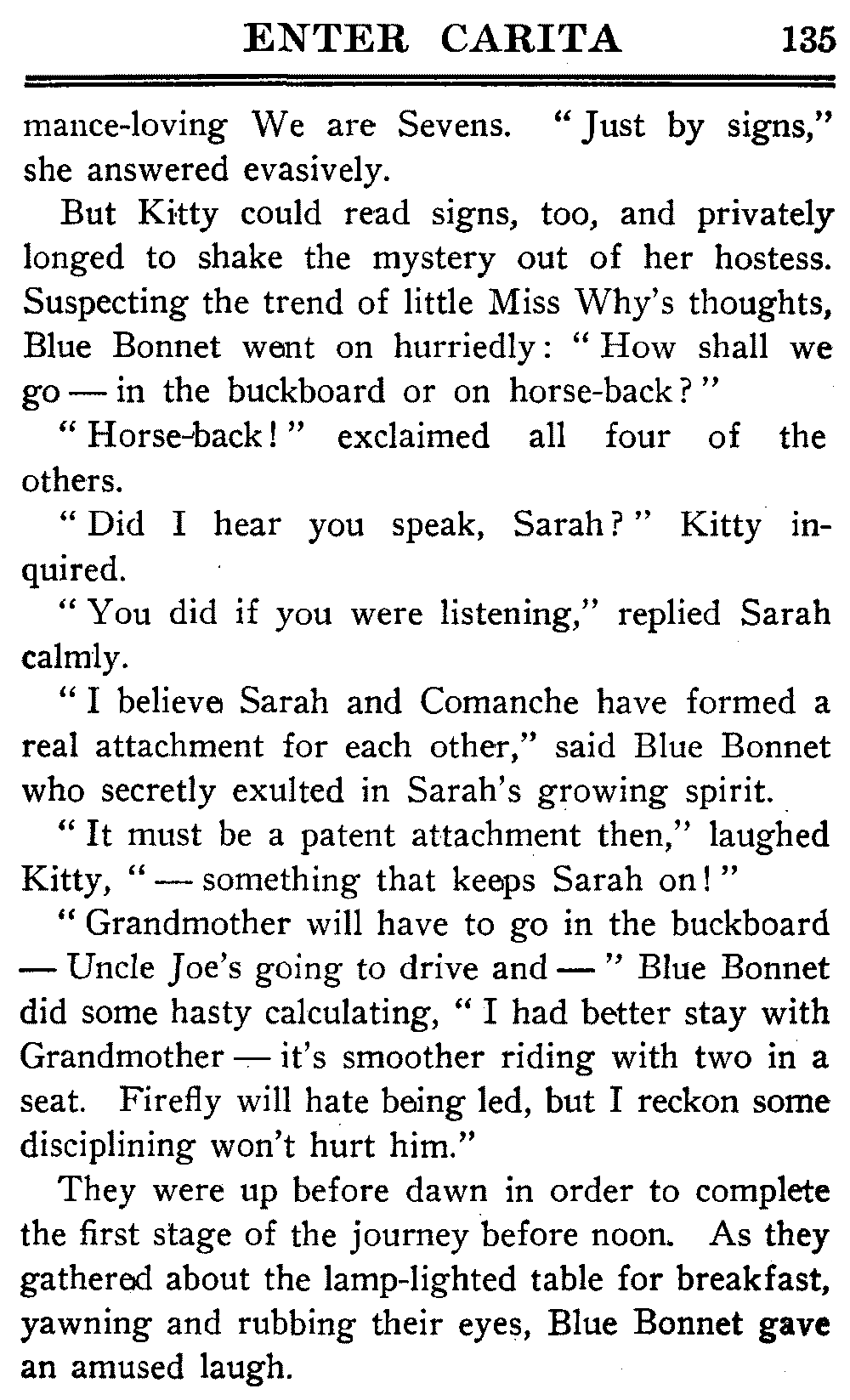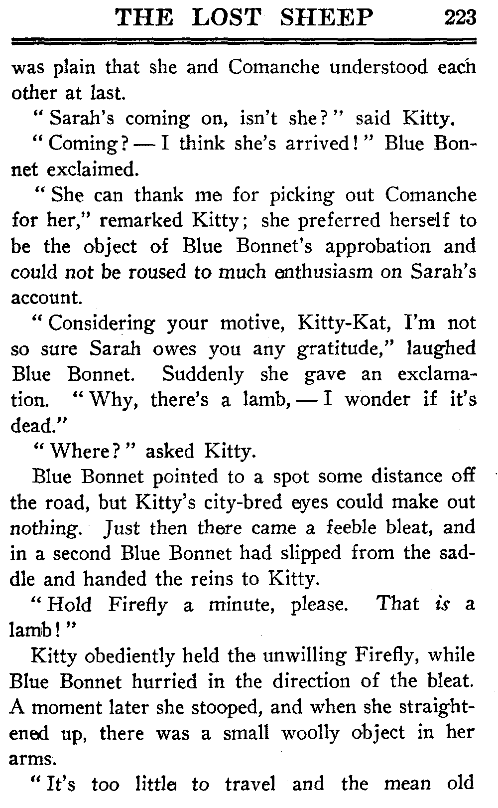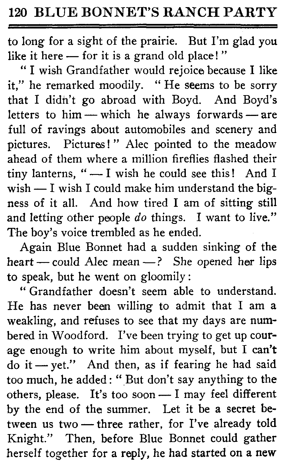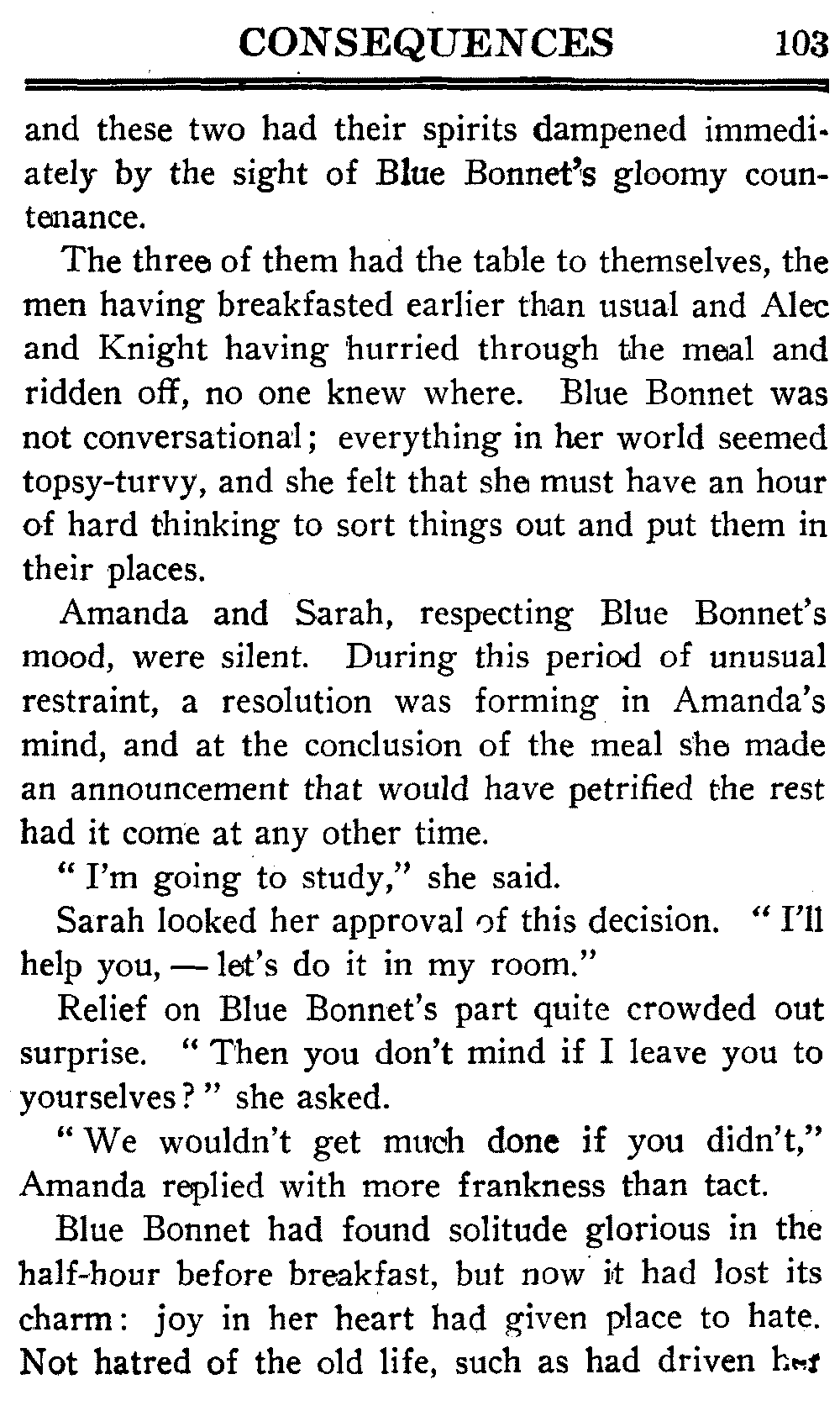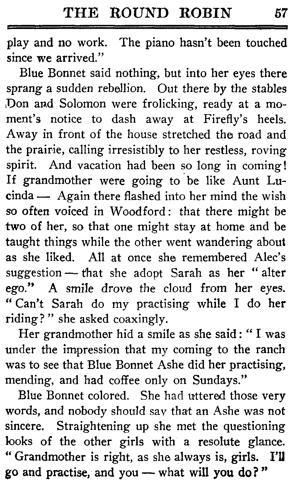 "Dear old Firefly! Won't I make it up to him though! Isn't it queer how many of my wishes have come true? It makes me feel almost—breathless. I no sooner got through wishing I could leave the ranch and go East and be with Grandmother—than I woke up in Woodford. And I wanted—thought I wanted—to be called Elizabeth. Blue Bonnet became Elizabeth!"