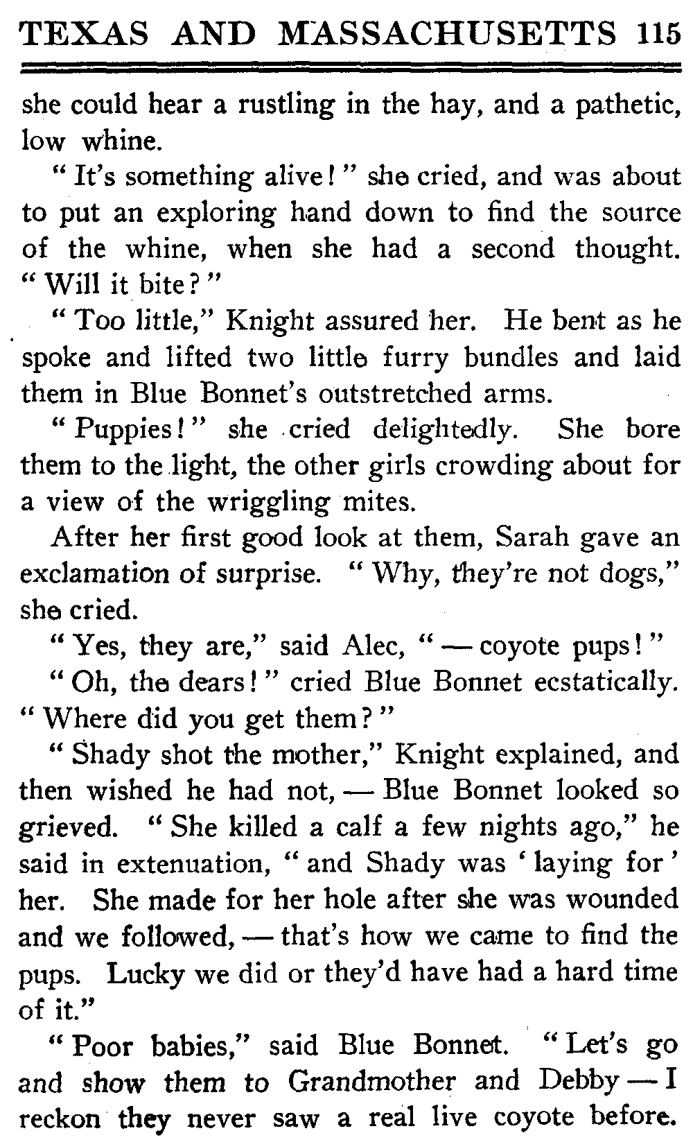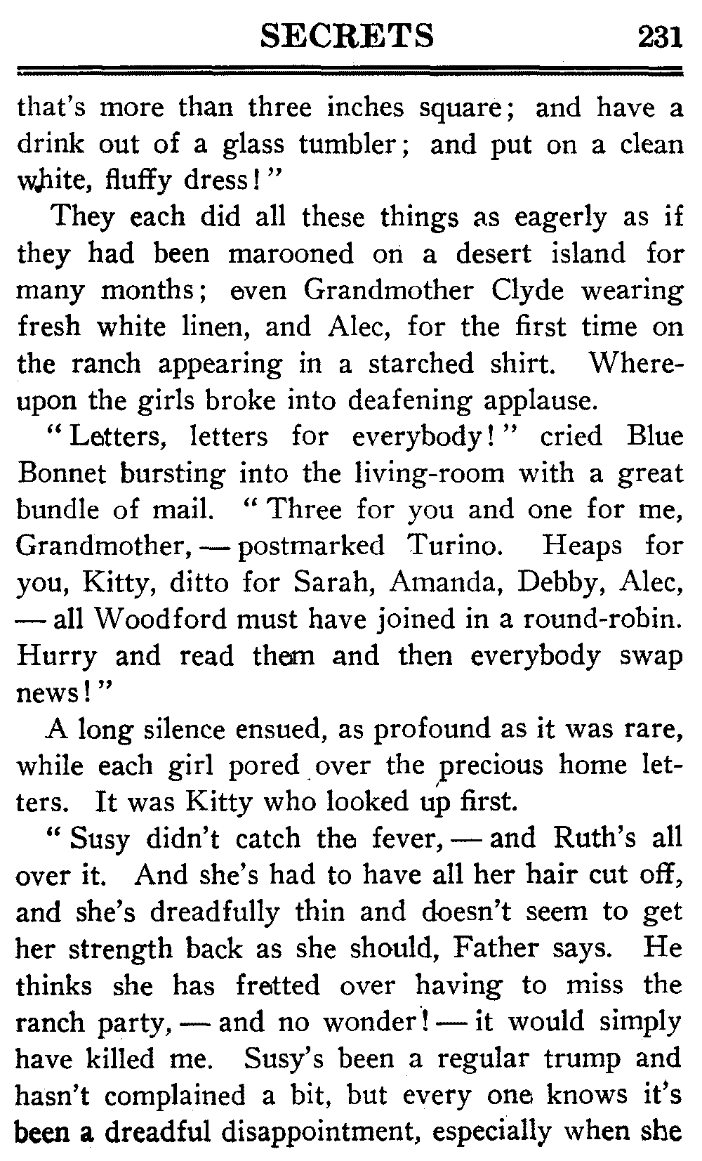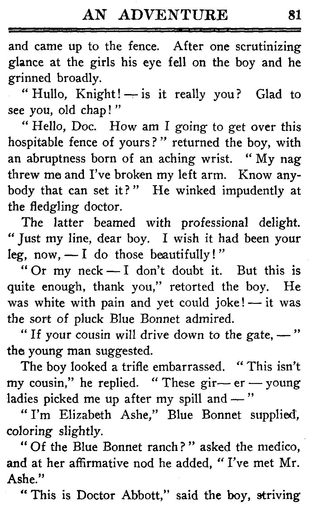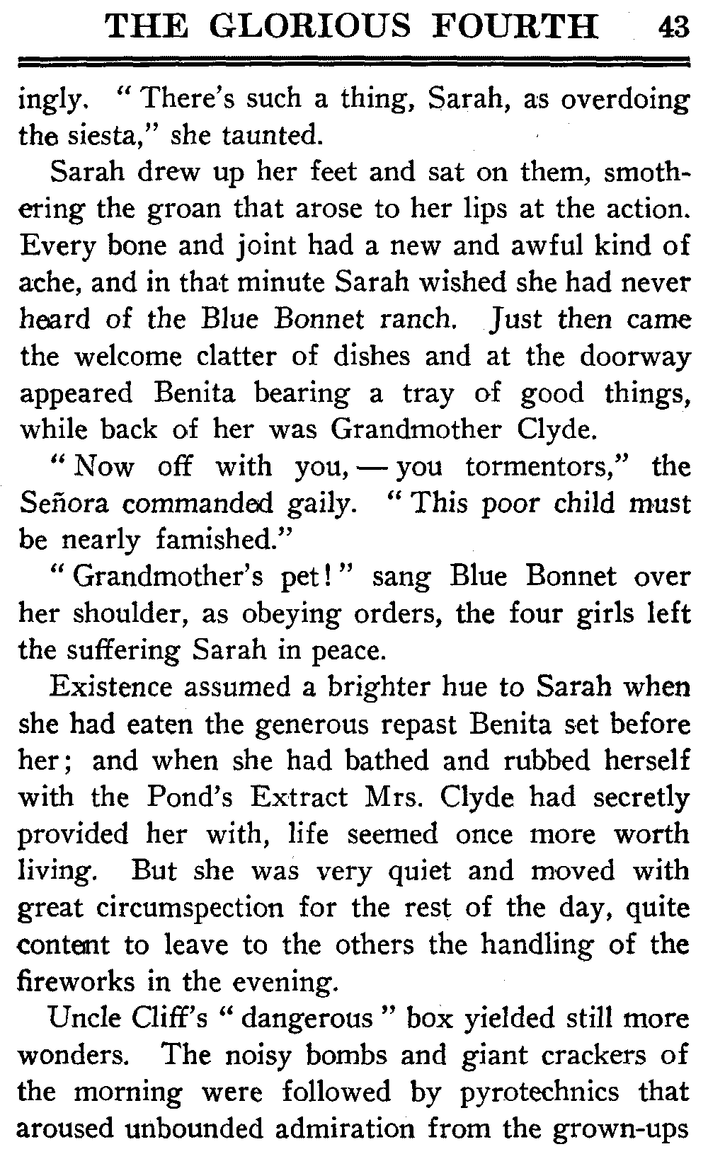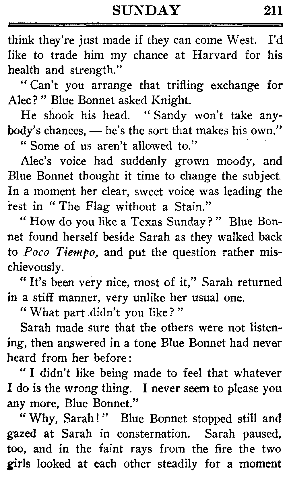 "Dear old Firefly! Won't I make it up to him though! Isn't it queer how many of my wishes have come true? It makes me feel almost—breathless. I no sooner got through wishing I could leave the ranch and go East and be with Grandmother—than I woke up in Woodford. And I wanted—thought I wanted—to be called Elizabeth. Blue Bonnet became Elizabeth!"